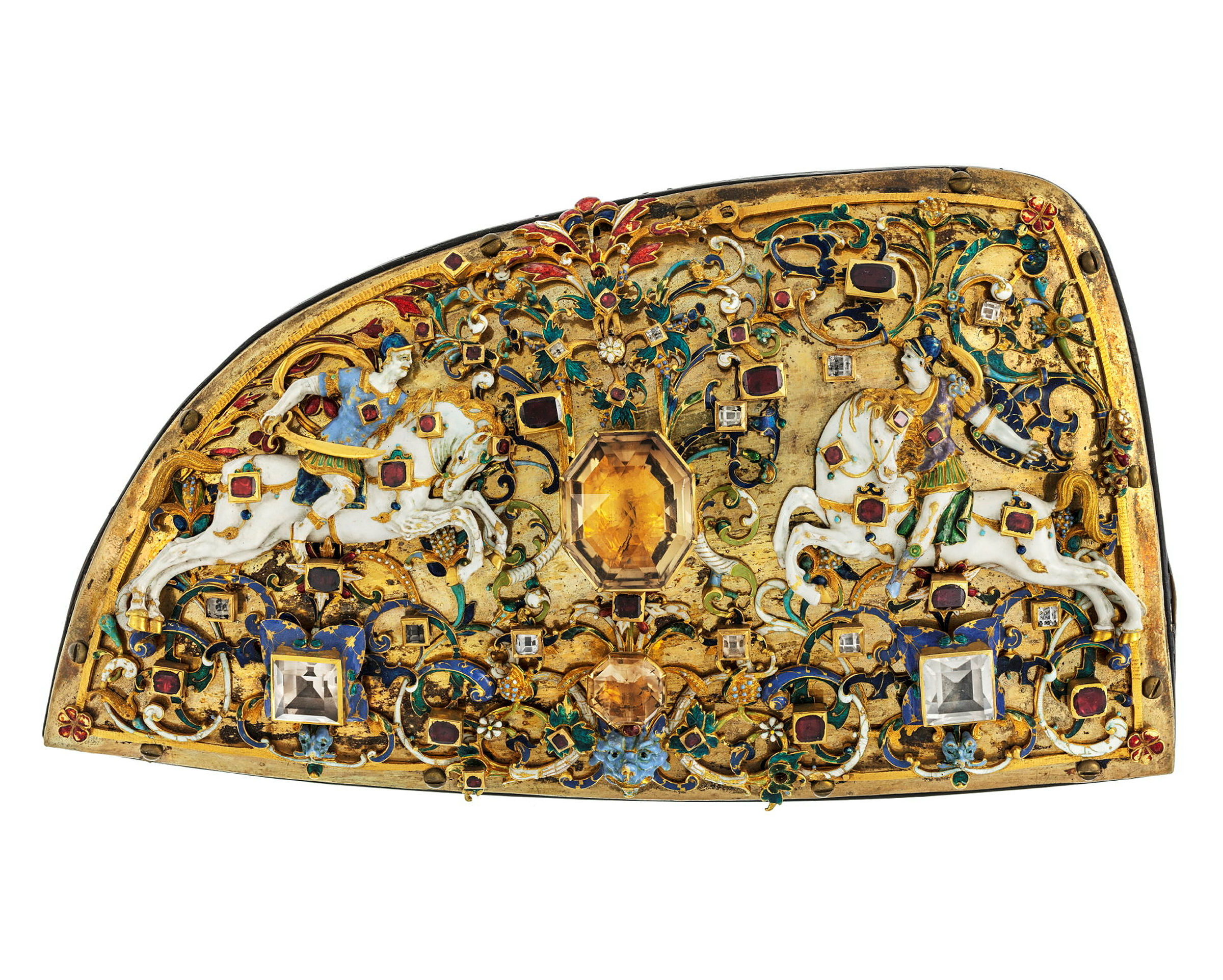 Halwa framdelen af en Sadel puta, rikt beatt med Taffelstenar, granater, Rubiner och en stor Topas, Samt för öfrigt Emailleradt Löfwärk af guld, Sjelfwa Plåten förgyld med 2ne Emaillerade Hästar med Ryttare.