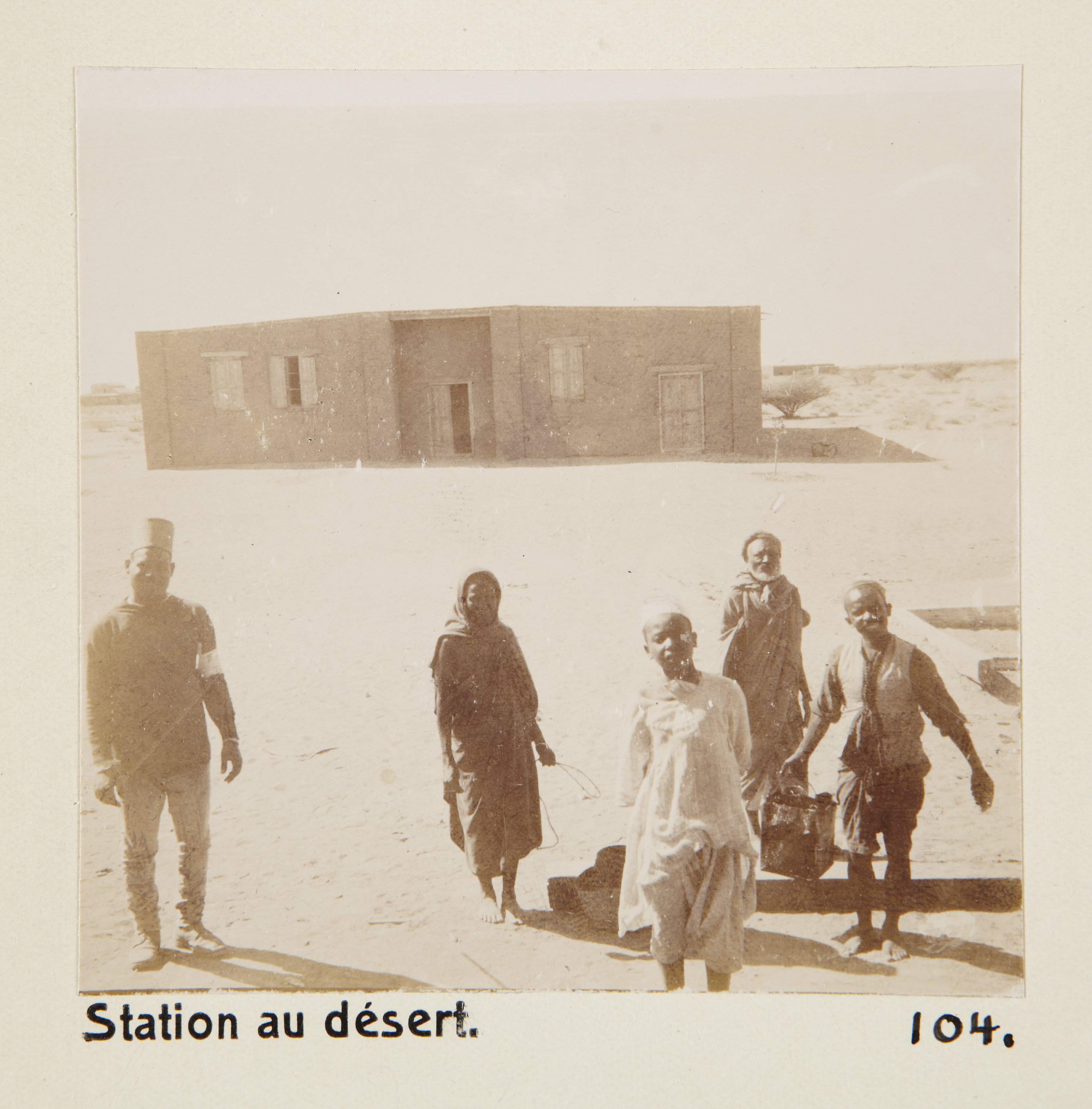 Tågstation i öknen. Sudan. Text på fotografiet: Station au désert Fotografierna LXVI:M.01.- 201. kommer från resan till Egypten och Sudan som Wilhelmina och Walther von Hallwyl gjorde vintern 1900-1901. De lämnade Sverige den 5 november 1900 och fortsatte från Egypten till Palestina den 28 mars 1901. Med på resan var döttrarna Ellen med maken Henric de Maré och Irma med maken Wilhelm von Geijer. Wilhelminas sällskapsdam, fröken Ida Uhse reste också med. Under en del av resan anslöt sig ledamoten av Internationella domstolen i Kairo, assessorn Otto Conrad Waldemar Cedercrantz med makan Anna Elisabeth. Vid resan uppför Nilen hade Walther von Hallwyl hyrt ångfartyget Columbia med besättning. Båtresan startade i Kairo 27 december 1900, gick ända till Wadi Halfa varifrån man reste vidare med tåg till Khartum och tillbaka till Wadi Halfa. Båten vände åter i riktning mot Kairo, men det verkar som att sällskapet tog tåg sista biten, från Luxor. Henric och Ellen de Maré samt fru Cedercrantz lämnade båten redan då de passerade Luxor första gången. Resten av sällskapet återvände till Kairo den 1 mars. Fotografierna LXVI:M.01.-120. togs av resenärerna själva, de största av Ellen de Maré, de mellersta av Wilhelmina von Hallwyl och de minsta av Wilhelm von Geijer. Resten köptes av professionella fotografer i Kairo, de flesta från Studio Photogr. Artistique G. Lekegian & Cie. Alla uppgifter kommer från Ida Uhses reseanteckningar.