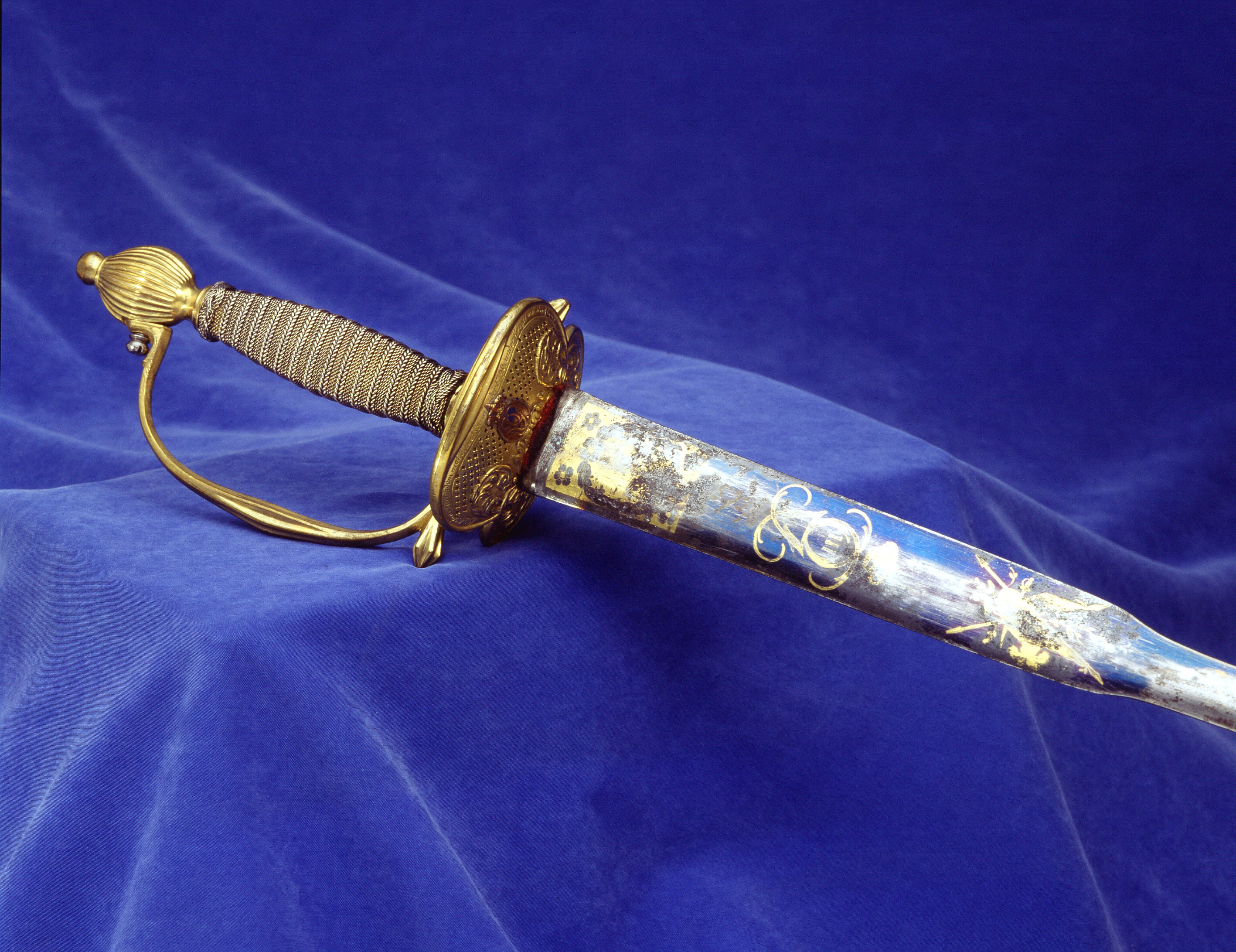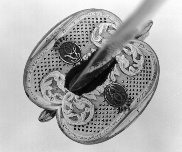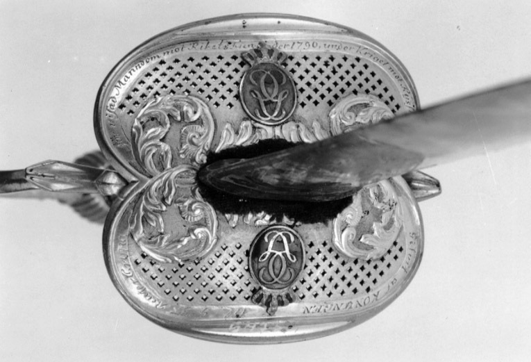 Fäste av förgylld mässing av efterkarolinsk typ. Fastlödda på parerplåtarna ut- och insida på båda sidor om krysset en oval blåemaljerad krönt kopparplatta med spegelmonogram av G (Gustav III:s namnchiffer). Utmed kanterna på parerplåtarnas utsidor inskription i skrivstil: " Gifvit af KONUNGEN til G. F. Reutercrona för visad Manndom mot Rikets fiender 1790, under Kriget mot Ryssland ". Kavel lindad med förgylld silvertråd. Klinga rak, tvåeggad flackslipad med breddad starka del s k colichemardklinga. Starka delen med etsad och förgylld ornering mot blånerad botten. På båda sidor av basen förgyllt fält vari blånerad bladkrans. Härovanför Gustav III:s namnchiffer, dubbelt G omslutande ordningssiffran III och krönt med kunglig krona. Ovanför en trofégrupp och en liten bladranka.