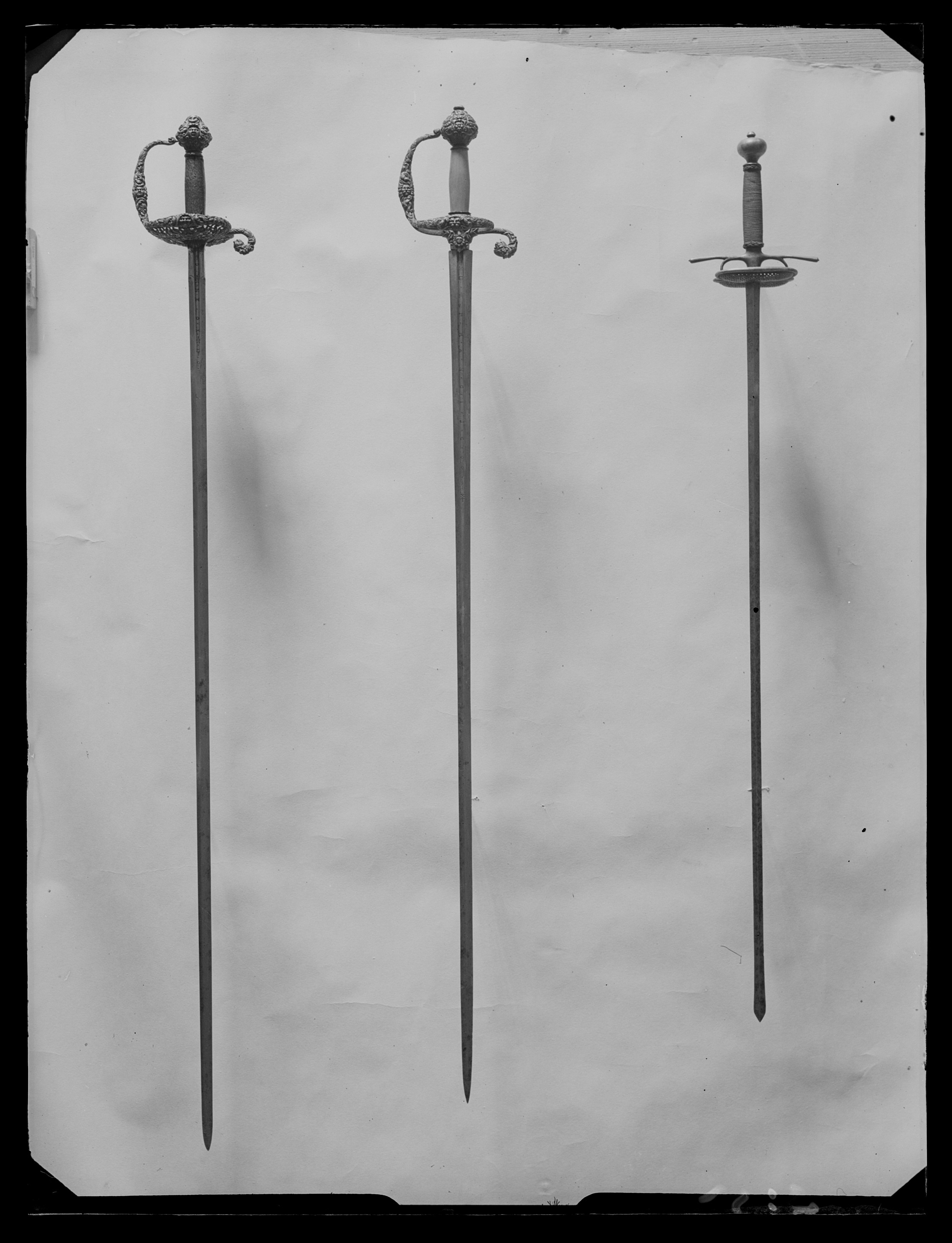 Värja tillverkad i Tyskland runt 1600-talets mitt. Jämför med inventarienummer 7231. Värjan har ett stålfäste med en helt yttäckande, snidad reliefornering i trä föreställande maskaroner, bladornament och räffelmönster. Det finns en sidobygel och en rundat, nedåtböjd, bakre parerstång. Kavellindning saknas. Klingan är sexsidig och tvåeggad med hålkäl utmed den starka delens båda sidor, vari punsat: "FRANCISCO". Enligt 1710 års inventarium p. 68, rum III: "1D:o på Samma Maneer (1Stuckat med muhlfäste af Jern utarbetat, balja till)". Enligt 1651 års Wolgastinventarium: "No 1/Ein Hollandischer Seilen degen, mit gefriebener arbeit Schwarz, Silbern Handtgriff."