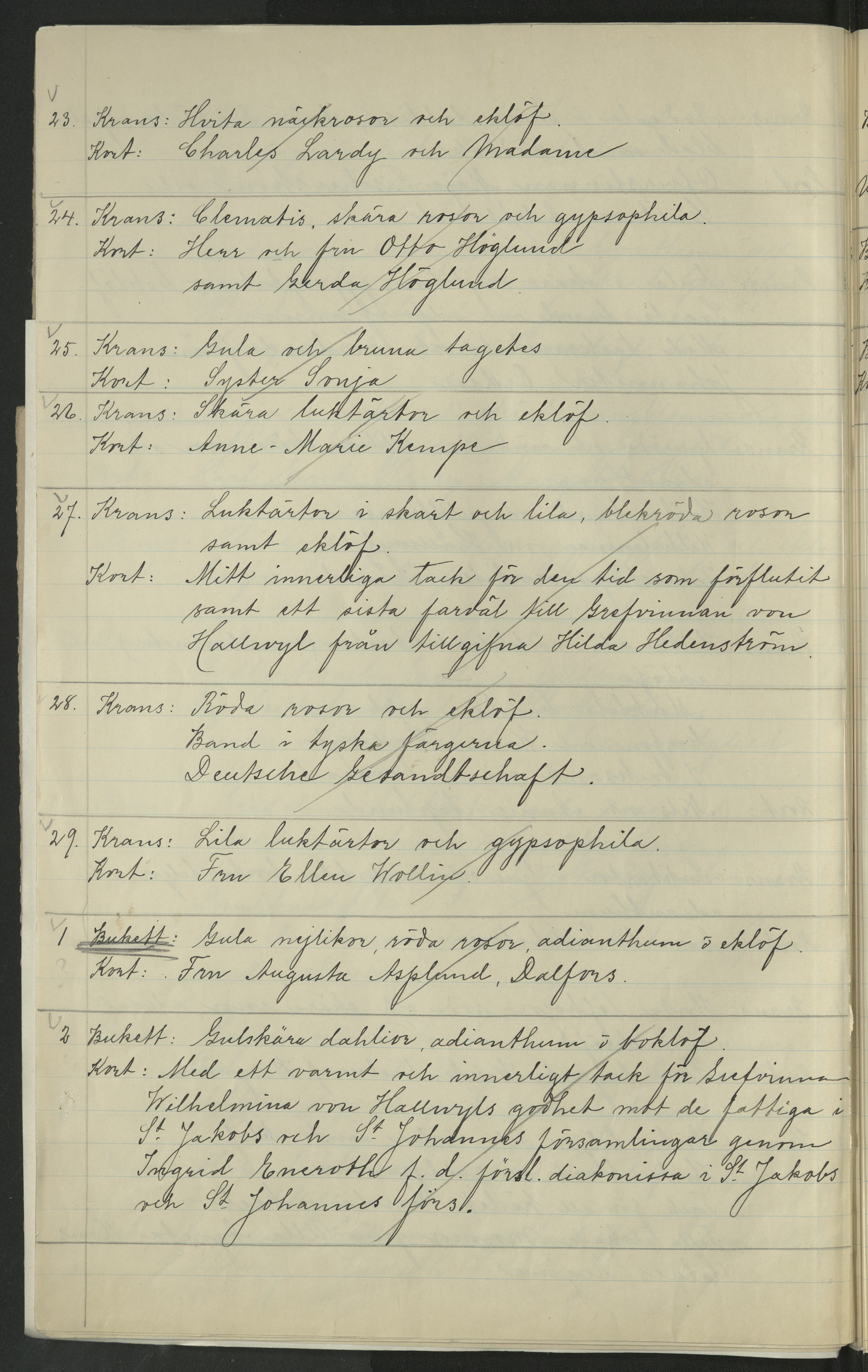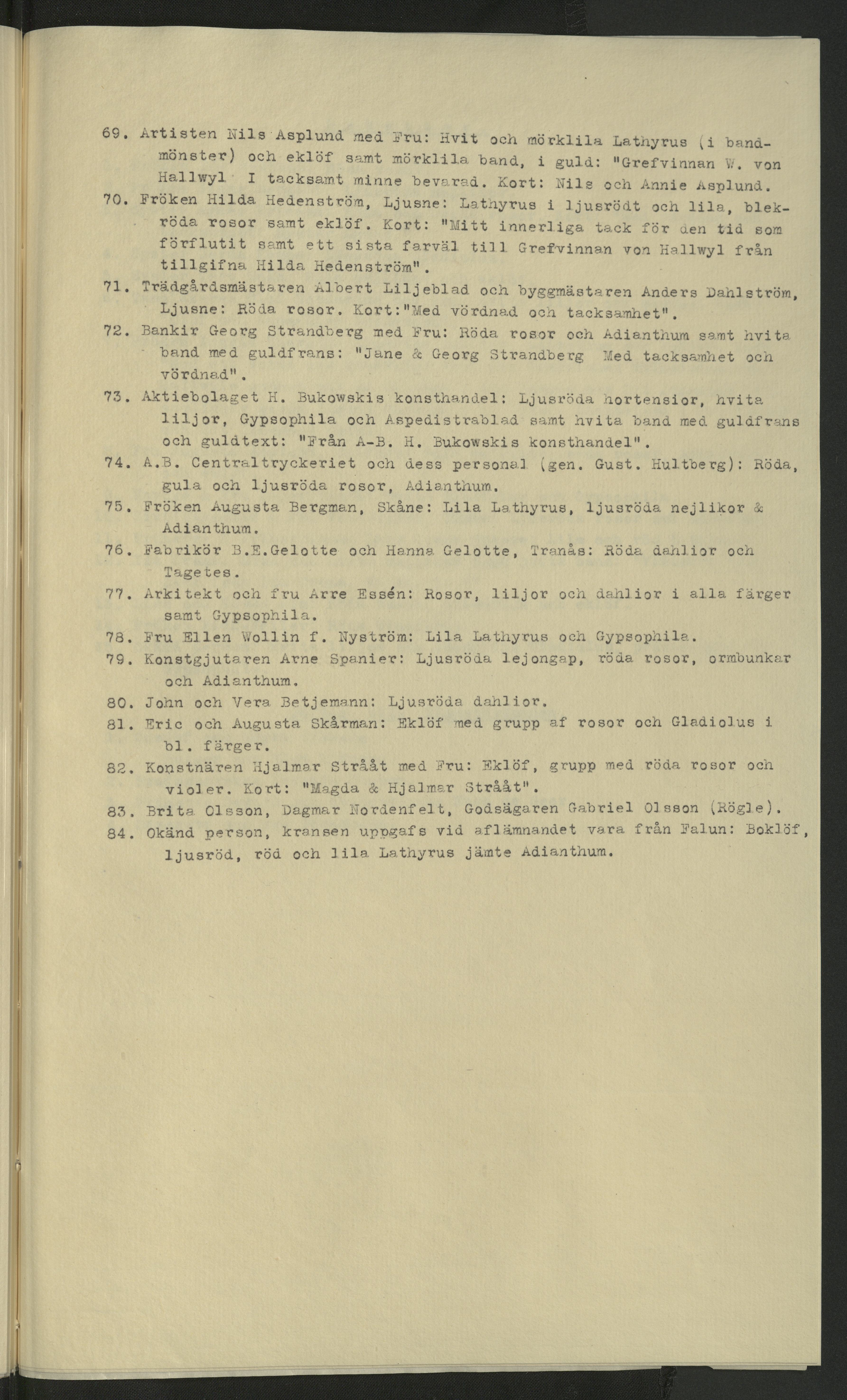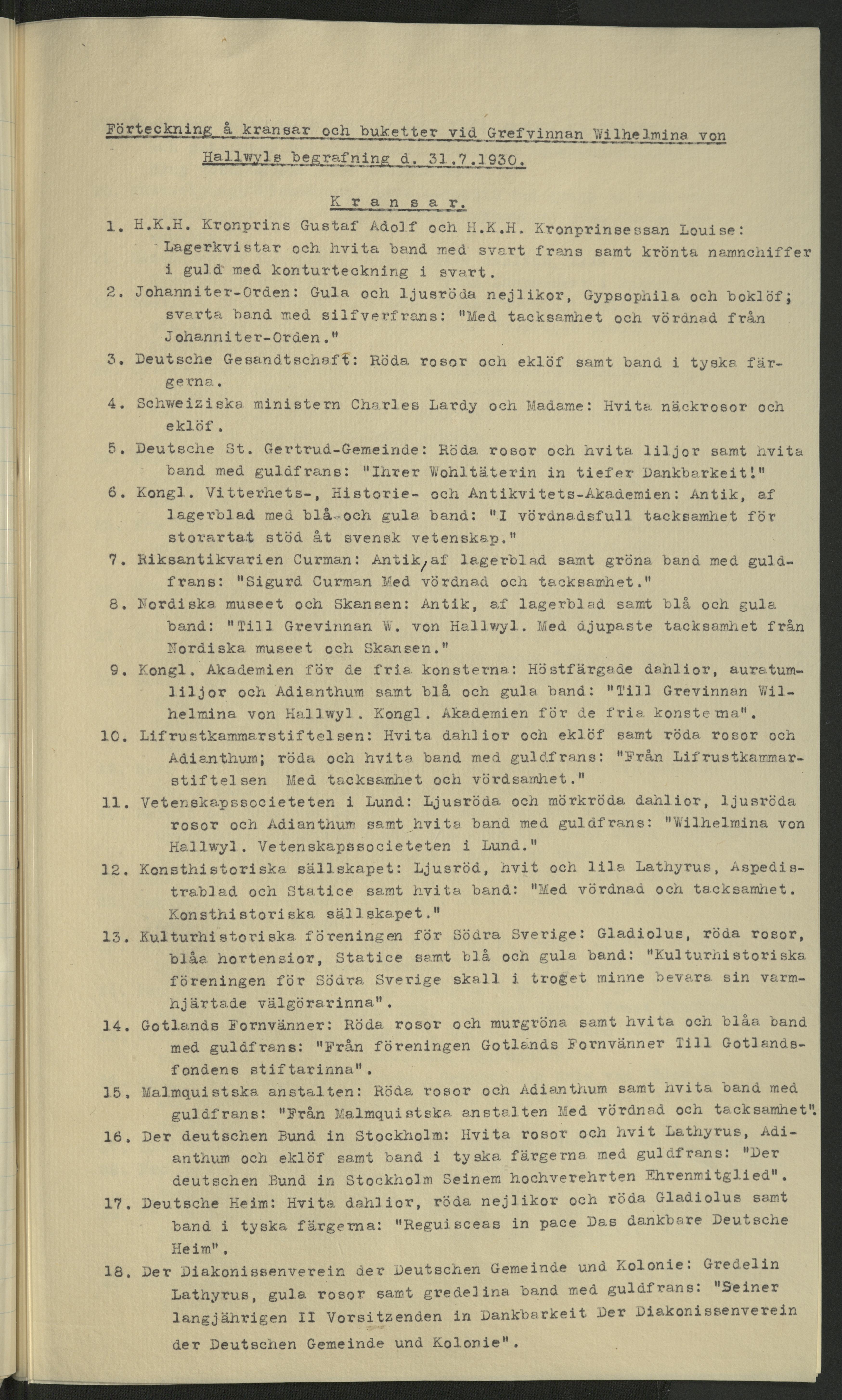 Förteckning över de som skickat kransar (eller bidrag till Blomsterfonden) samt beskrivning över blommorna. I samband med Wilhelmina von Hallwyls begravning