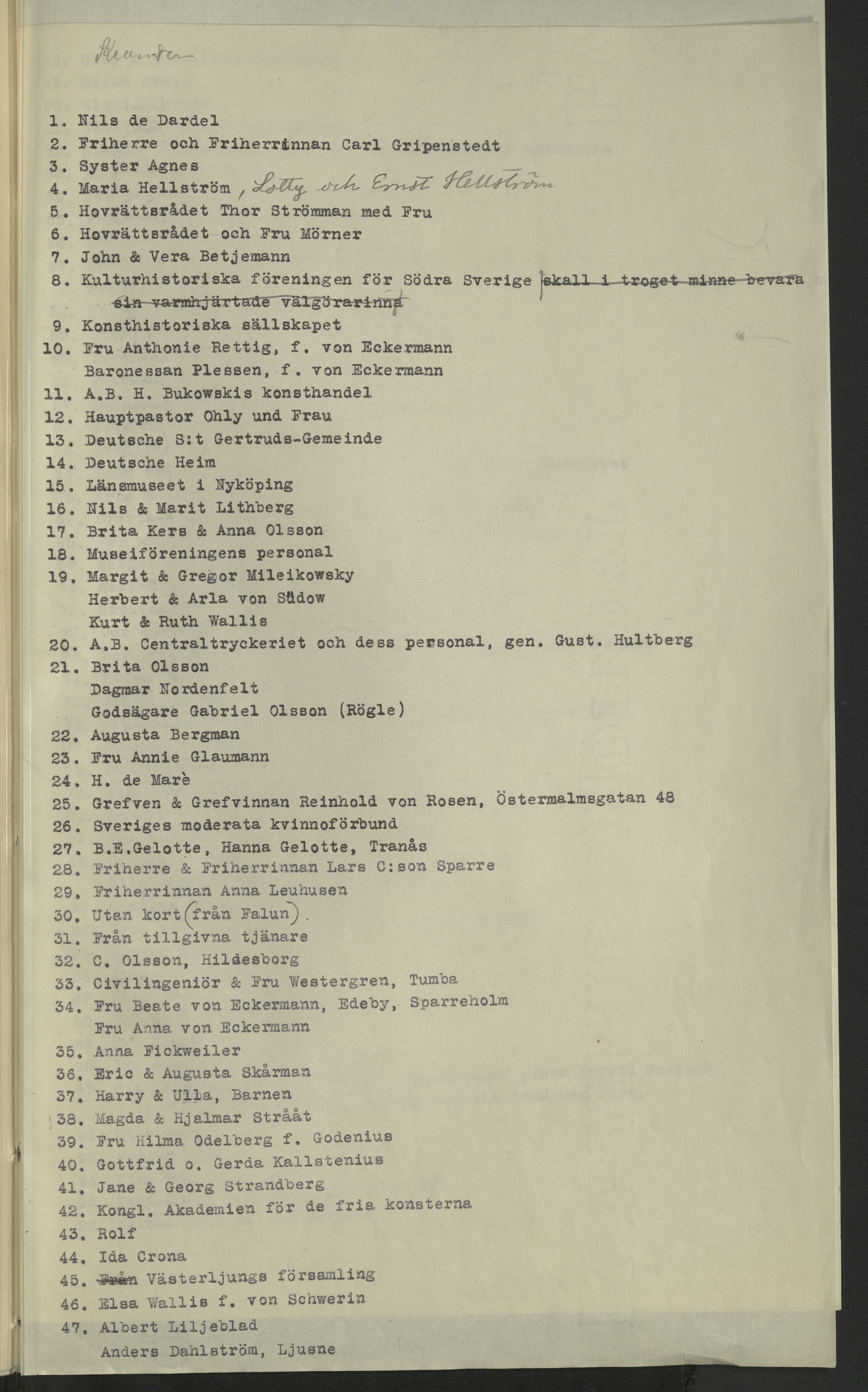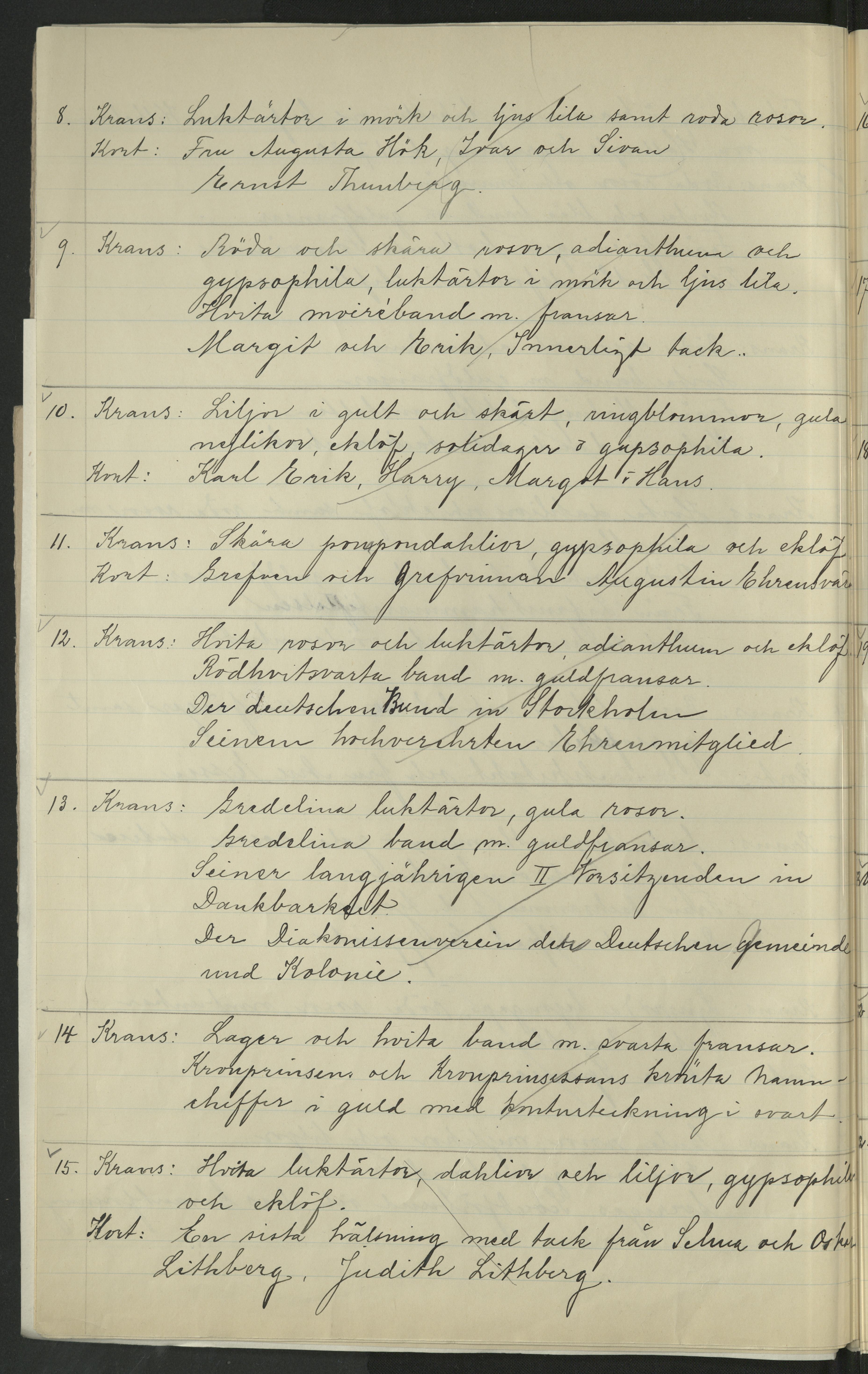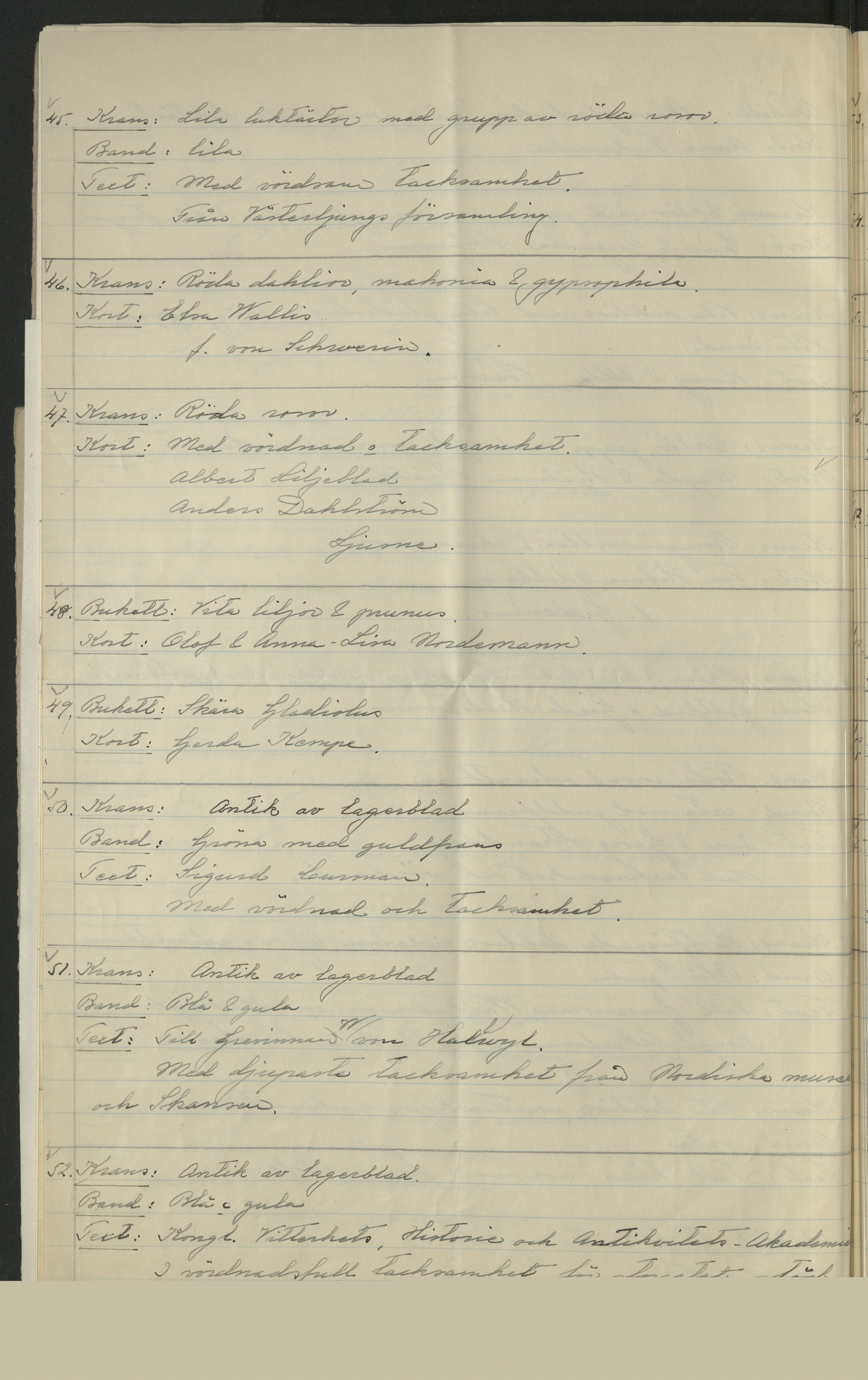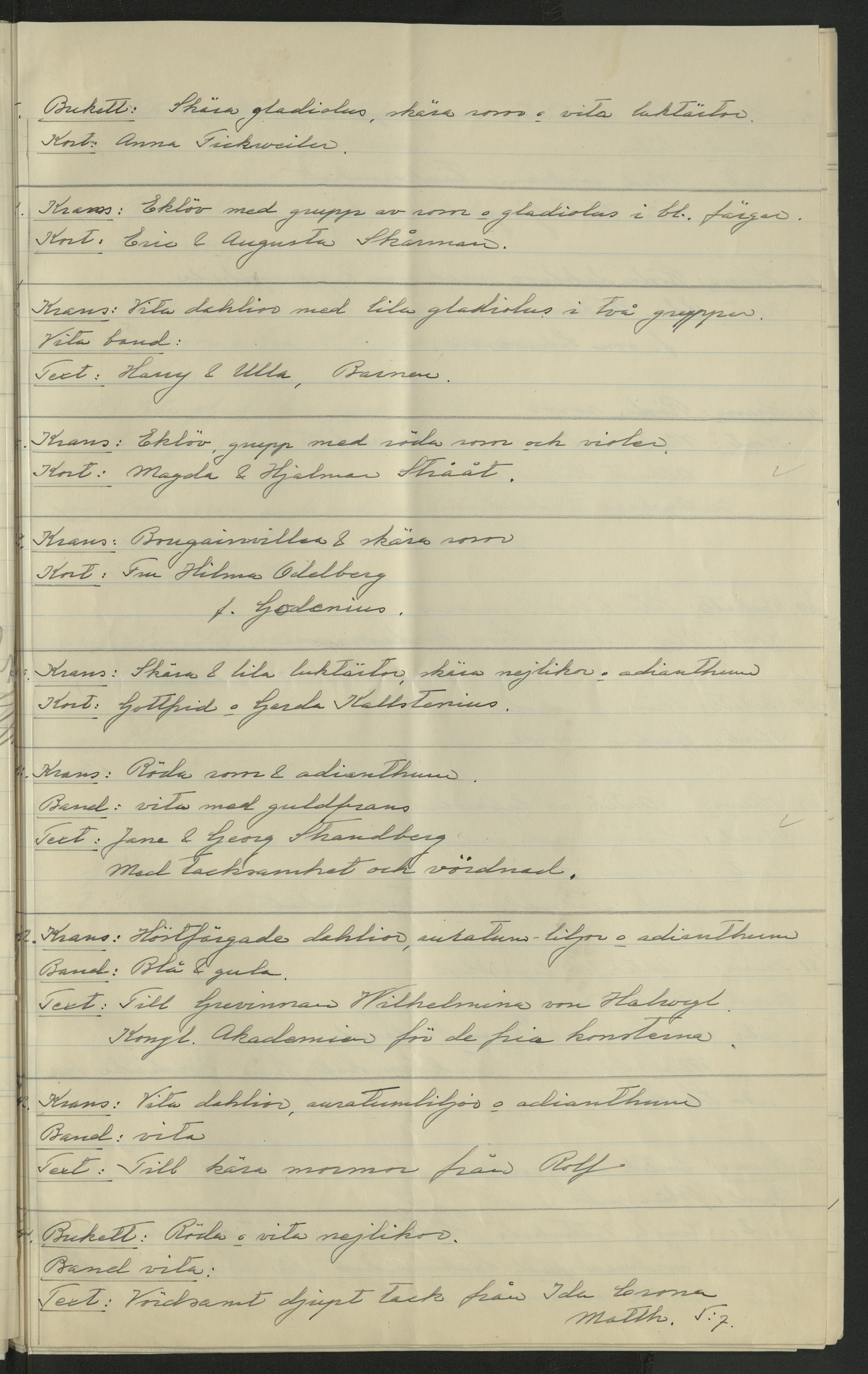 Förteckning över de som skickat kransar (eller bidrag till Blomsterfonden) samt beskrivning över blommorna. I samband med Wilhelmina von Hallwyls begravning
