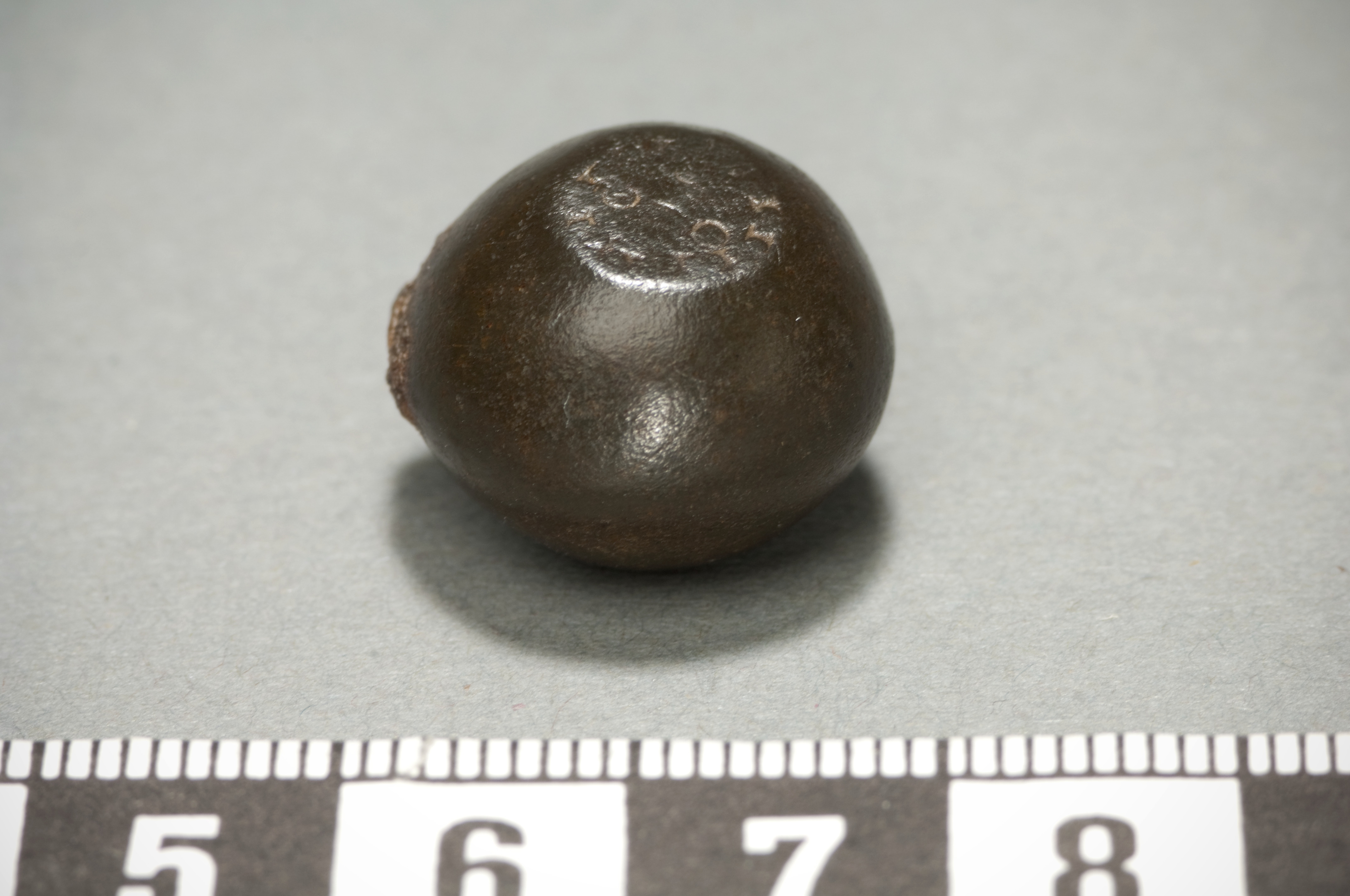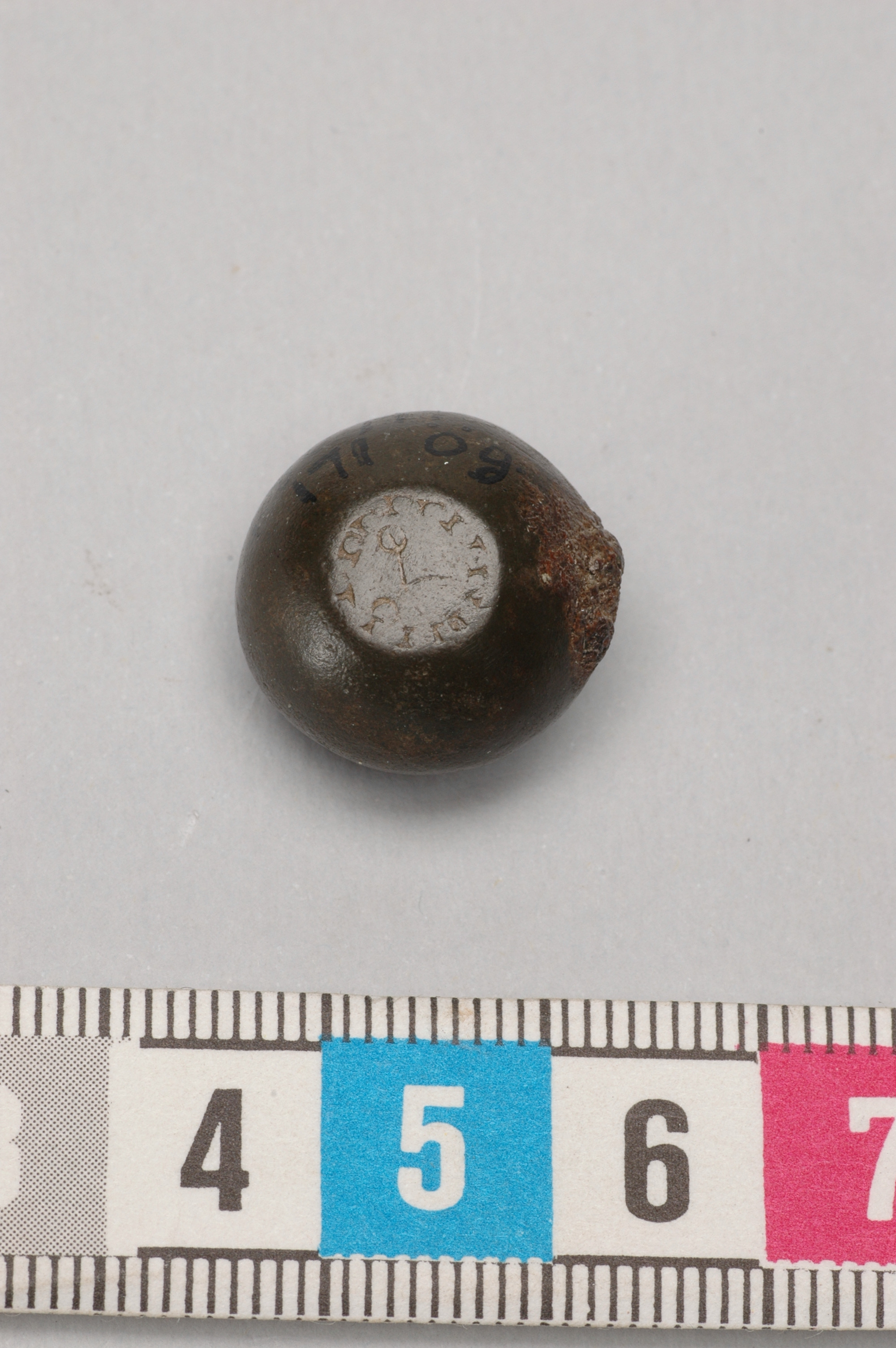 Vikt av järn och kopparlegering. Oregelbunden kulform. Tillplattad i två sidor, den ena med instämplat tecken.
