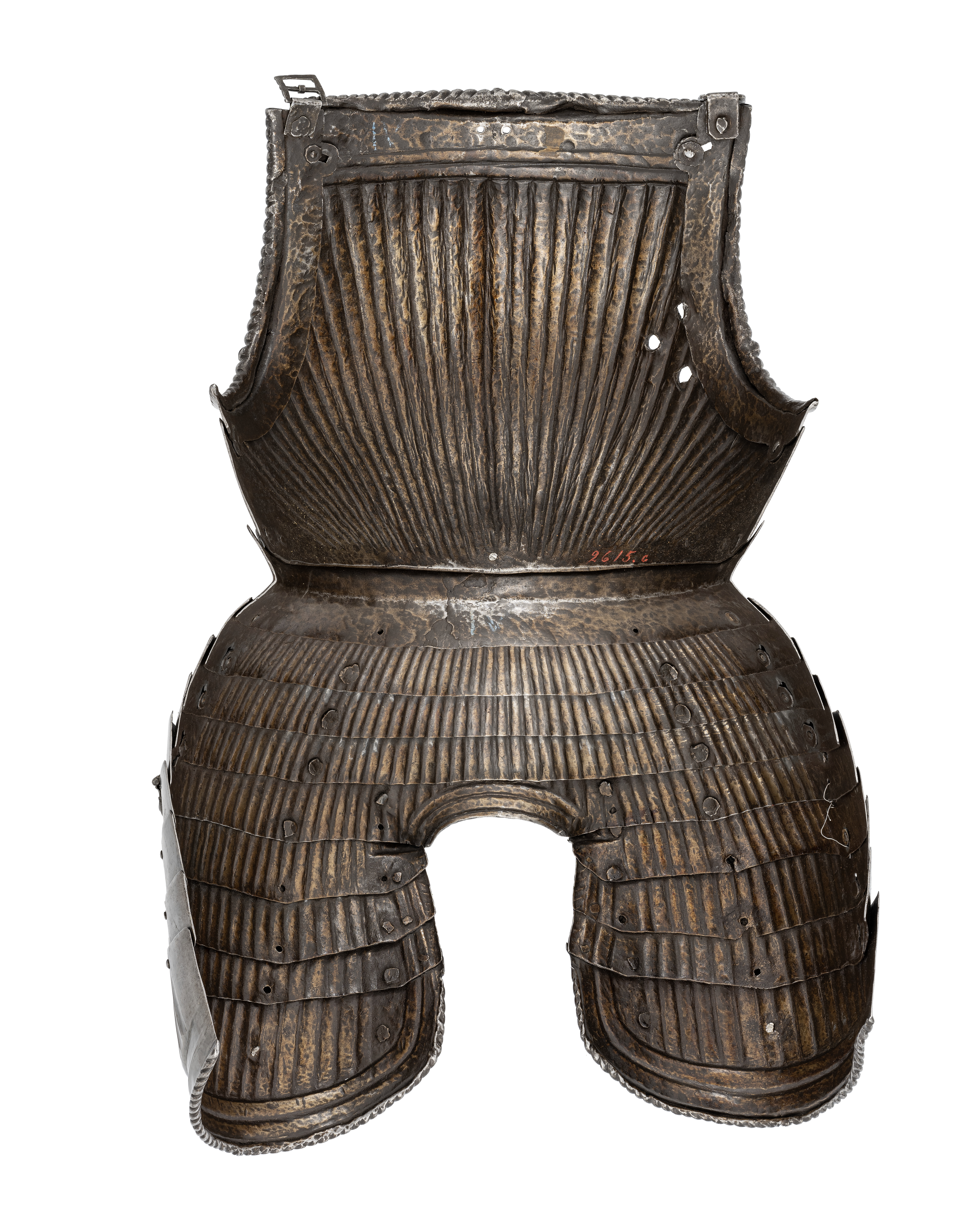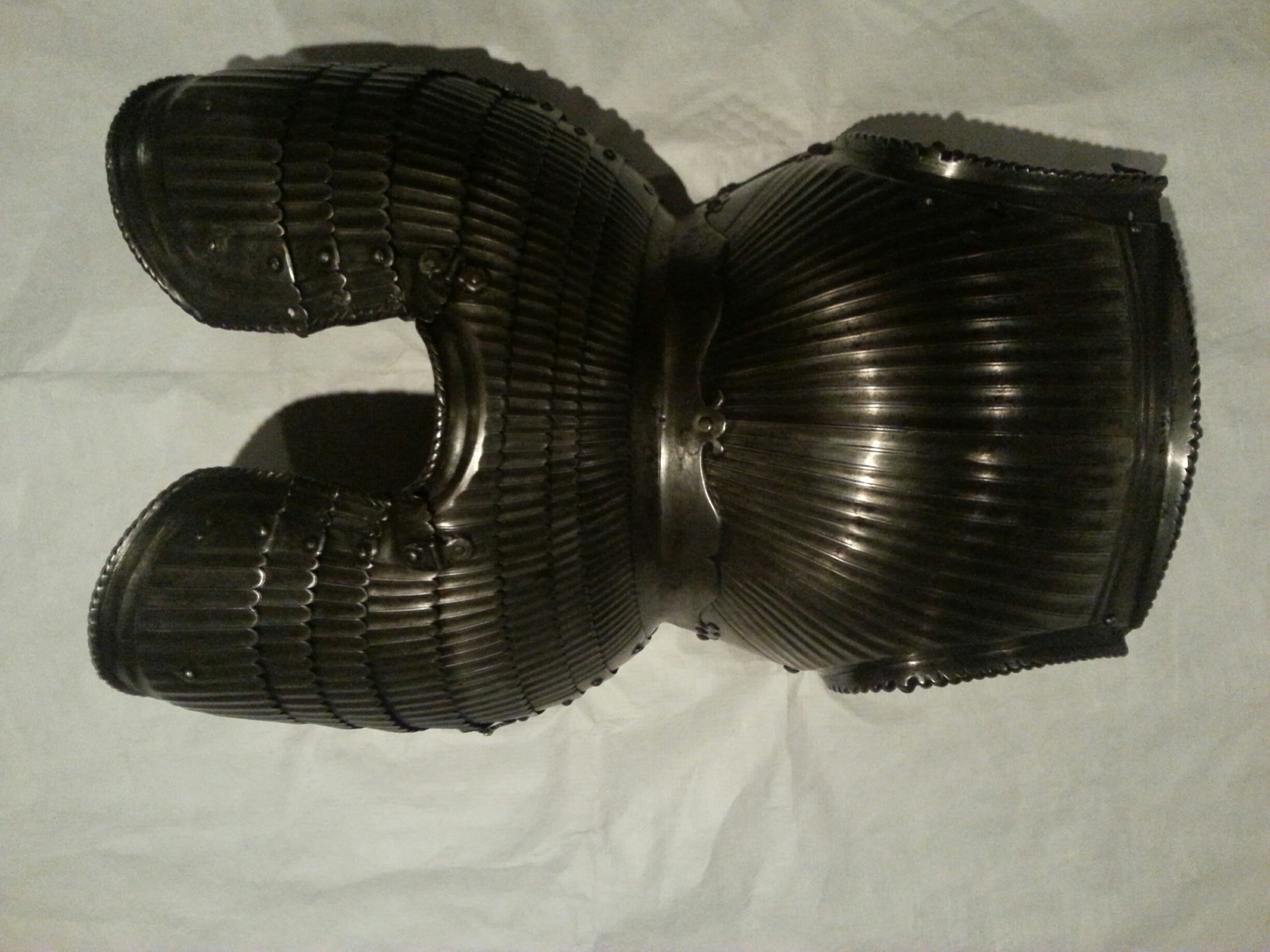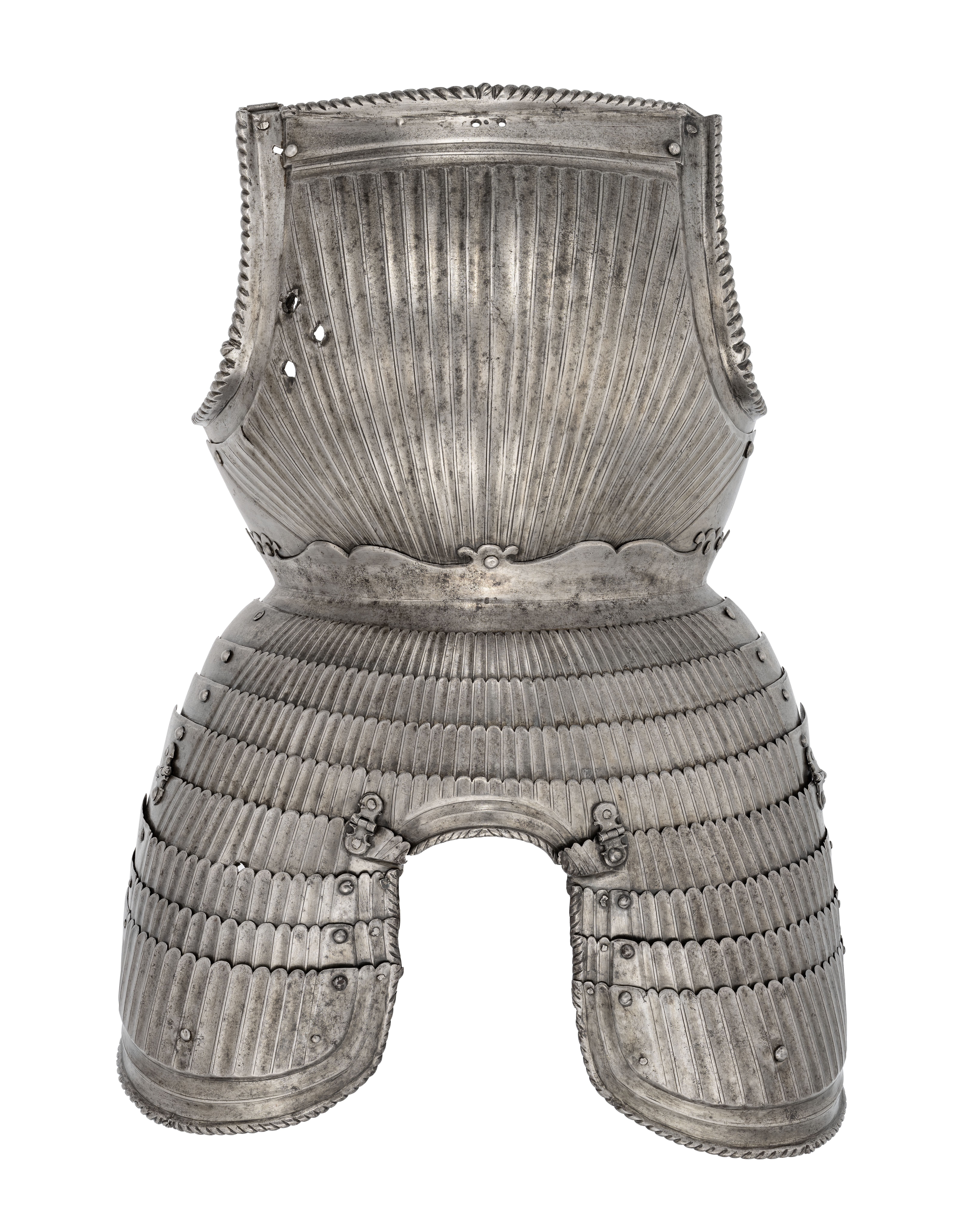 Bröstharnesk i stål av maximiliantyp; bröstdelen med vertikala ränder, åsar, svagt sammanstrålande mot midjan; ovankant och ärmhål kantade med repdekor; midjestycket en slät metalldel med en övre lambrekängbård; tre hål i bröstets högra sida för en lanshållare; skört och tassetter; skörtet i fyra delar; tassetterna i vardera fyra delar; fjälliknande dekor; grenen och de avslutande tassetterna med repdekor; allt sammanfogat med nitar; spännremmar av läder, sannolikt utbytt under 1900-talet.