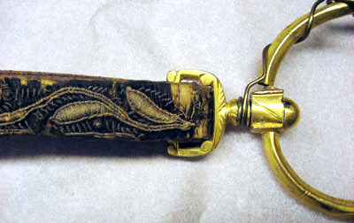 1 par förgylda betselstänger och en kindkedja, förgyllningen afnött;