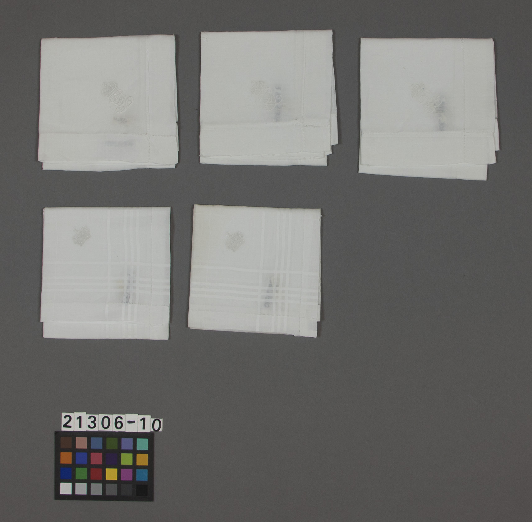 Kvadratisk näsduk av vitt linne, tuskaft. I ena hörnet broderat Gustav V's monogram under sluten krona. Fåll ca 25 mm bred, fäst med hålsöm runt om.