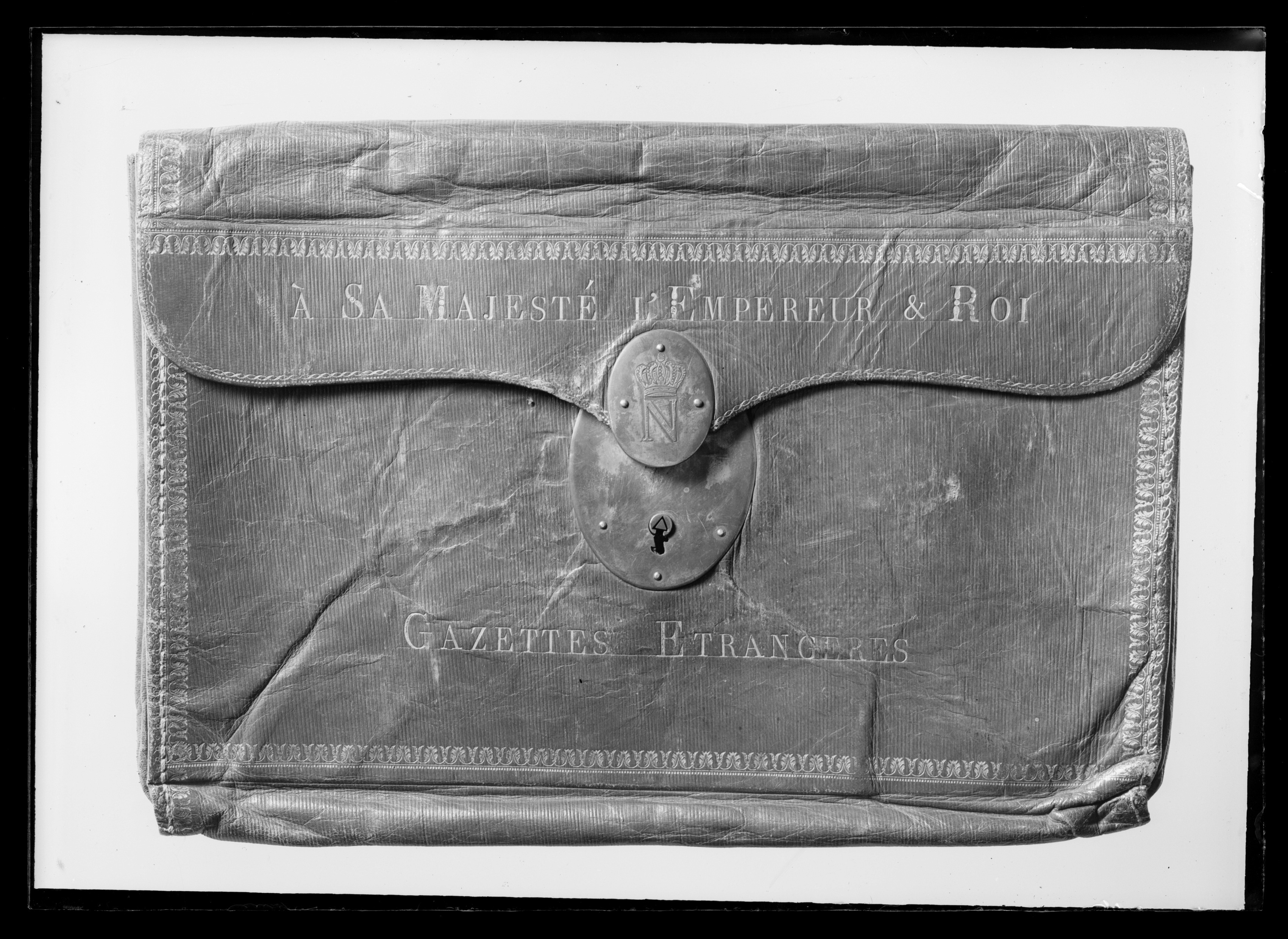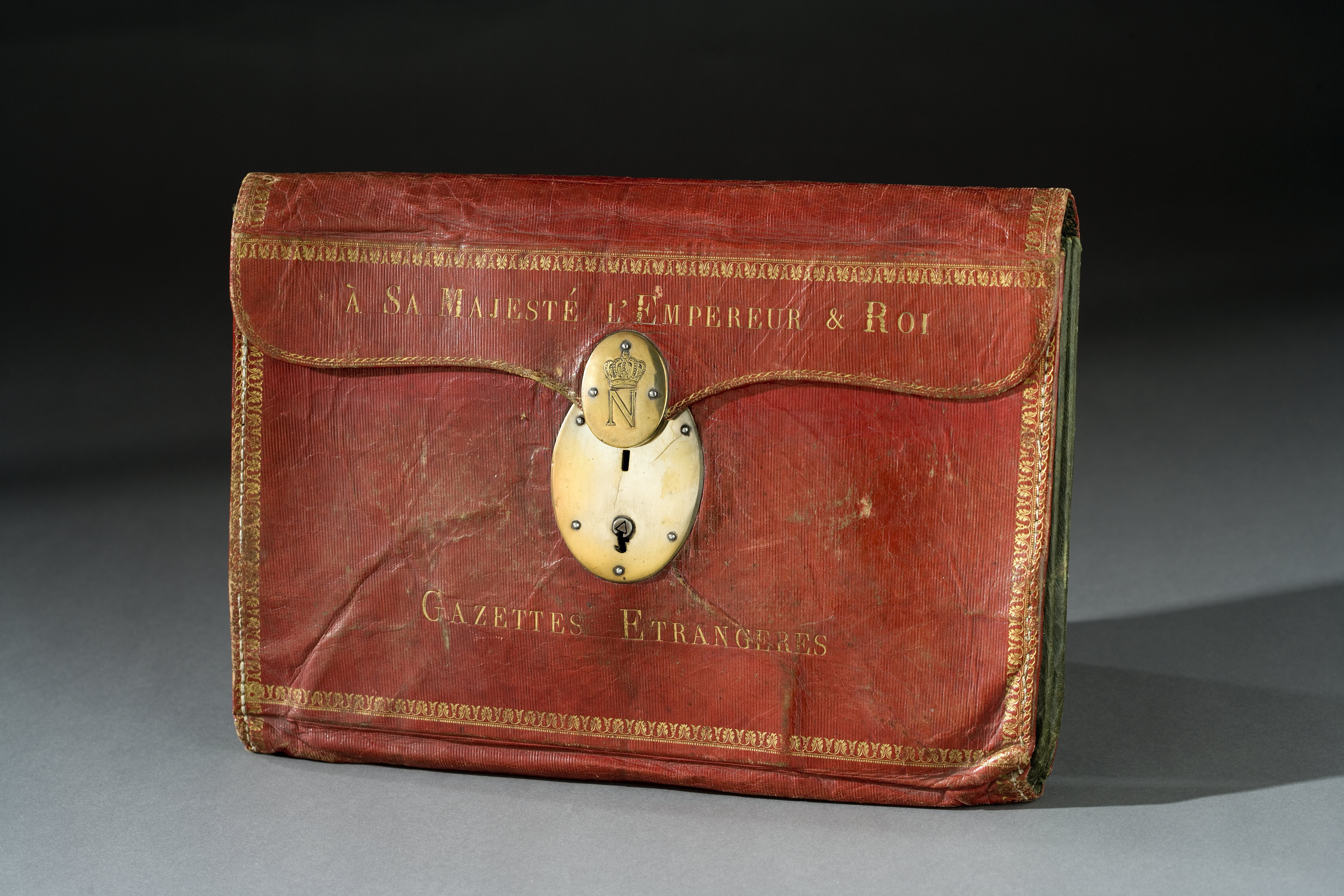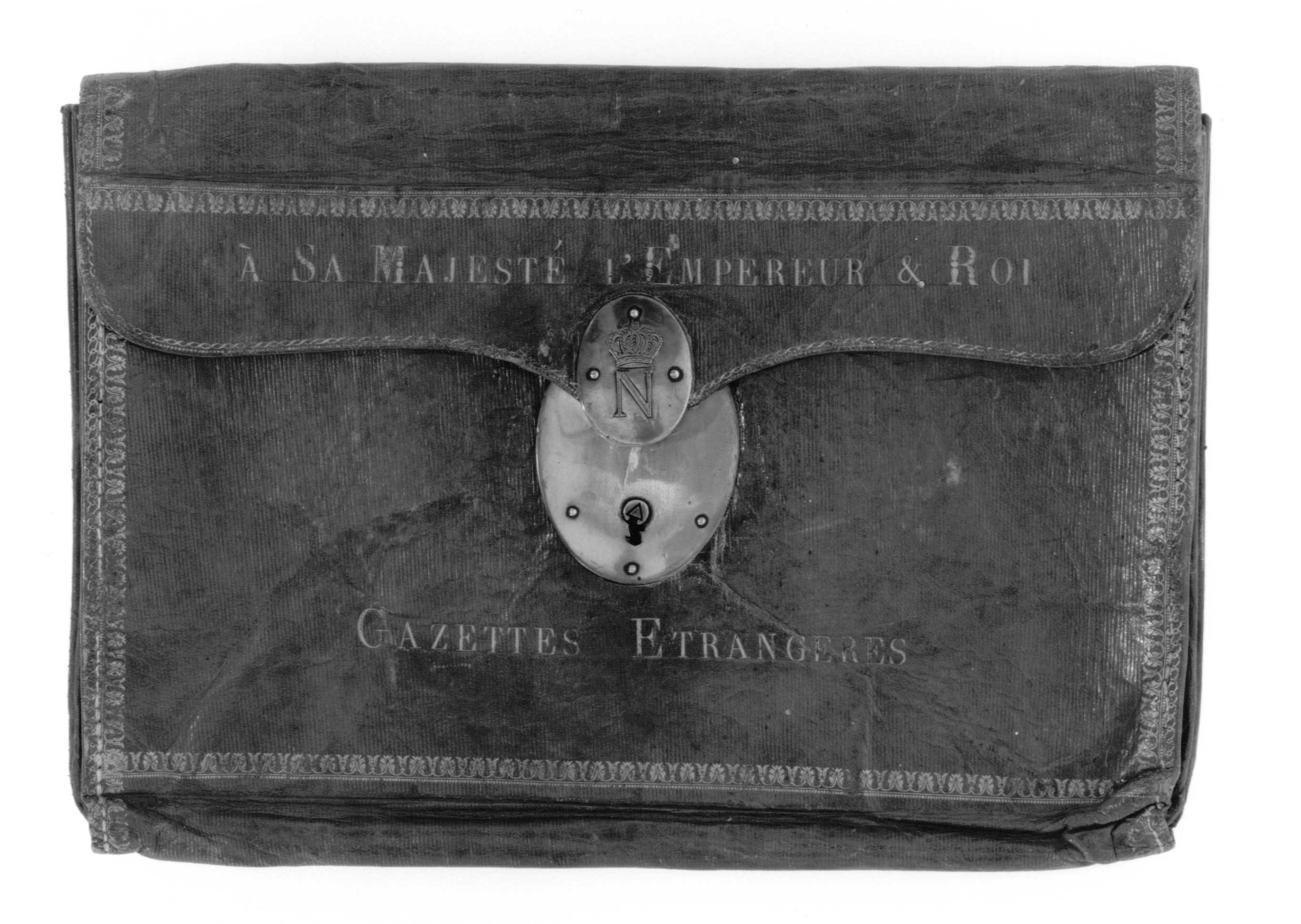 Portfölj med sidor, botten och lock av rött skinn. Kantbårder i guldpressning. Bladrankor, övervikt lock med rundade hörn, på mitten nedsvängt för låsplattan. Lås med oval platta av förgyllt silver (?) på underdelen, h: 82 mm, b: 59 mm. På locket fyrkantig bygel fäst på oval platta av förgyllt silver, h: 43 mm, b: 33,7 mm, tjocklek 6,2 mm, på denna plattas ovansida graverat N krönt av en öppen krona (ej franska kejsarkronan). På locket text i guldpressning: "A SA MAJESTE L EMPEREUR & ROI", nedanför låset: "GAZETTES ETRANGERES". Lock och sidor invändigt klädda med grönt skinn, veckade kortsidor av samma skinn. Igenom kortsidans överkant draget en snodd av grönt silke, ihopknuten i x-form mitt i väskan. På locket invändigt kantbårder i guldpressning. På bakväggen i väskan klistrat pappersetikett med bläckpåskrift: "Ce Portefeuille qui a appartenu a Sa Majesté L'Empereur Napoleon, se trouva // dans Son equipage de campagne, qui fut pris a La bataille de Leijpzig, le 18 Octo- // bre 1813, & ouvert en presence de Son Altesse Roijale Le Prince Roijale // de Suede, par le soussigne, Sous Chef de l'Etat-major de Son Altesse Ro- // ijale, & a cette occasion furent parcourus & conserves les pappiers & documens // importans que renfermait le dit porte feuille. //(Signe) // Jean Henri Tawast // Baron, Lieutenant general, Colonel du regiment de Calmar, // Commandeur Grand-croix de L'ordre de l'epée, Chevalier // Grand-croix de la lere classe du meme ordre, Chevalier de l'ordre // de S.te Anne de Russie, Chevalier de l'ordre de L'Aigle // Rouge de Prussie etc_". Etiketten nertill fäst med rött lacksigill med vapen för friherre Johan Henrik Tawast.
