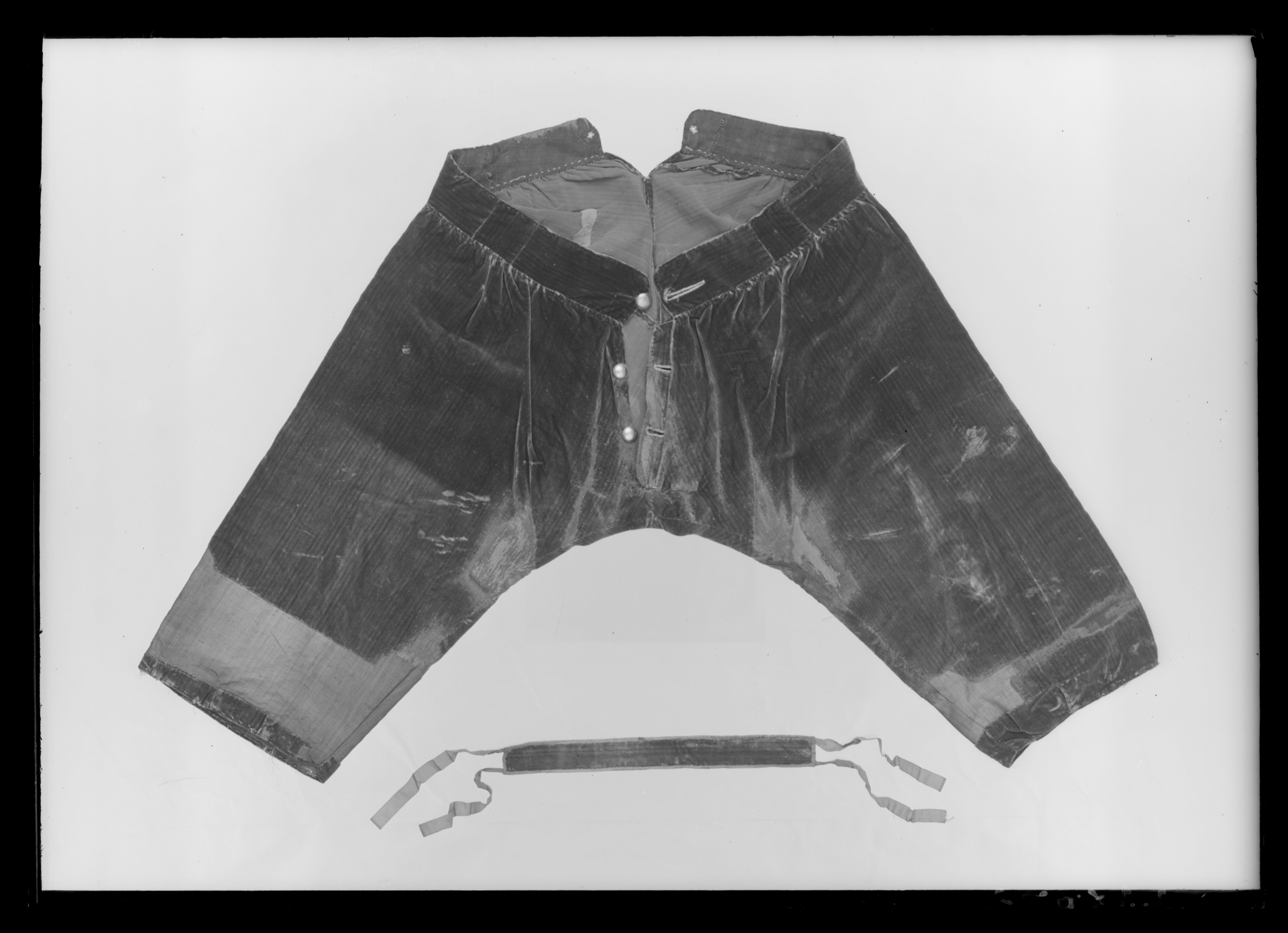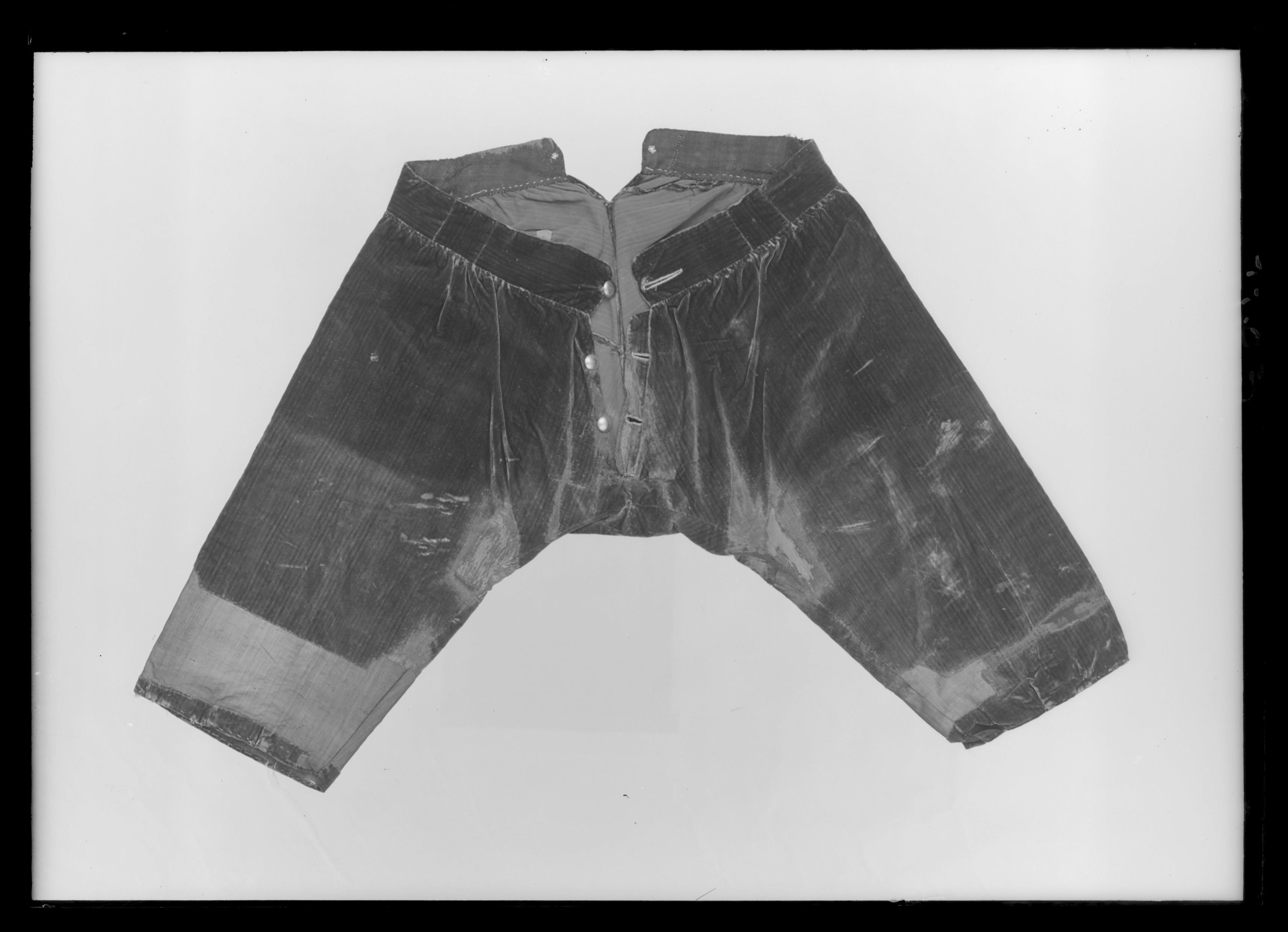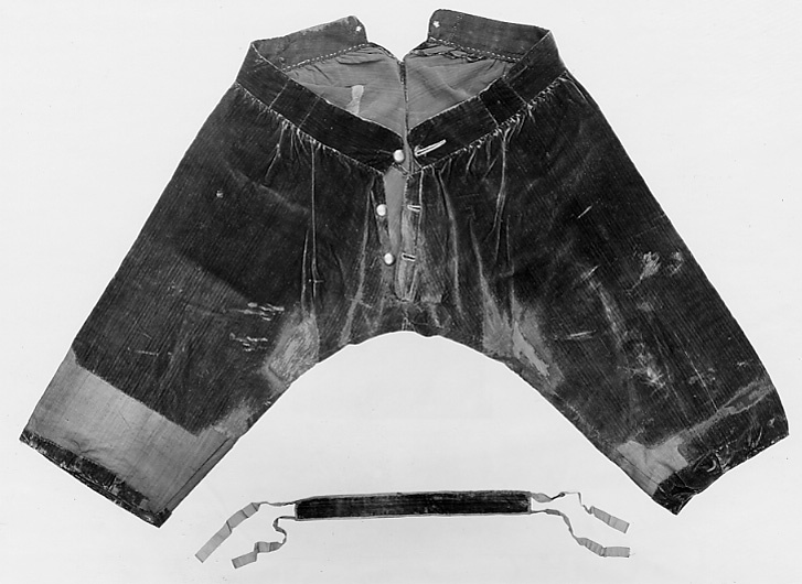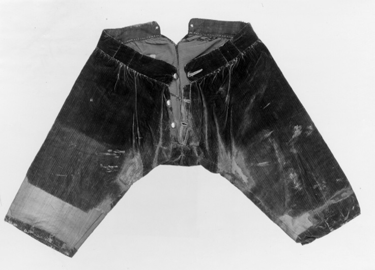 Byxor i blå sammet, sydda i fyra stycken. Stor kil bak samt upptill liggande rundad del. Revärer i guldgalon, 25 mm breda. Veck i nederkanten. Rynkade i midjan. Knäppes fram med tre guldfärgade, kullriga knappar, 22 mm i diameter. Delvis infälld knapphålsrad som är påsydd och har rundade hörn. Knapphålen sydda med gul tråd. Linningen är fodrad med blå yllekypert. I linningens foder två tvärställda rektanglar, vänstra: 50 x 60 mm, högra 55 x 60 mm, med vävens randning åt motsatt håll. Två hål i linningen bak, kantade med gul tråd. Dräkten syddes, tillsammans med tre andra dräkter, på 1750-talet till Ornässtugans museum i Torsångs församling, Dalarna, där Gustav Vasa skulle ha övernattat. Skräddarmästare var Erik Säterbeck, uppdragsgivare var ägaren Jakob Brandberg. Materialet levererades av provisor Nils Fahlbeck, Falun. Den var utställd fram till 1950-talet då dräkterna plockades ner för konservering i Livrustkammarens konserveringsateljé och ersattes av kopior.