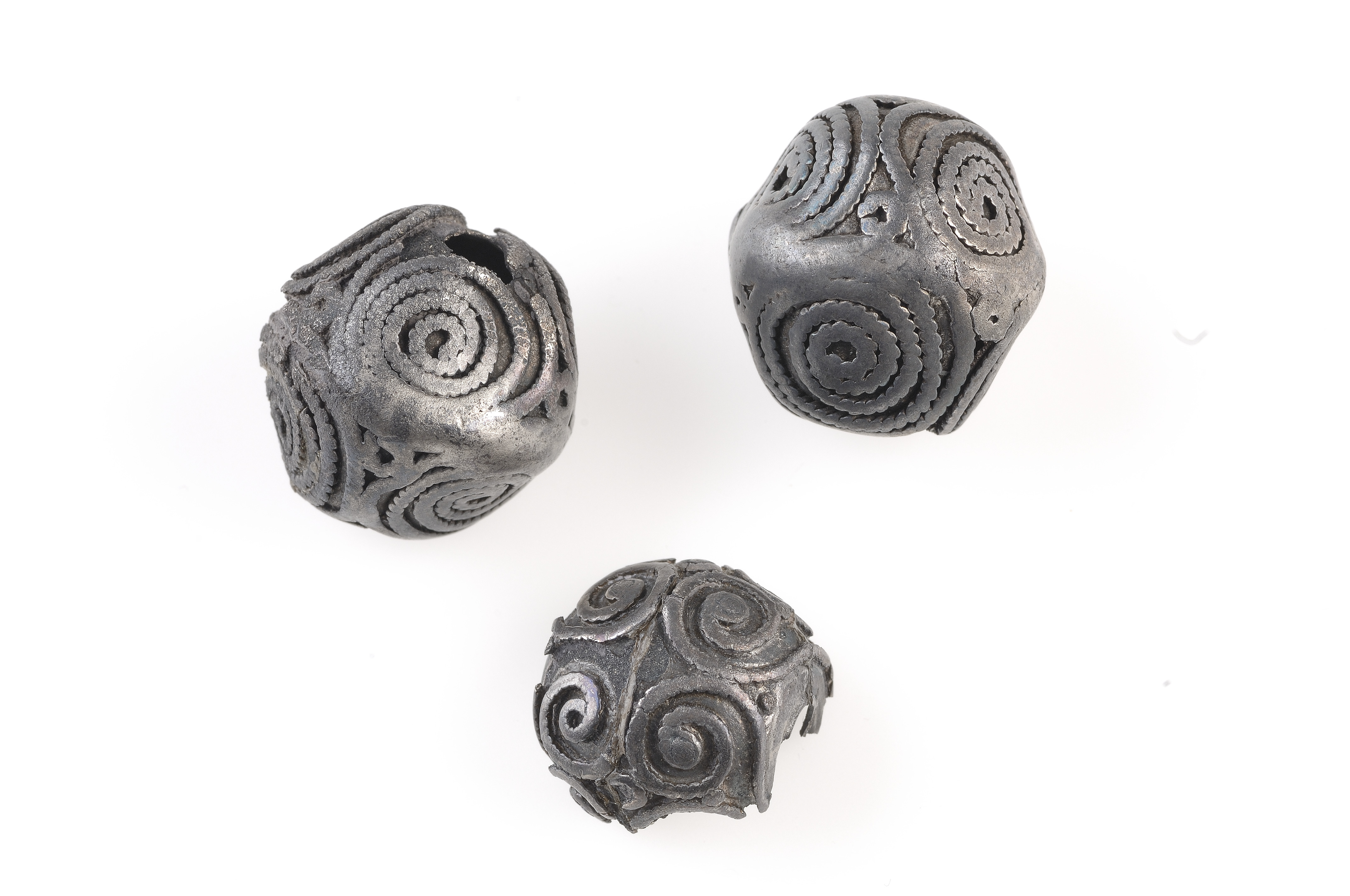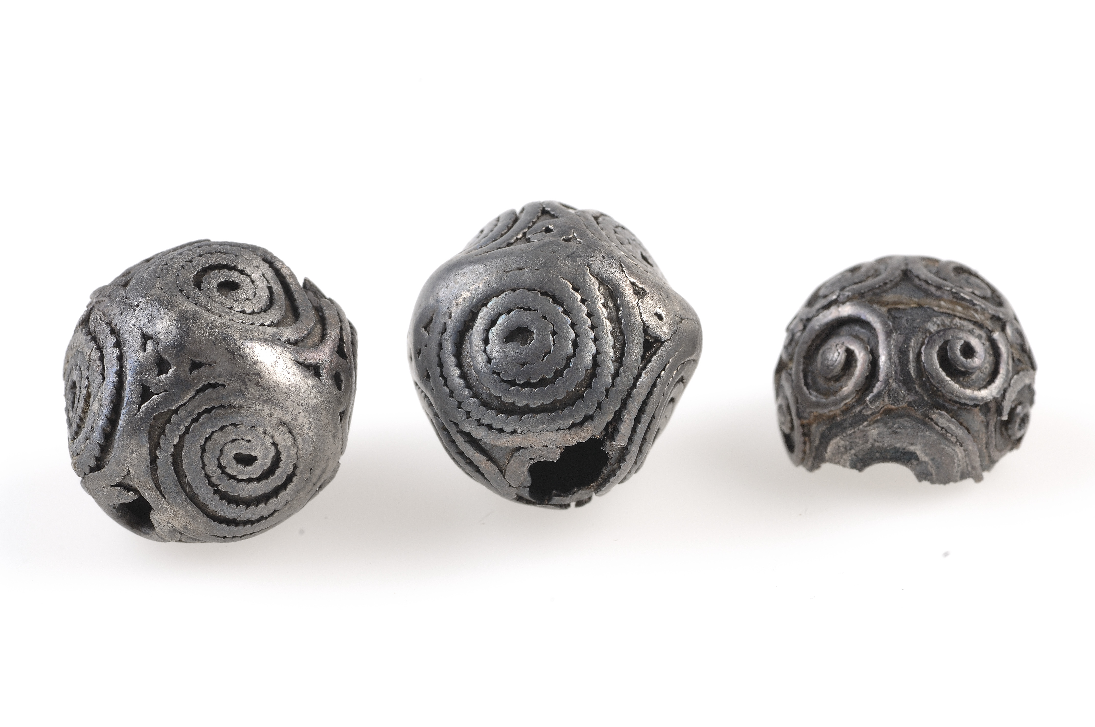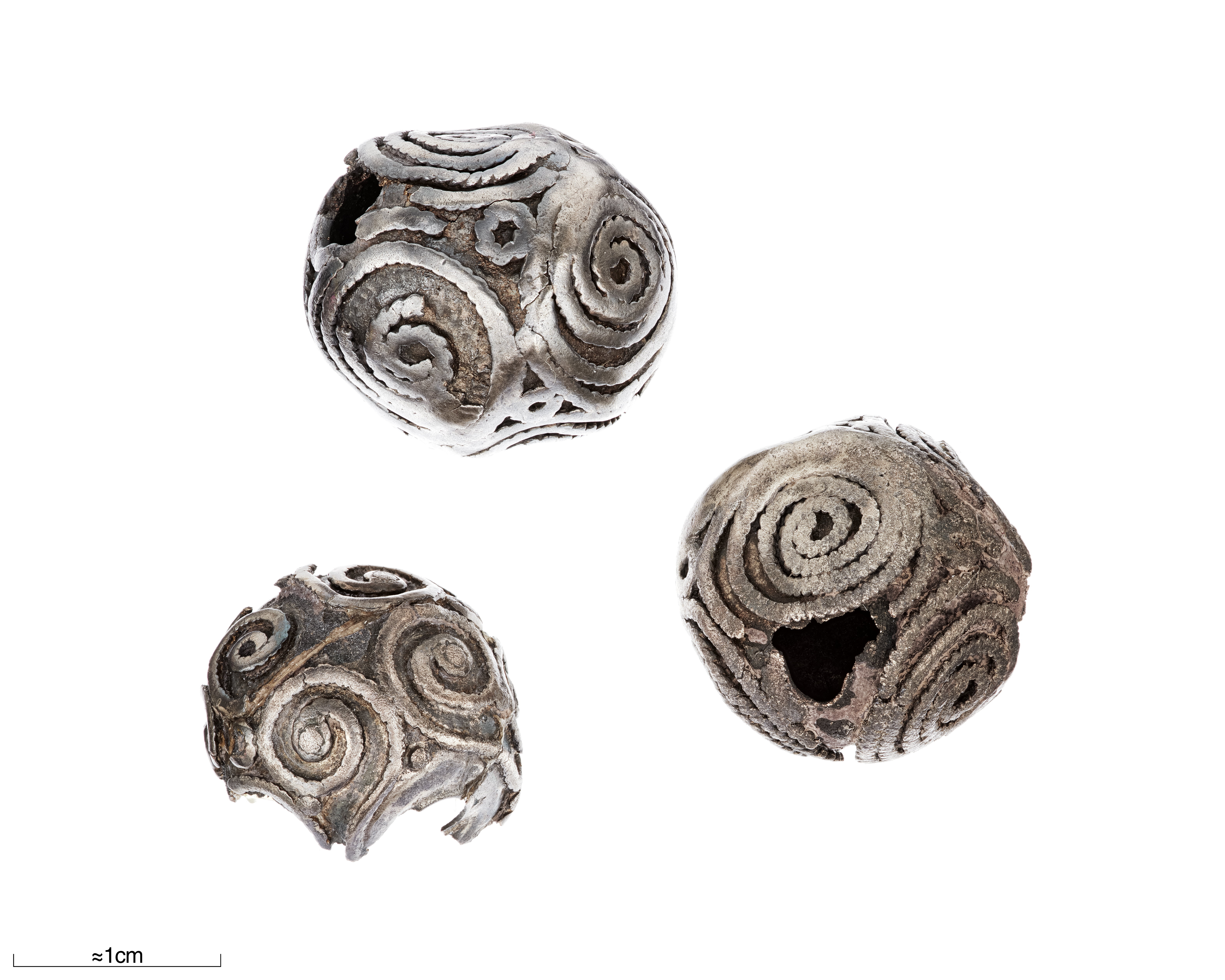 Två hela och en fragmenterad (halv). Filgranornamentik i form parvis kopplade spiraler. Hålen strakt nötta.