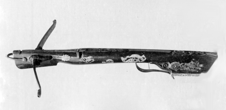 Båge av stål, fäst vid stocken med snörning av hampa. Lås med nöt av stål och snälltryck. Stock av ljusbrunt trä, med pilränna av ben. Kolv av tysk typ med snidad volut vid vingen, dekorerad med graverade och utskurna beninläggningar. På anslaget ranka med fåglar anfallna av ett rovdjur på vingen rektangulär platta med ranka. På kolvryggen fågel stående på drakslinga och nedsänkt snäcka i volutram. På kolvens högra sida drakar. Längre fram på stockens rygg beninläggningar i form av långsmal platta och blomornament, på sidorna drakar och fåglar. På pilrännan graverat blomornament. Bakom bågen urtag på stockens undersida för handen och framtill på ovansidan laxad skåra för sikte. Bakåt utdragen varbygel av stål. Framtill bygel av stål.