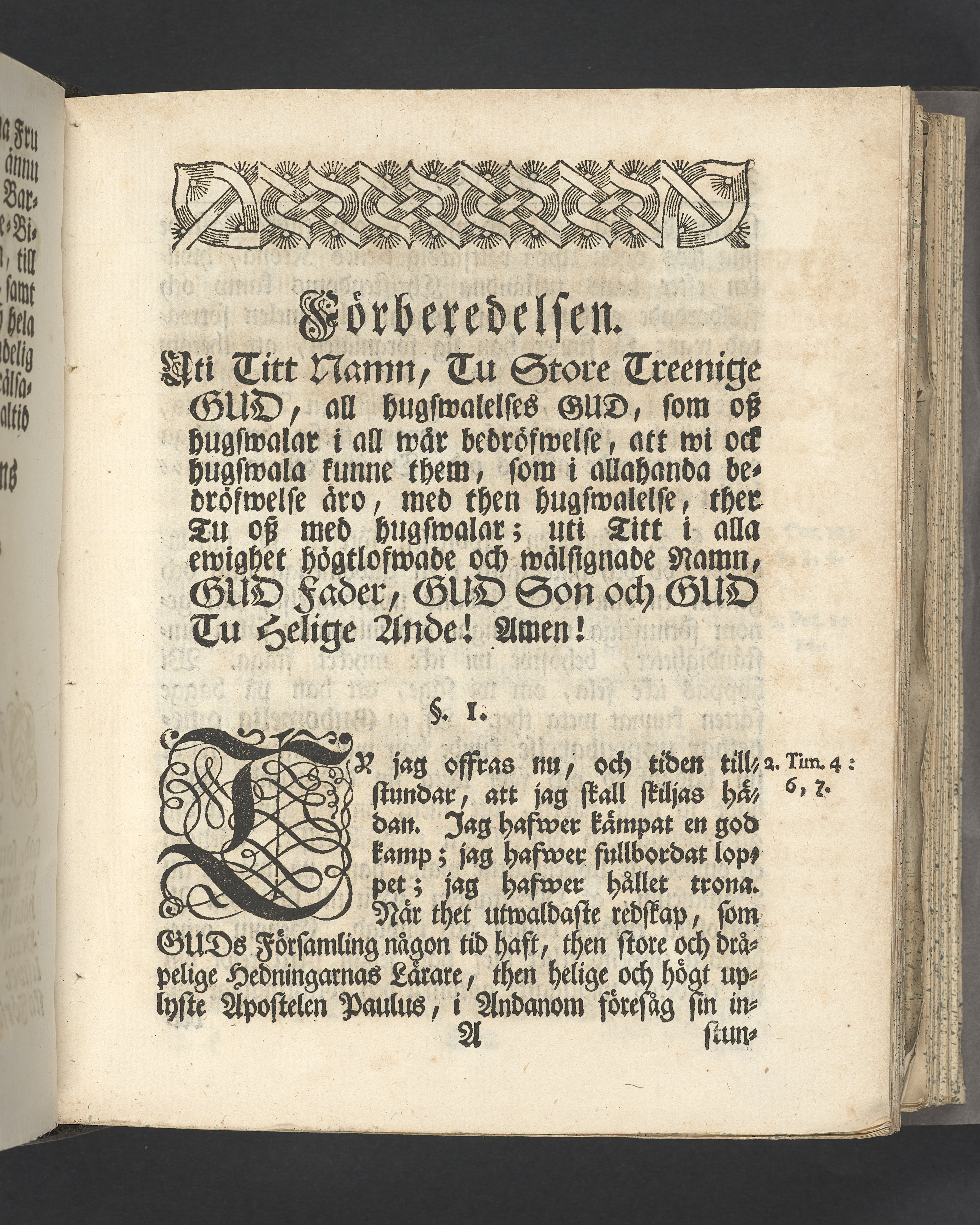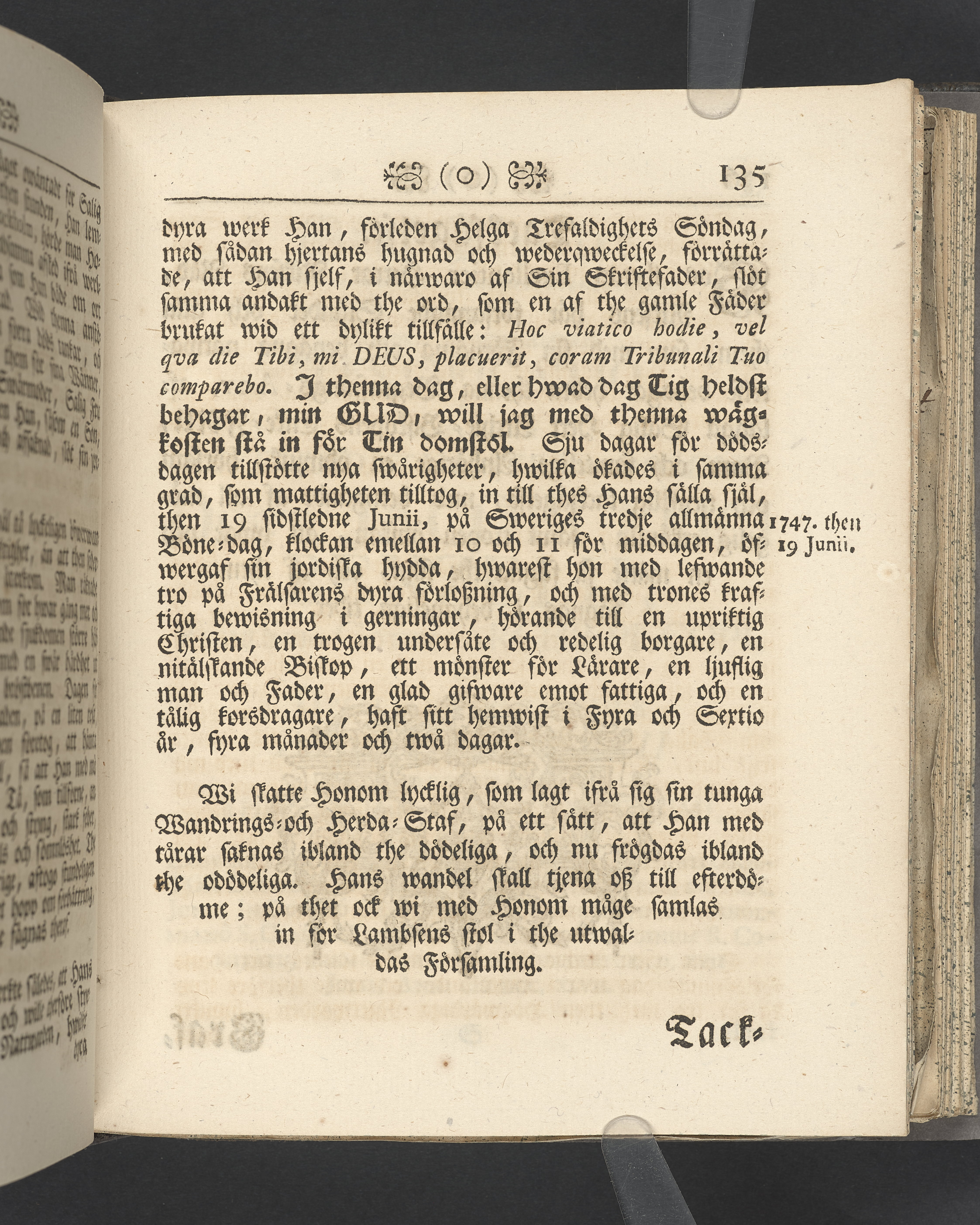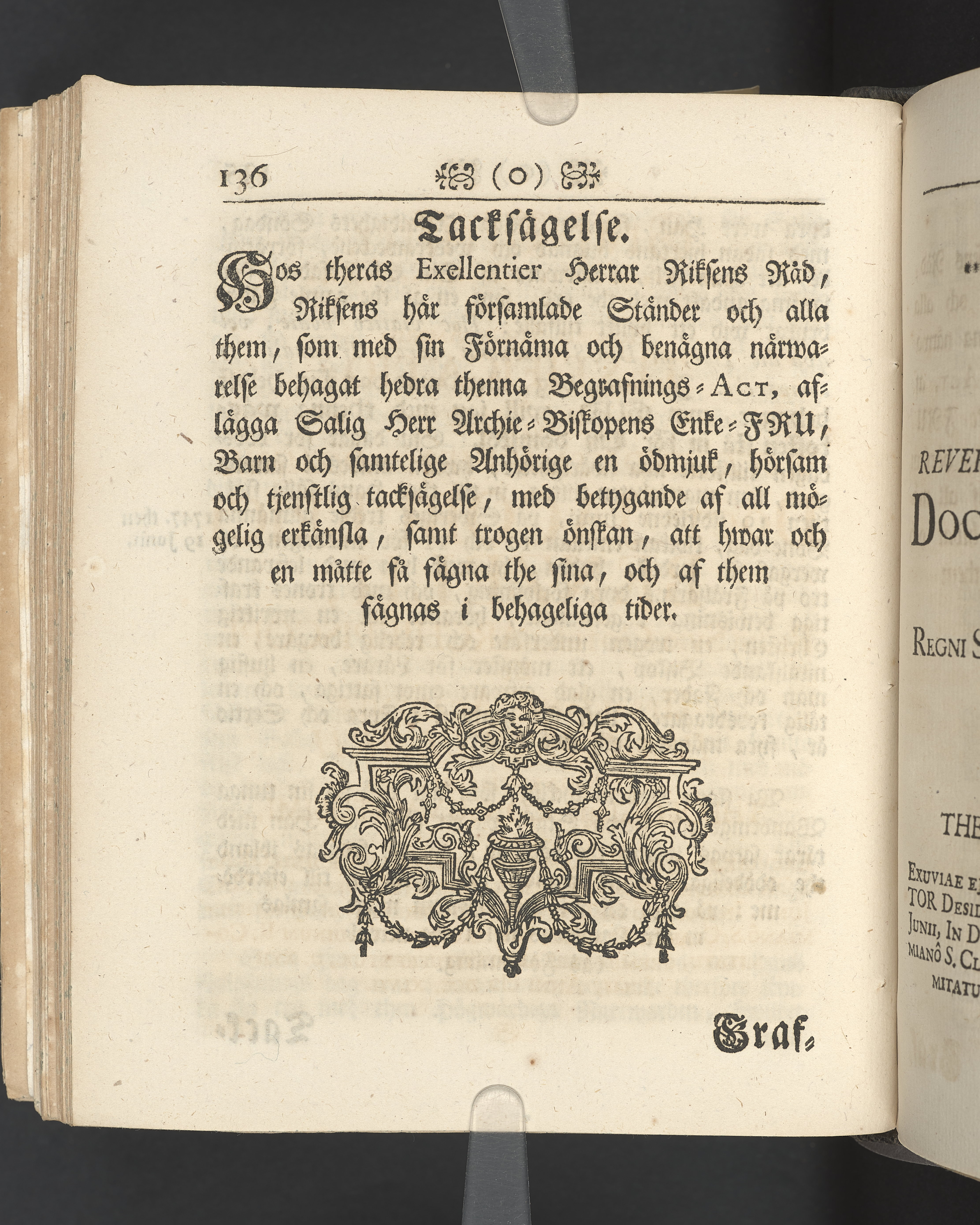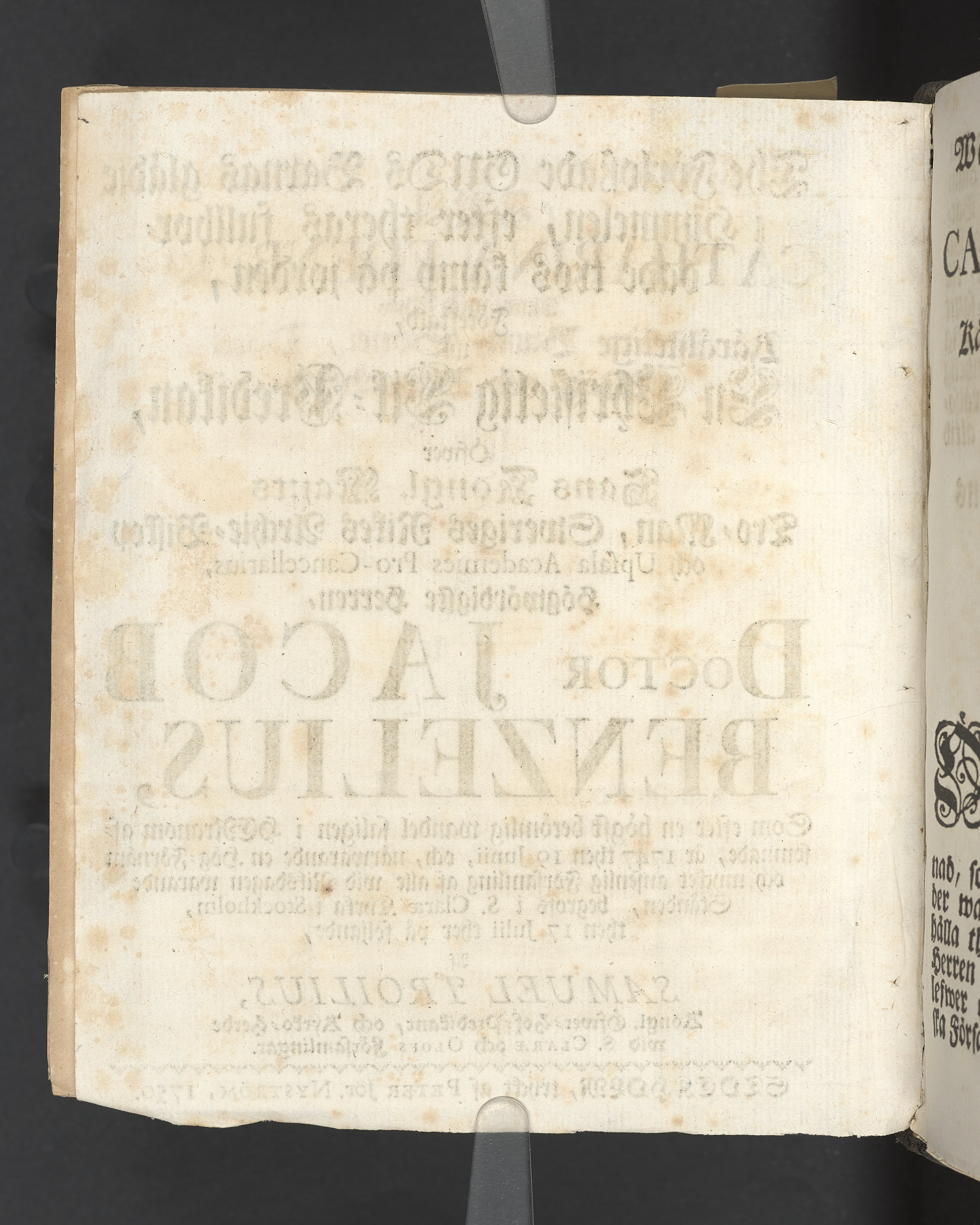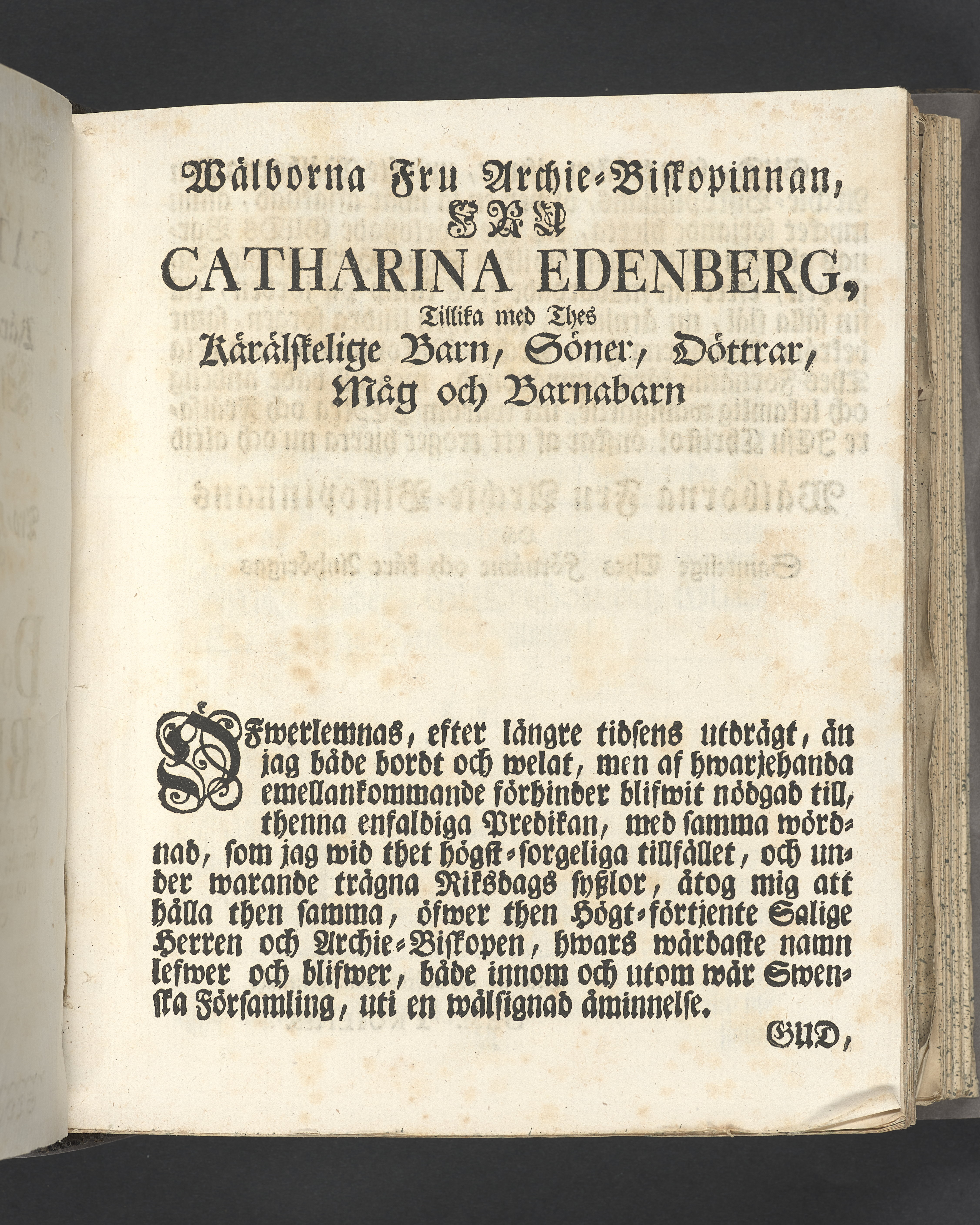 Vikt plansch med graverat porträtt av den avlidne innan titelbladet, med bilden vänd mot titelsidan. Snitt stänkta i rött och blått.