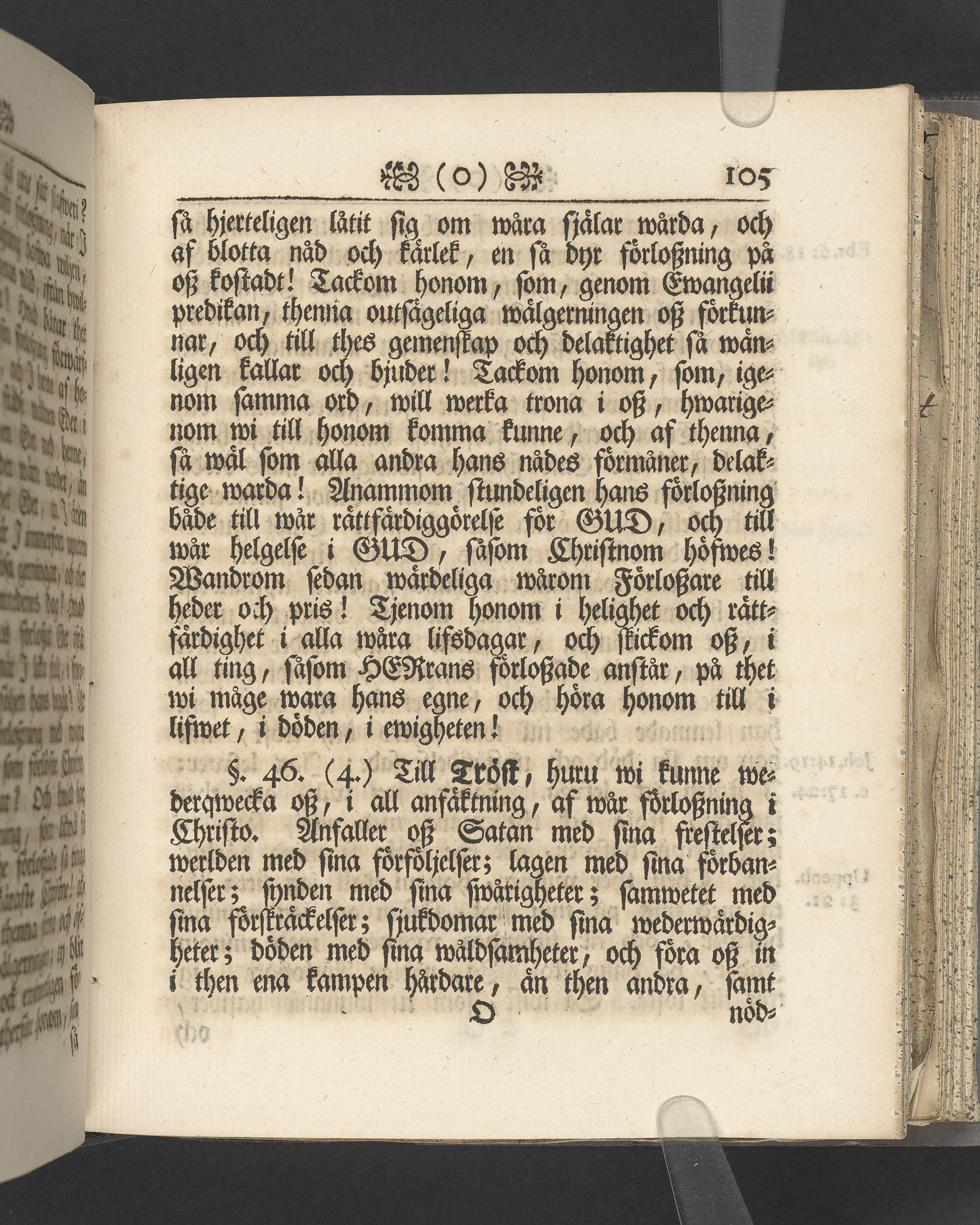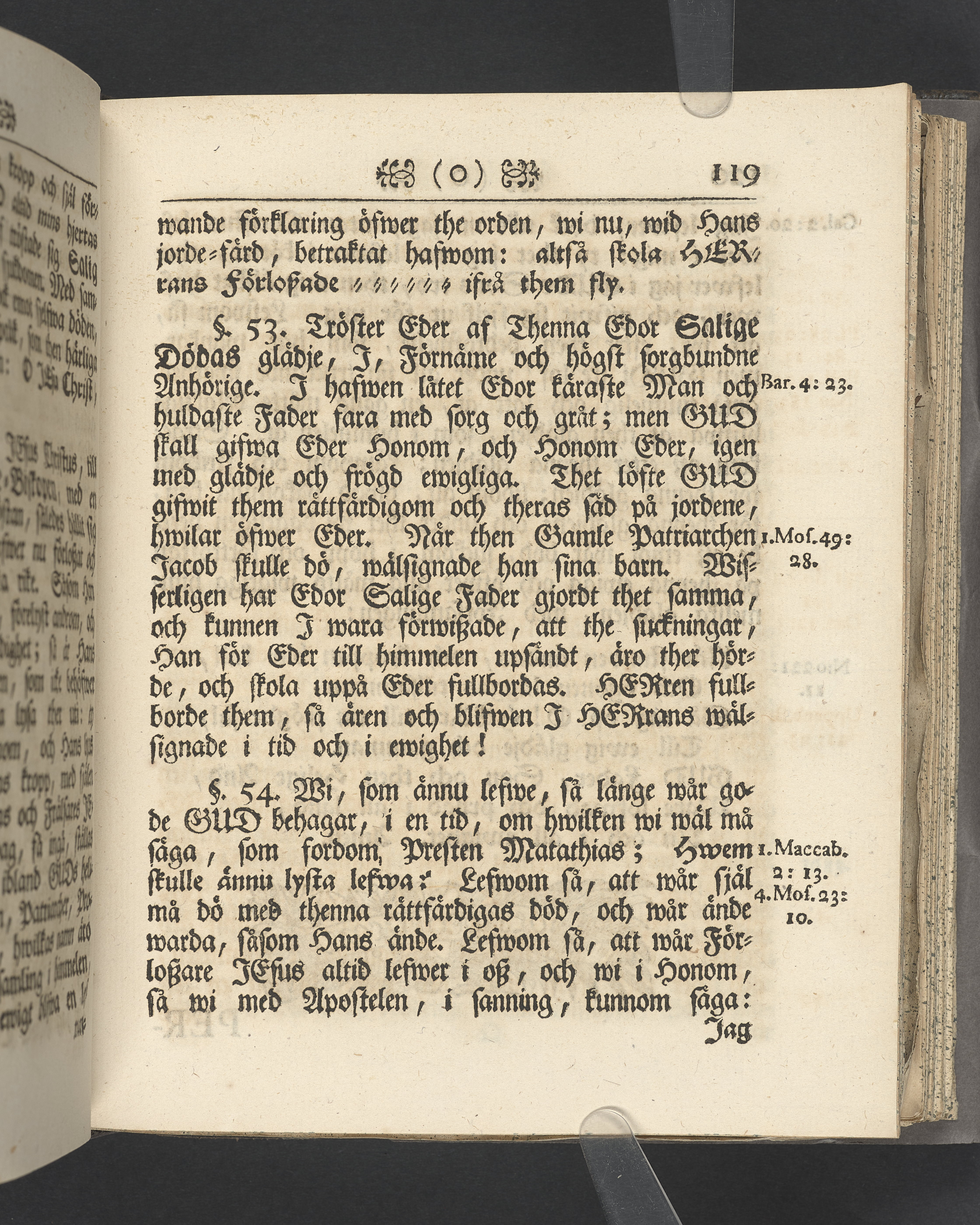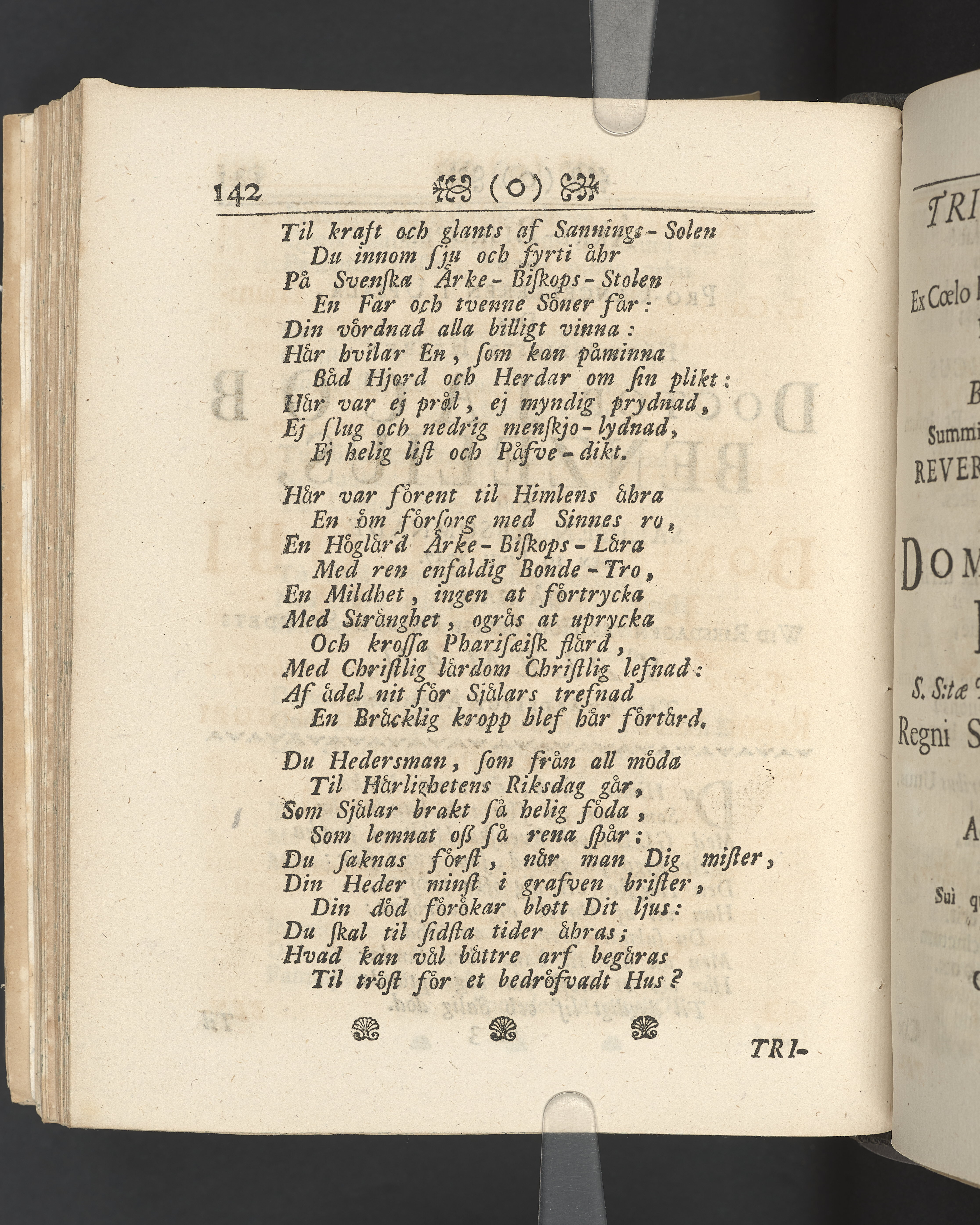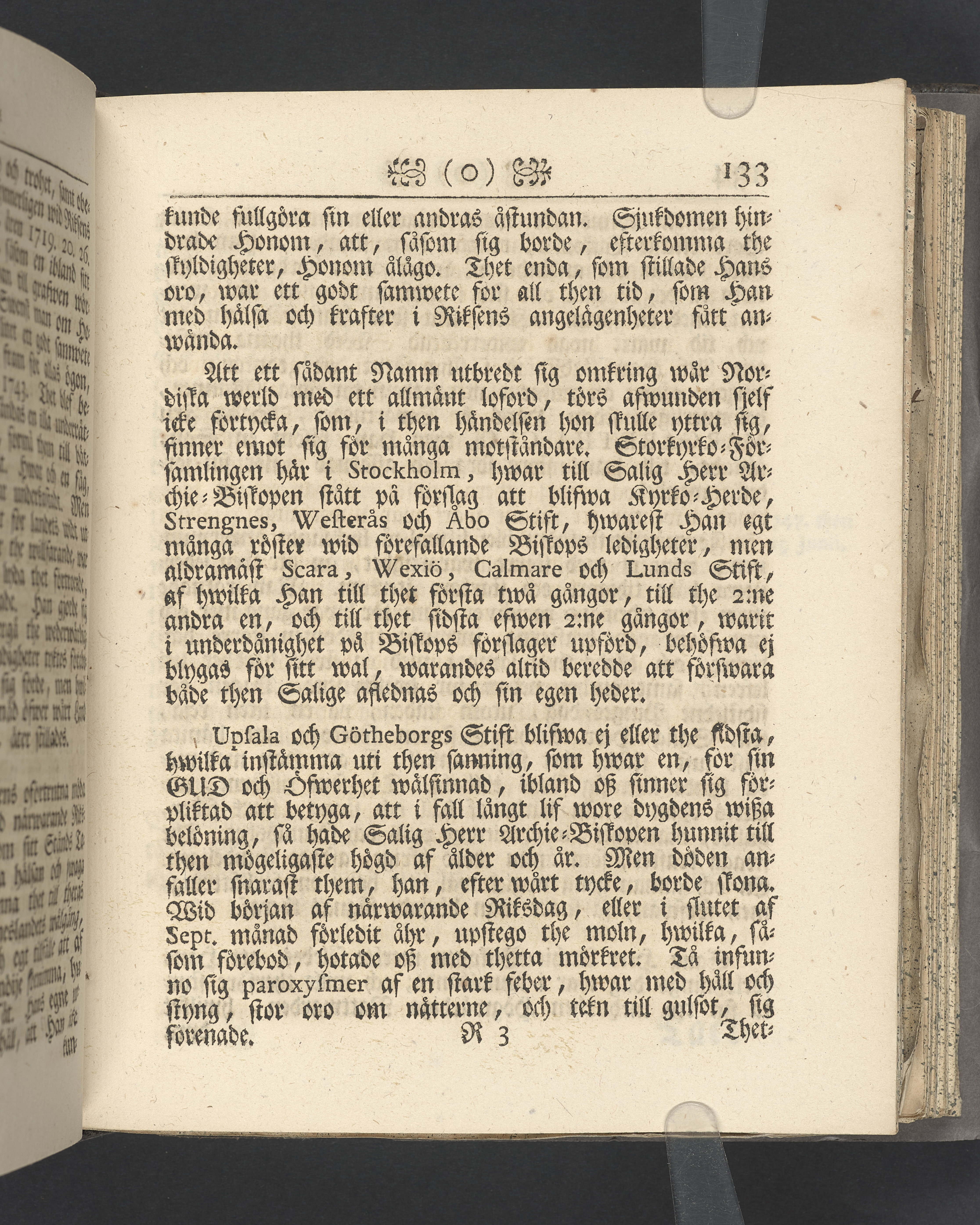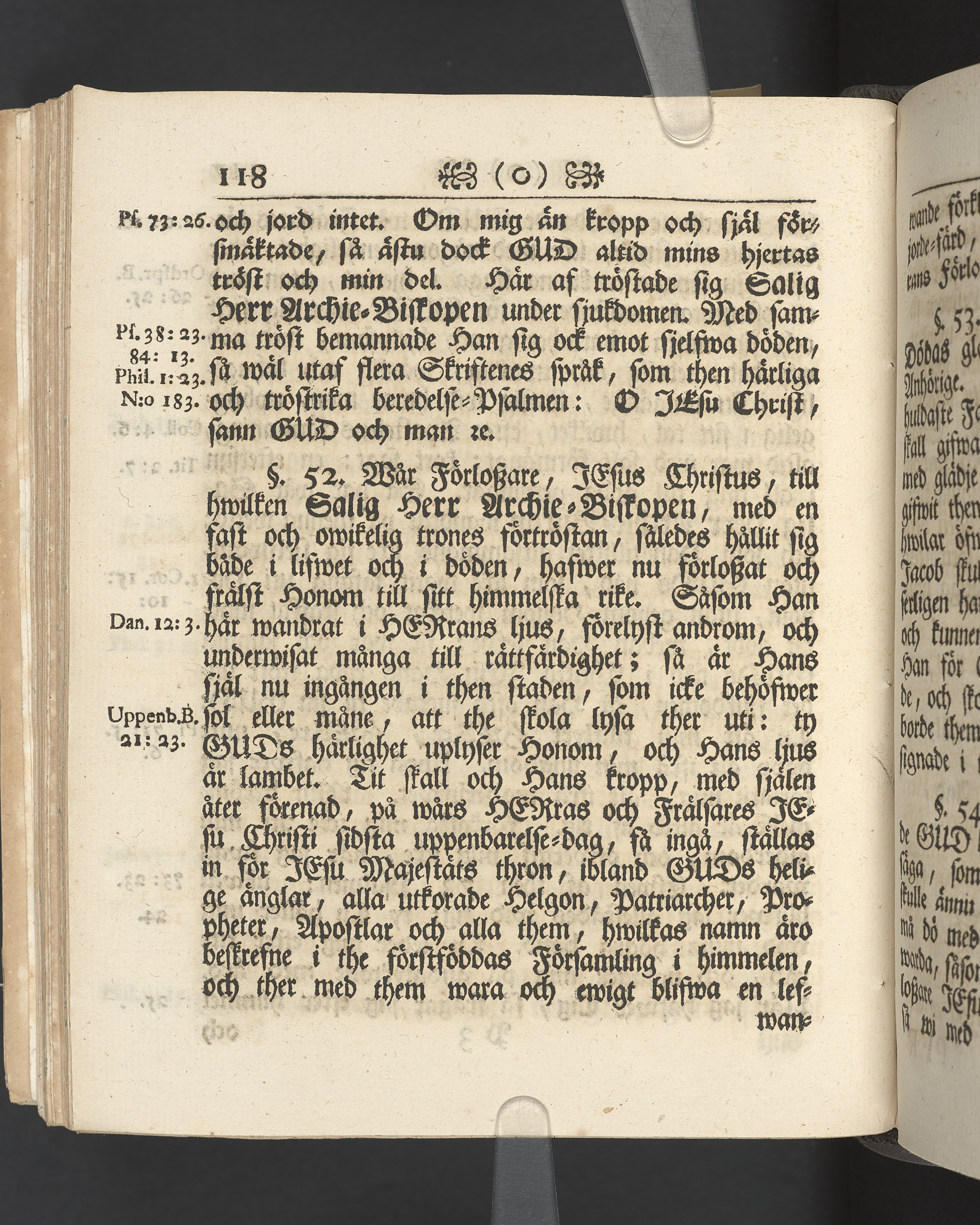 Vikt plansch med graverat porträtt av den avlidne innan titelbladet, med bilden vänd mot titelsidan. Snitt stänkta i rött och blått.