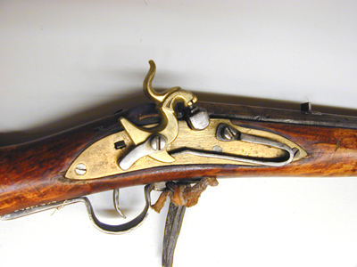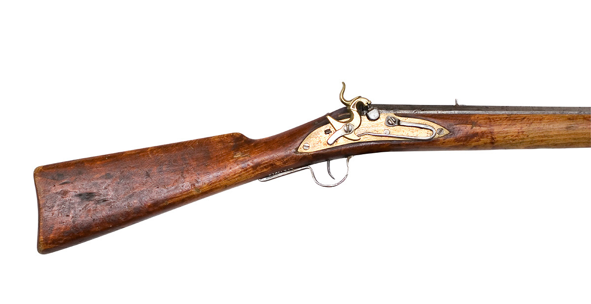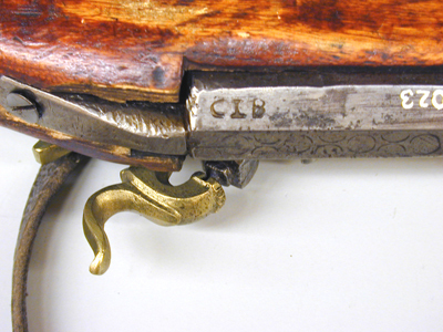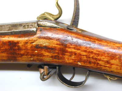 Slagsnapplåslodbösa, nordsvensk typ, utfjäderslås, tåspännare, 1800-talets mitt, pipan stämplad C I B.