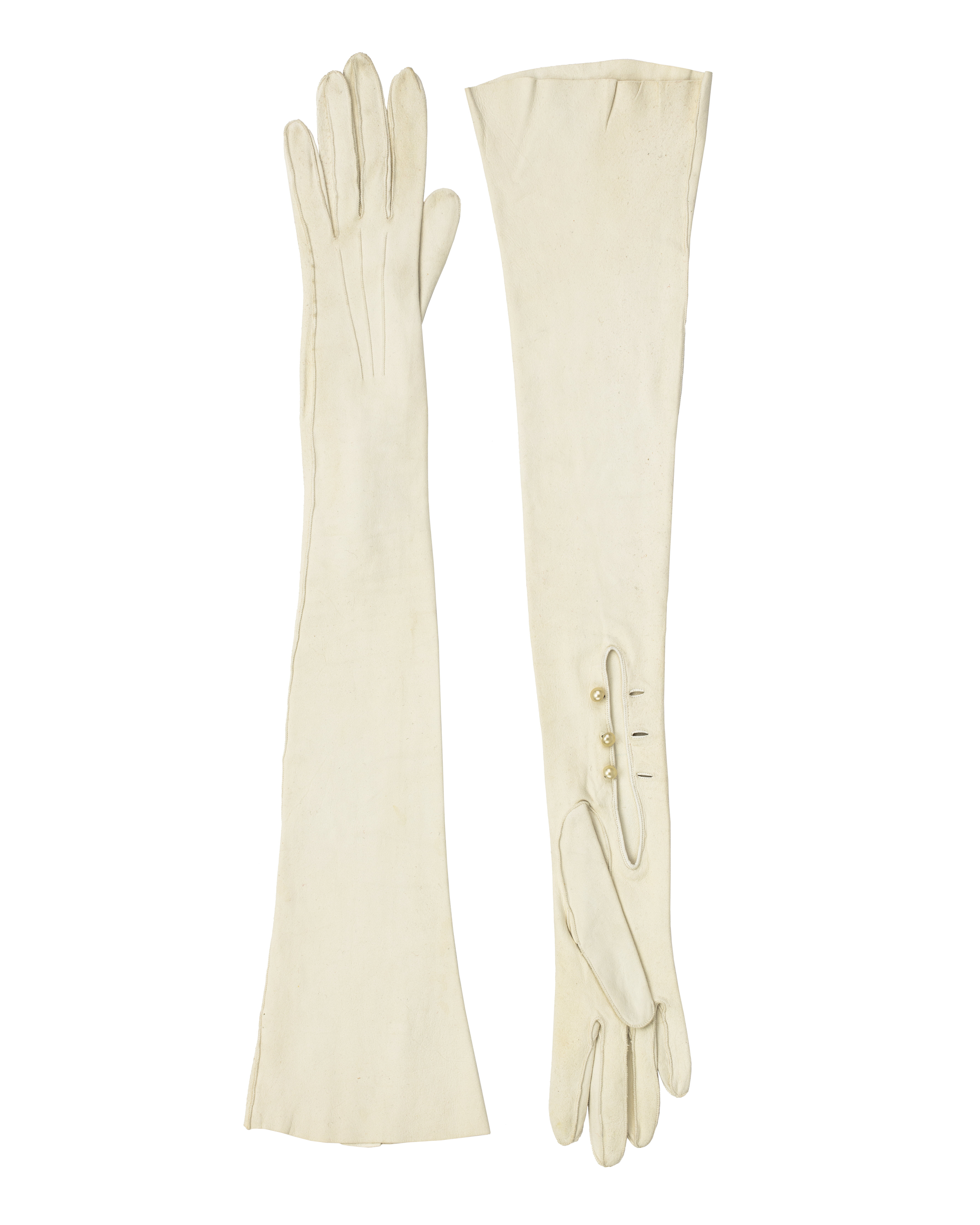 Hanske av vitt tvättskinn, storlek 6,5, med den sämskade sidan utåt. På handens ovansida tre mönstersömmar. Vid handloven ett långt sprund, längd 120 mm, knäppt med tre pärlemorknappar. Upptill på insidan stämplat: "6 21 // REAL KID // MADE IN FRANCE ". samt otydligt " 927 " " 12 ".