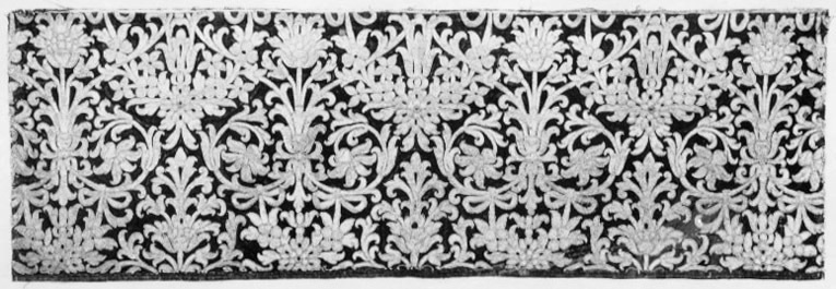 Bottentyg av röd sammet i kypert. Mönster av två omväxlande akantusmotiv, nedtill avslutade med ett blomstermotiv. Varannat motiv över hela höjden, varannat förskjutet ett halvt motiv i höjdled. Broderiet yttäckande i läggsöm med trådar av guld och silver nersydda med silke. Konturer av snoddar med metall spunnet över en silkeskärna. Längs kanterna har sytts på ett 10 mm brett rött bomullsband, halva synlig från rätsidan.