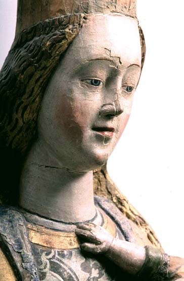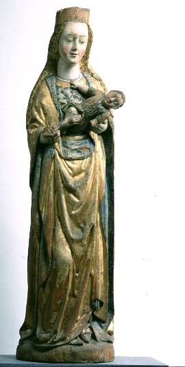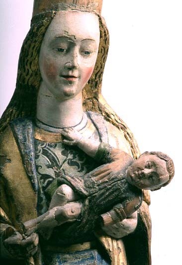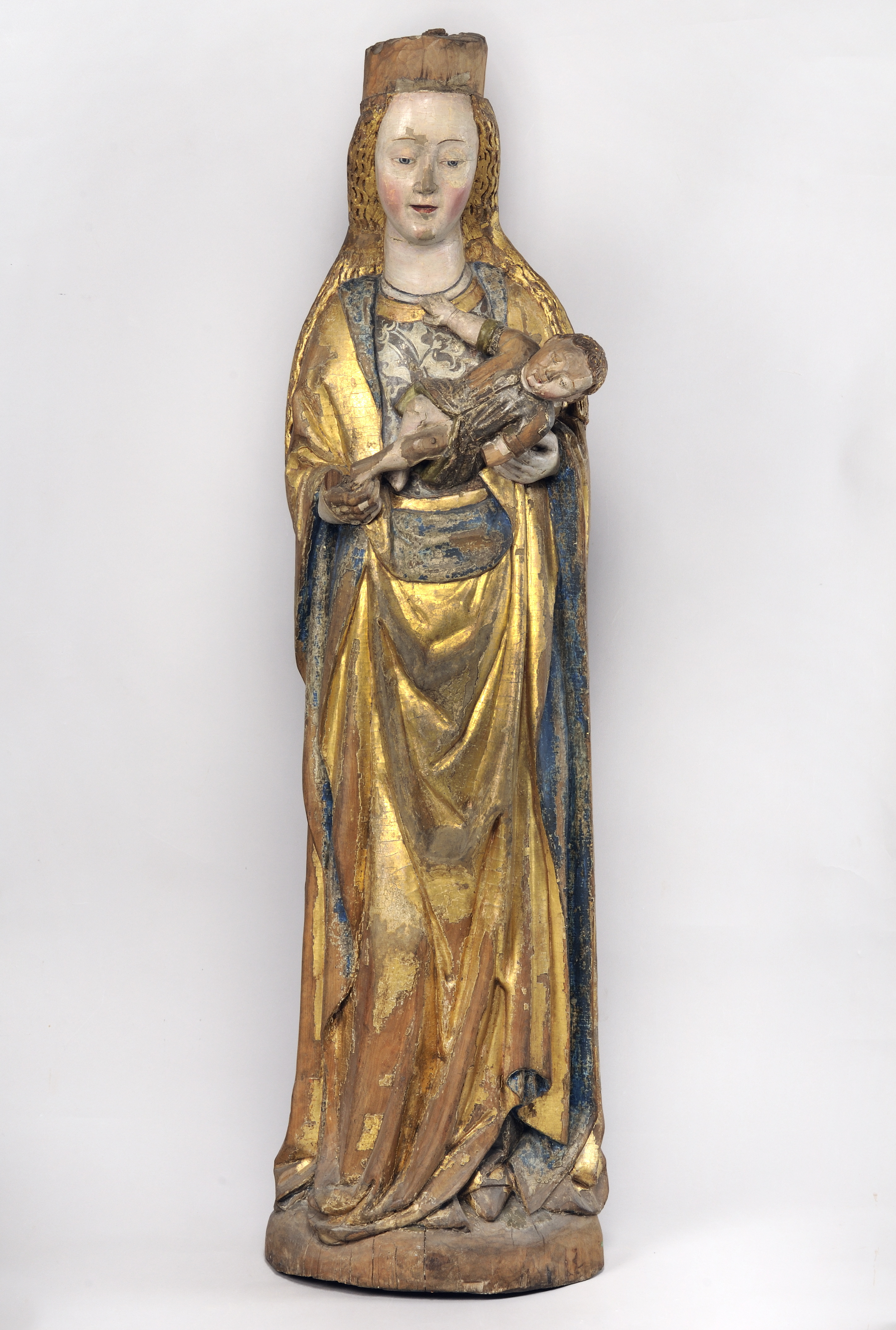 lövträ, bakstycke av furu. Kondition: Marias högra hand skadad, hennes krona, barnets vänstra hand och fot förlorade. Färg: betydande partier, speciellt karnationsfärgen välbevarad.