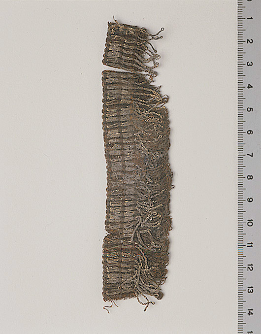 Fragment i två bitar av vävd kantfrans i spunnen guldtråd och silke. De ursprungliga färgerna delvis förändrade, fragmentet numera i brunt och guld. Fragmentet ingår i en samling fragment tagna som prov ur drottning Kristinas kista vid gravöppningen den 13-14 december 1965. Varp: 2-trådigt silke i s-snodd. Trådtäthet: Många trådar (okänt antal) av silke. Inslag: Silke i s-snodd samt metalltråd som bildar ögla i båda ändar. Trådtäthet: 4 trådar/cm. Metalltråden är dubbel vilket innebär att 4 stycken metalltrådar ligger parallellt och bildar två öglor i fransen. Material: Silke och metalltråd av virat lan kring silkekärna. Lanet är förgyllt på båda sidorna och guldskiktet är <0,3 um. Lanets bredd är 0,35 mm. Lanets tjocklek var svår att uppskatta p g a svår korrosion. Teknik: Bandet till fransen är vävt i varprips. Metalltråden är nedbunden på tre punkter i varje inslag. Kommentar: Förmodligen densamma som 32975 och 32977. Nuvarande färg är brun.