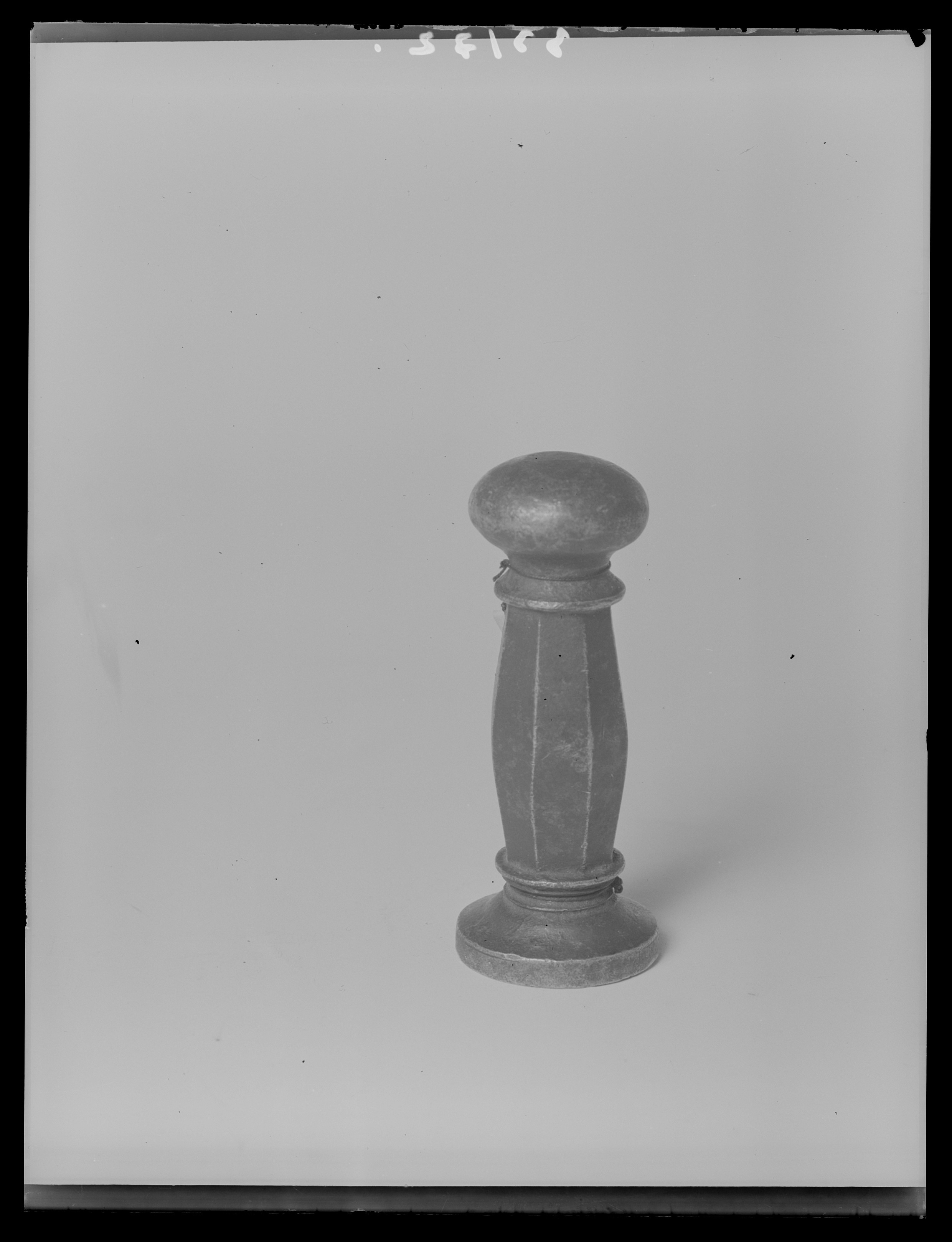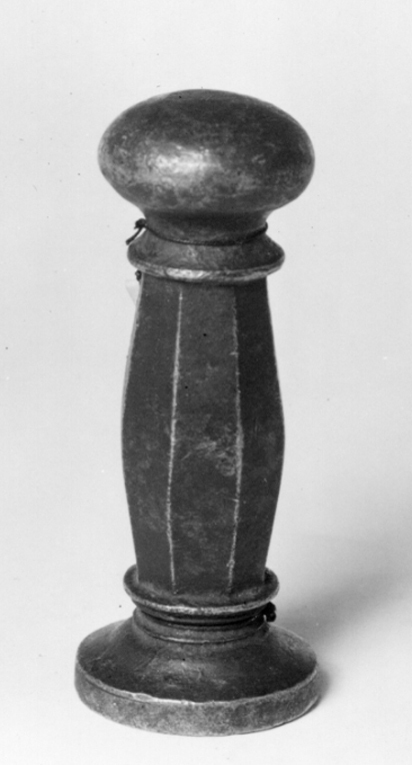 Oval platta, däri graverat vapen, rektangulär, skålad sköld med rundade hörn och insvängda långsidor, däri krönt lejon. Skölden lagd på kartusch och krönt av kunglig krona, kartuschen omgiven av palm- och lagerkvistar. Upptill spegelvänd omskrift: "CAROLVS.XII D.G.REX.SVEC", samt spolformigt skaft med ringari båda ändar, upptill rund, tillplattad kula, d: 27 mm, med ovalt platt fält på ovansidan. SHM nr 12397, åtkomsthandlingar saknas, lär vara funnen i Riddarholmskanalen enligt uppgift i inv. 1905. Deposition til LRK 1933-04-04.