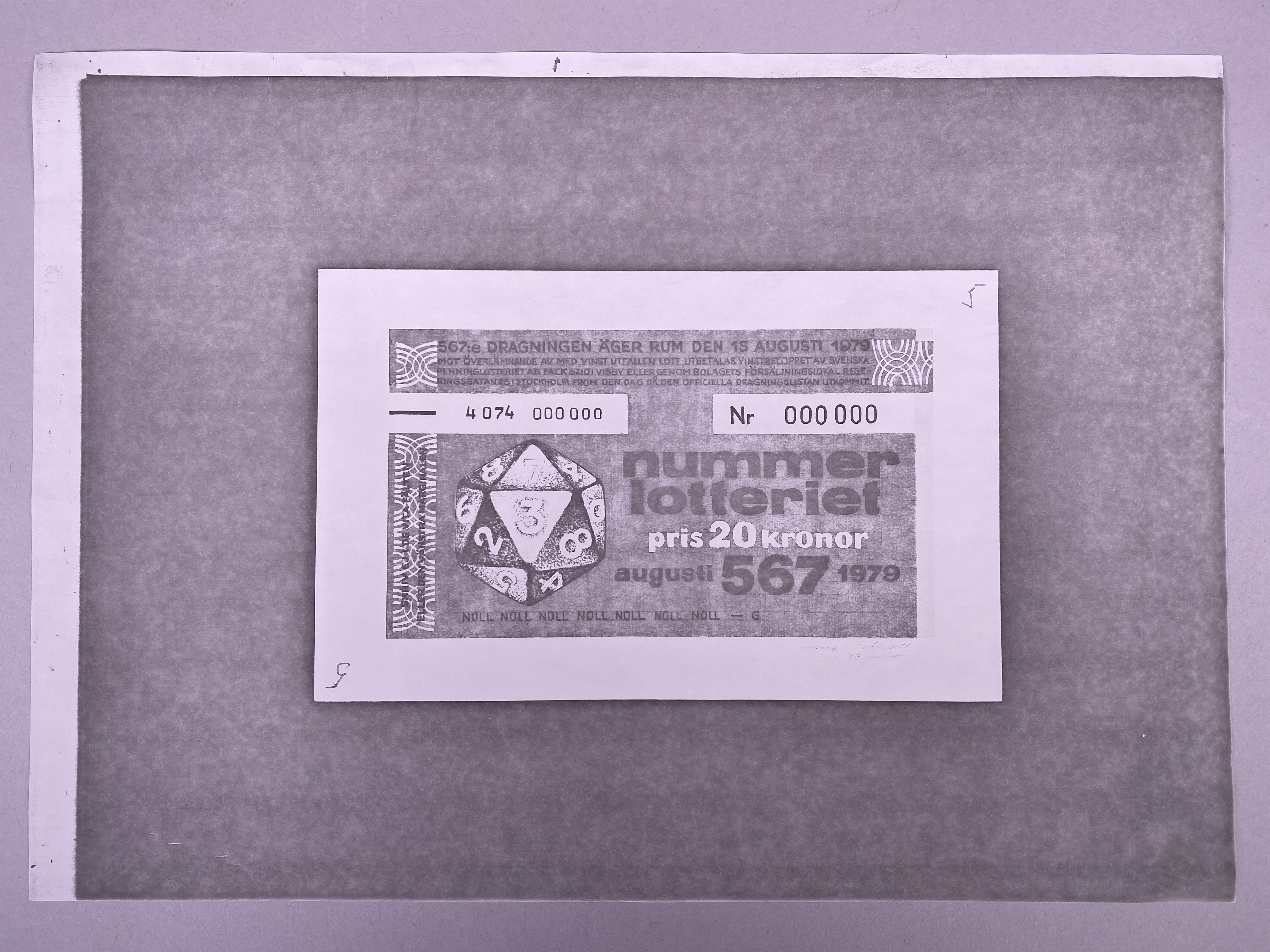 Exemplaret tillhör en grupp om 20 lotter (skiss, lotter med ram, provtryck, förslag etc.) som låg i ett kuvert med texten "Nummerlotteriet 1970-1979". |