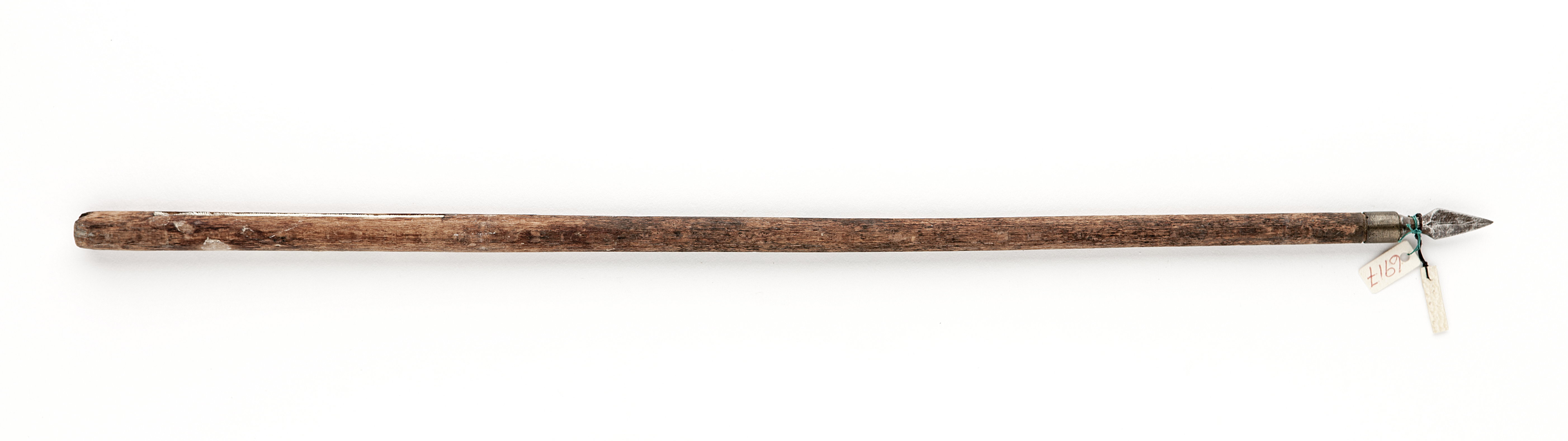 Liten triangulär spets på sexkantig hals med ringformigt beslag av mässing. Skaft av trämed två skåror för vingar.
