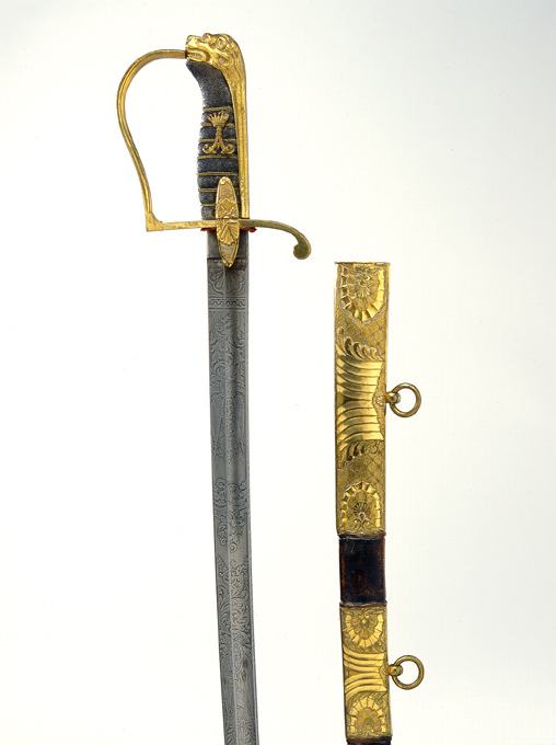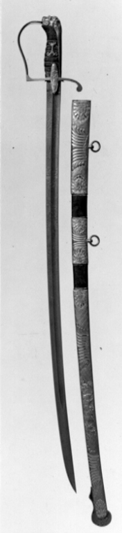Balja av svärtat läder med breda beslag av förgylld mässing, med driven och ciselerad dekor. Munbleck 179 mm högt, mellanband 89 mm högt och doppsko 462 mm. Samtliga beslag med yttäckande matt rutmönster, upptill och nedtill med en enkel palmett inom snäckliknande ram. På mitten av de två övre beslagen ett kraftigt ornament bildat av, på det övre beslaget fem och mellanbeslaget tre, snett mot varande ställda hålkälar. På dessa beslags bakre kant kulformig hållare med koppelring. På doppskon återfinns detta ornament på var sida om en trofégrupp bestående av en trekronorssköld med plymhjälm, fyra fanor, två kanoner på sidorna slingrande rankor (?) av lager. Släpsko av stål, assymetrisk, högre uppdragen på framsidan.