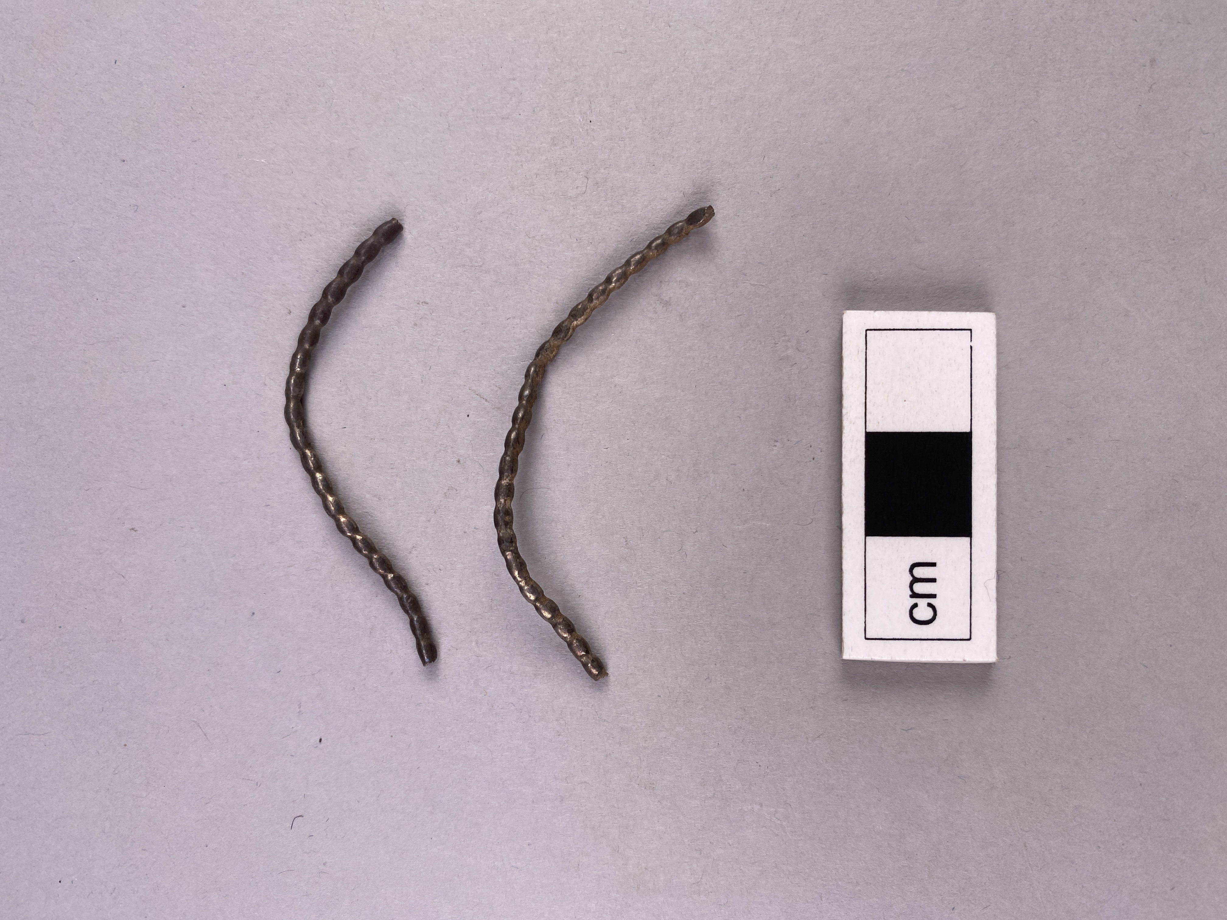Två snodda silvertrådar som tillhört en smyckebrakteat.