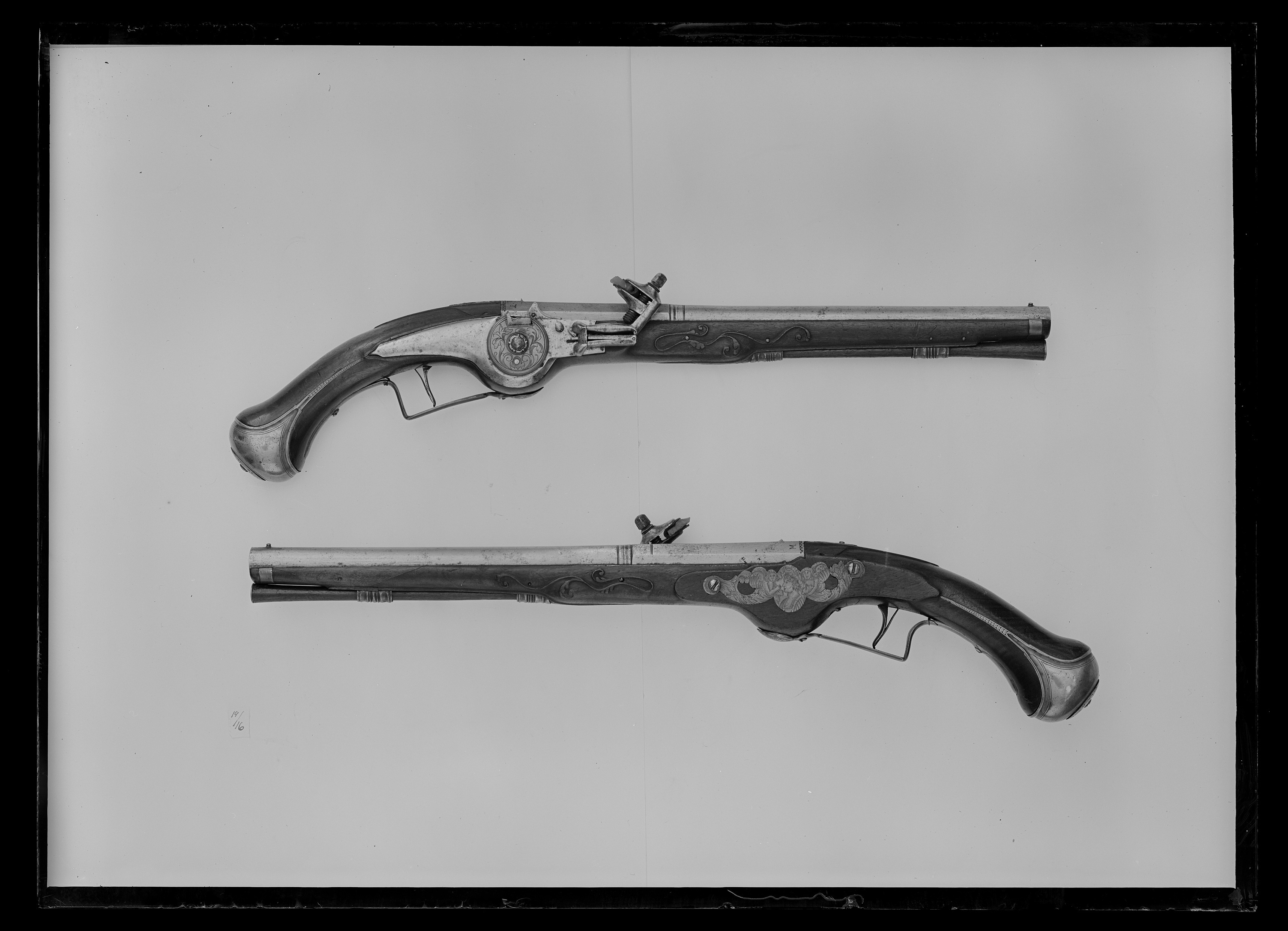 Rund, slätborrad pipa, kantig ovansida på kammaren. Stämpel på pipans bas: Dödskalle med korslagda benknotor omgiven av bokstäverna MBT. Därunder sicksackornament. På pipans undersida otydlig stämpel: yxa (se Stöckel, sid. 1007-1009) Suhl? Sachsen. Riktmedel:Ståndsikte och mässingsknoppkorn. Fästning: Fäst med krysskruv underifrån samt med två häften och två pipstift ett av mässing, ett av stål. Hjullås av fransk typ med välvt låsbleck och utanpåliggande hjul med hjulkapsel av mässing fäst med en skruv kl. 6. Graverad bladornamentik på kapseln. Fängpanna med rundad framkant och låg, rundad krutskärm. Fängpannelock med tryckknapp. Hane med rak hals och svagt kägelformig kropp med liten volut. Lös underkäke, flintbit omlindad med skinnbit mellan käkarna. Käkskruv med fyrkant flänsskalle. Låsblecket stämplat HNS i sköld på insidan. Slagfjädern förbunden med hjulaxeln via kedjelänk. Fästning: Två låsskruvar. Helstock av valnöt med en skuren bladranka på var sida av stocken vid spetsrörkan. Runda, profilerade rörkor av mässing. Mässingsskodd framkant på stocken. Sidbleck av mässing mellan skruvhålen, konturerad platta med graverad dekor i form av två änglar mellan sig hållande en oval medaljong med mansprofil. Avtryckare med fjäderbelastning utan avtryckarbleck. Rak varbygel av gjuten mässing med lång bakre arm och kort kottformig främre. Slät kolvkappa av mässing med markerad kant och smala graverade linjer längs kanter och centrumplatta. Centrumplatta av stål med graverat rosmönster, fastskruvad med kullerförsänkt spårskalle dekorerad med rutmönster. Flikarna når fram till låset. Tillbehör: Laddstake, längd 364 mm, av valnöt med mässingsskodd stötände.