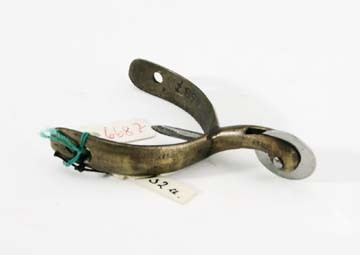 Liten klacksporrre av mässing med klinga av stål. Små u-formade skänklar med konvex utsidaoch rundade hålförsedda ändar. På insidan, mitt för halsen, en spets av stål, l: 13 mm, avsedd att fästas i klacken. Svagtböjd rundstavig hals, l: 19 mm. Slät rund klinga av förnicklat stål, d: 13 mm.