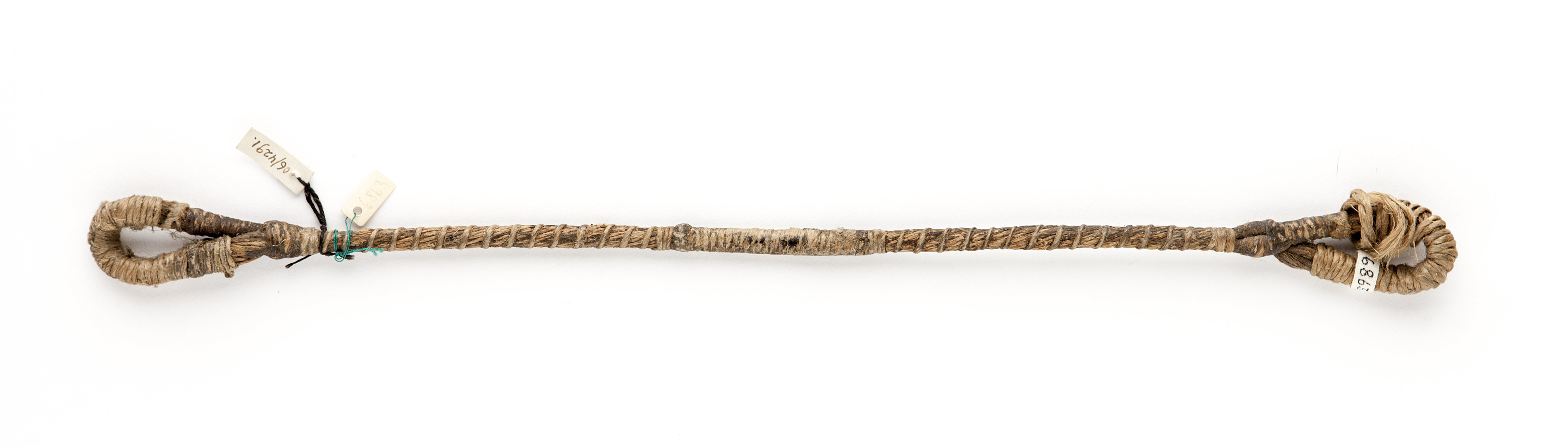 Sträng av vaxad hampa av många trådar, lindad tätt på mitten om ändarna glesare på sidorna.