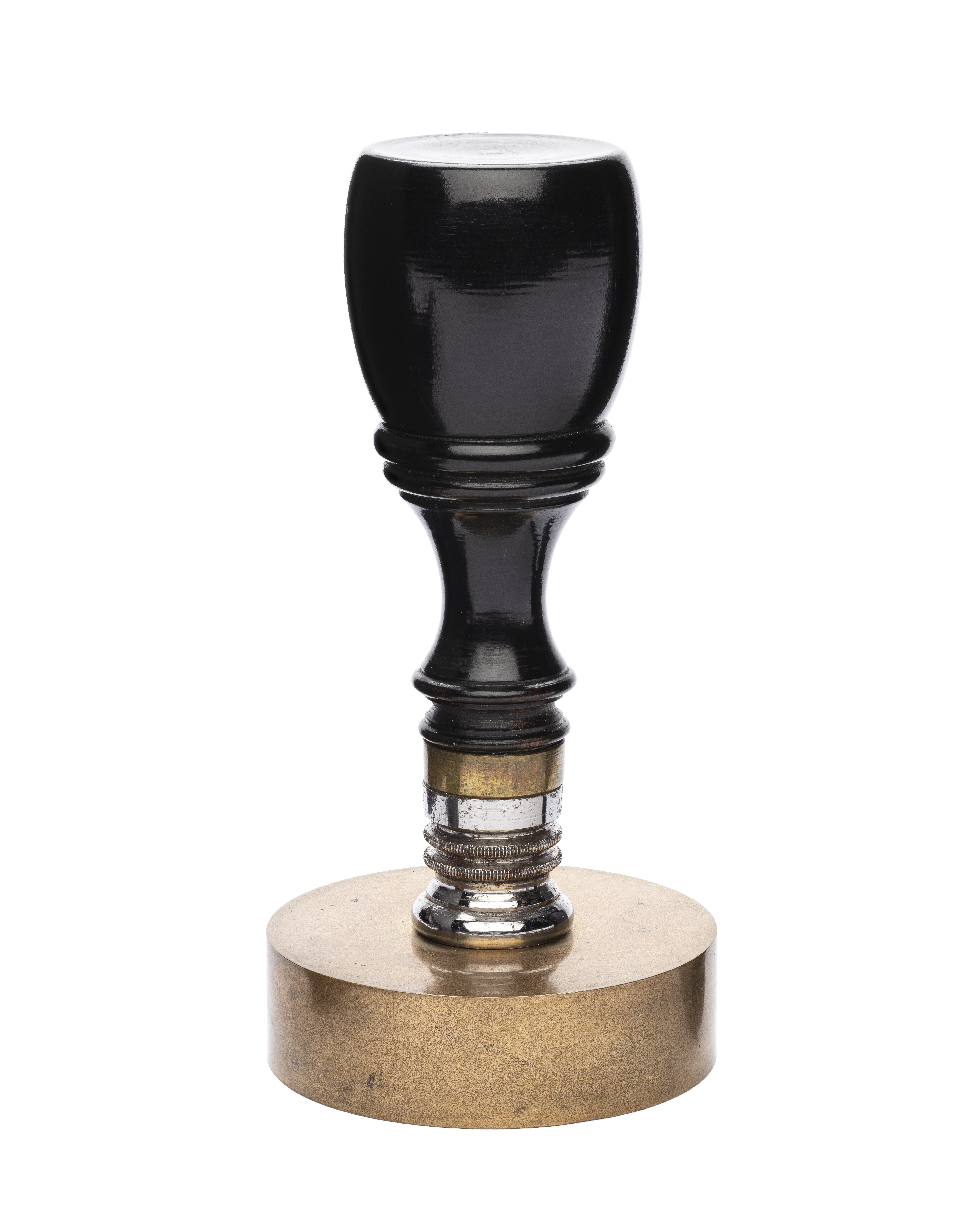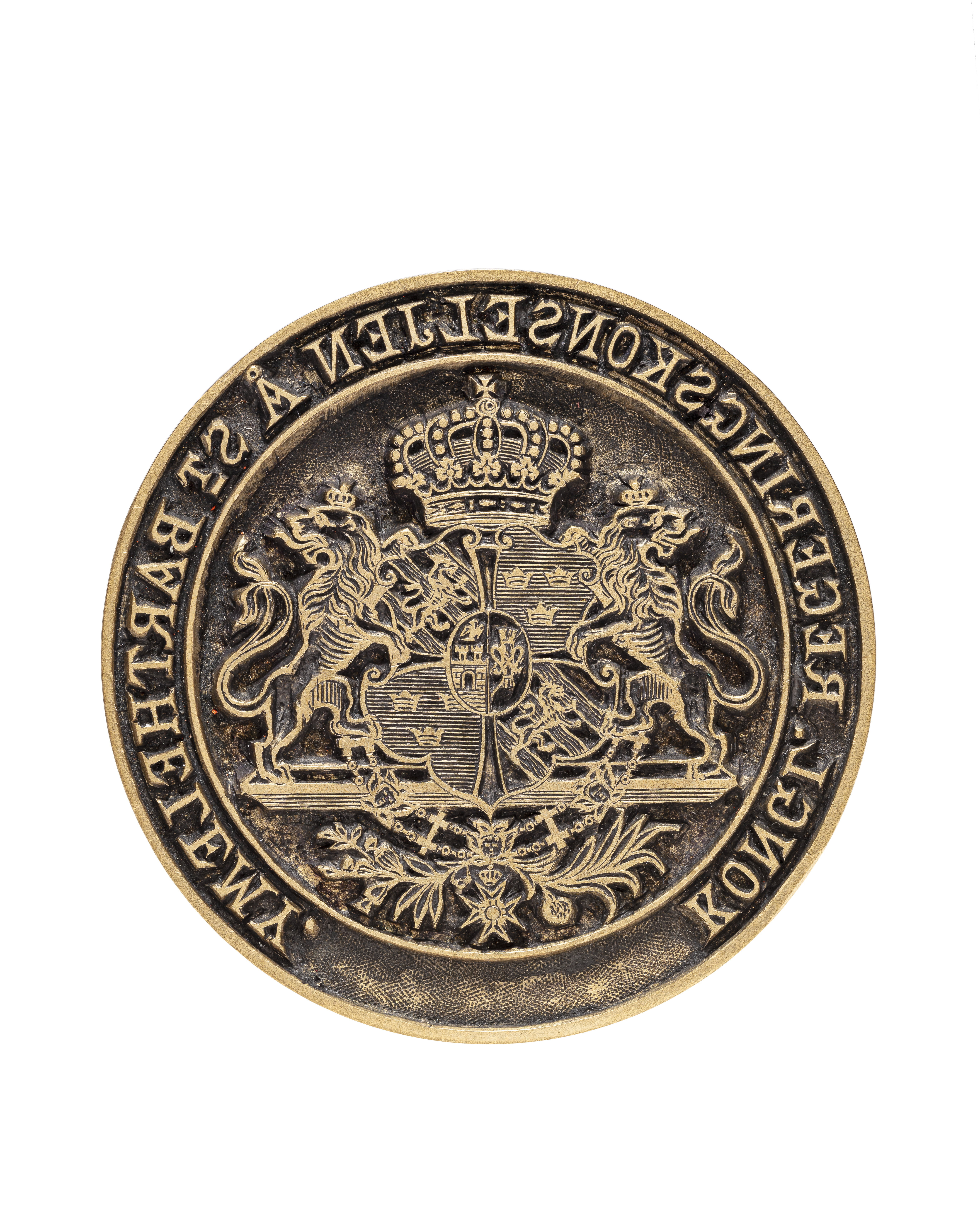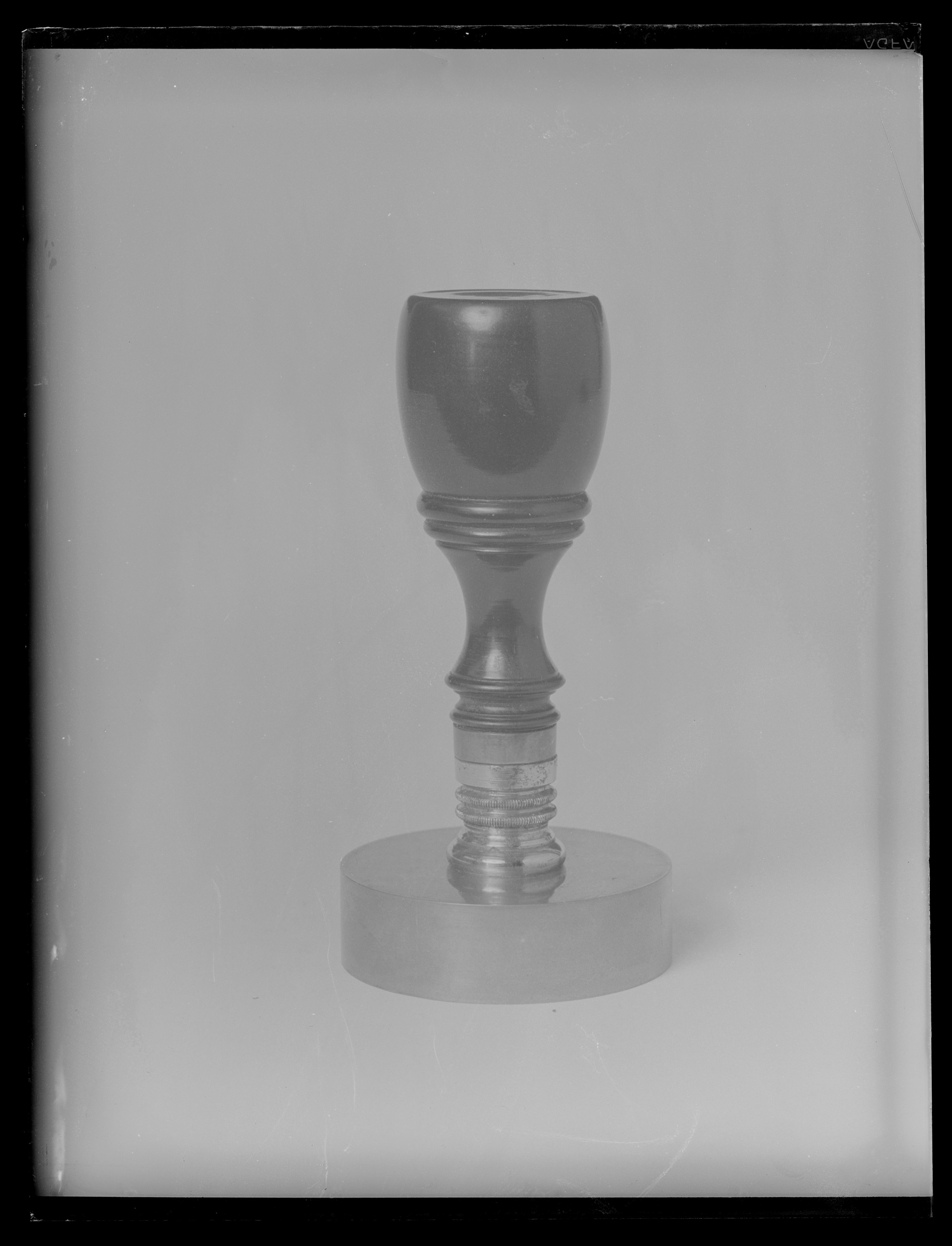 Cylinderformig platta av mässing, nedgraverad yta, däri utsparat vapen, sköld av renässanstyp, kvadrerad med ett utböjt kors, tre kronor, folkungalejonet, oval hjärtsköld, Vasa och Bernadotte. Skölden krönt med kunglig krona, sköldhållare två krönta tillbakaseende lejon, rakt postament, nedanför skölden hänger Serafimerordens kedja med tecken, nedanför postamentet två korsade palm- och lagerkvistar. Spegelvänd omskrift: "KONGL.REGERINGSKONSELJEN Å S:T BARTHELEMY". På plattans ovansida gängat hål. Däri skruvat skafthållare av stål, svarvad i flera räfflade ringar, nertill gängad tapp. Svarvat skaft av svartbrunt trä (ebenholts?) i pokalform, timglas formig nederdel, tunnformig övre del med svagt skålad översida, d: 33 mm. Nertill på skaftet mässingsring, h: 4,6, d: 16,3.