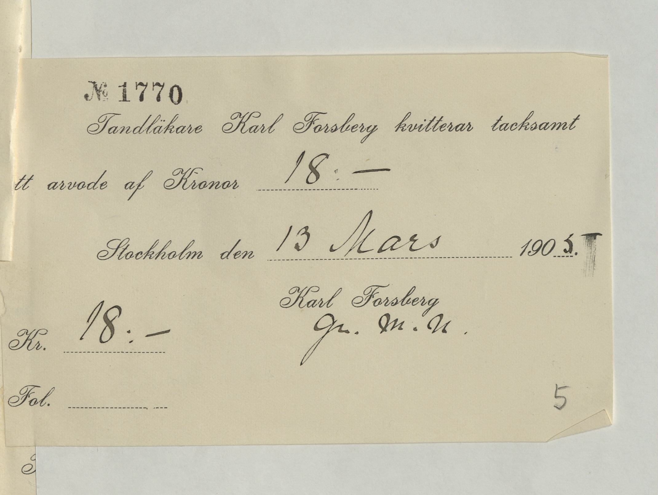 Räkning för tandläkarbesök. Utdrag ur katalogverket: "Karl Forsberg. 1900 — 1922."