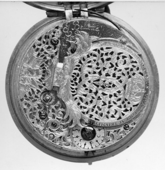 Fickur av guld, s.k. "montre à guichet", titthålsur. Tim- och minutangivelse sker genom två fasta visare och två svängda öppningar, täckta av två blånerade och förgyllda skivor med signering: BELLETE respektive LONDON. Bakre verkbotten (watch cock,?) med graverad signatur, två rader: "J. Bellette // London". Till höger liten tavla av silver (?) med gradering 1-6 med kvarts- och halvtimmesmarkeringar. Däröver en rund, genombruten platta från överkanten till strax under mitten. Därpå Karl XII:s krönta namnchiffer omgivet på vardera sidan de svenska tre kronorna. Längs kanten dedikation: CAROLUS DUODECIMUS VIVAT FLOREAT TRIUMPHAT. Nertill två sammanbundna palmkvistar, förbundna med cirkelsegment till nederkanten. Därpå rankverk och trofégrupp med antikt harnesk i mitten, kanon, fanor, trumma mm. På inre boetten(?) engelska guldstämplar för 1700-1701, Leopard's head och Lion passant samt I W.