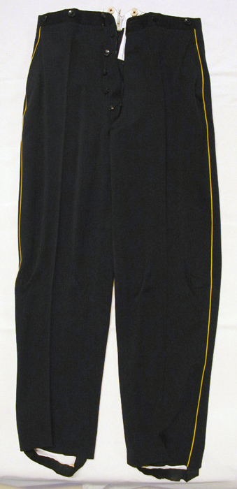 Långbyxor av mörkblått ylletyg av gabardintyp, gula passpoaler i sidsömmarna. Nedtill svarta tyghällor med gummitrådarna uttorkade, fästa i blå, skålformiga plastknappar, på utsidan märkta: " MILITÄR EKIPERINGS A. B. ", d: 14 mm. Gylf med enkelradig dold knäppning om sex knappar, som föregående d: 14 mm. Upptill hake och hyska. Upptill vid byxkanten fyra blå knappar utvändigt och två vita invändigt, som föregående, d: 17 mm. Två sidsömsfickor och en stolpficka bak. Linningen fodrad med vit bomullssatäng med smala bruna ränder. I fodret en slejf av det tyget som knäpps vid gylfen, med påsydd vit sidenetikett med kungligt vapen och: " MILITÄR EKIPERINGS a.B. // KUNGL. HOFLEVERANTÖR // MEA // Stockholm, den 21:1 1928 // Herr H. K. H. // Prins Gustaf Adolf ". Fickfoder av ljusgrå yllekypert. Baktill tygögla.
