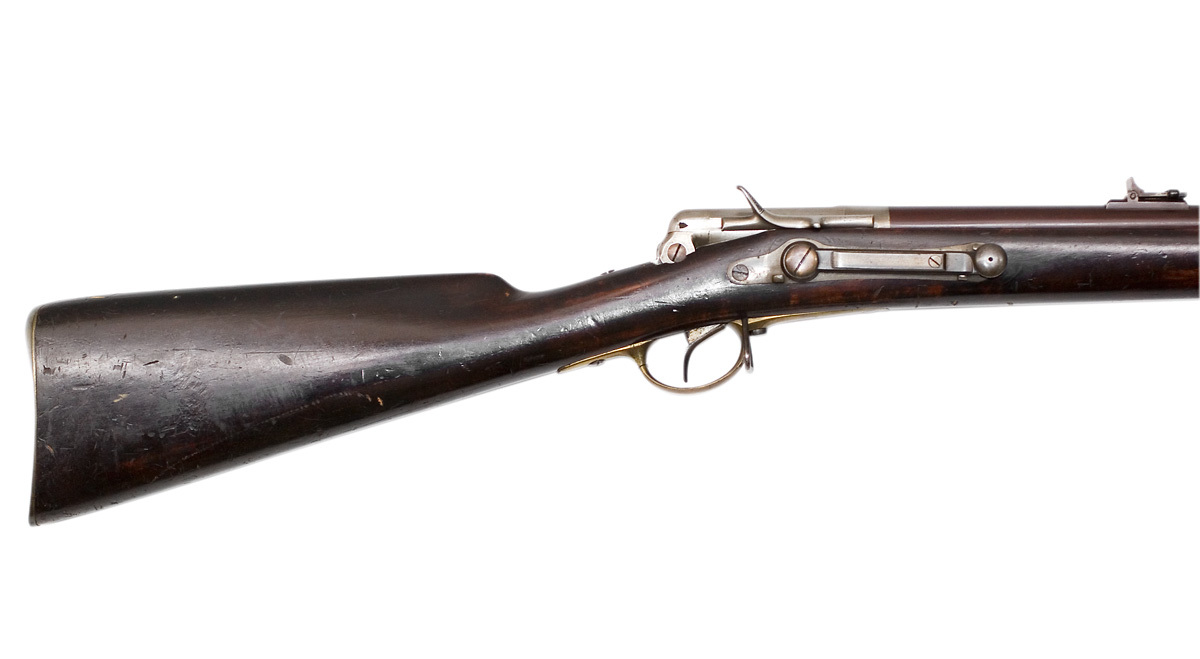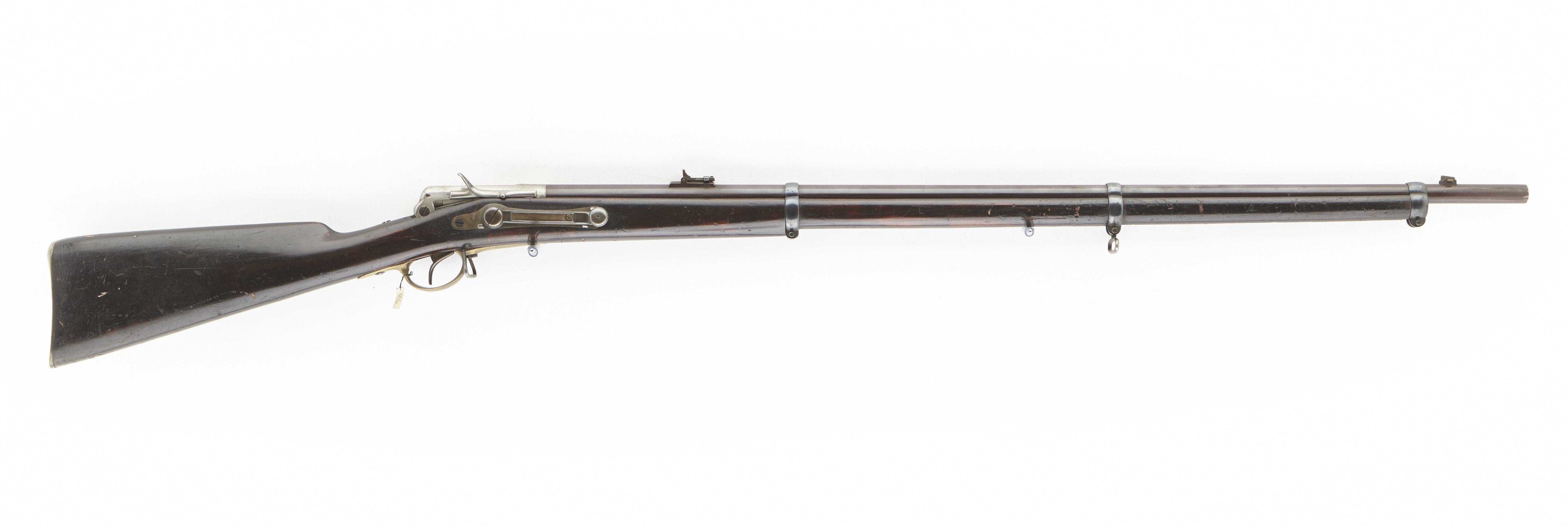 Rund, brunerad, sexräfflad pipa, stämplad på undersidan: 4. På pipans v sida 36 mm från mynningen en klack för bajonett. Riktmedel: Ramsikte av flamhärdat stål med blånerad löpare, stolpkorn av mässing. Fästning: Tre pipband av blånerat stål, på mittbandet en rembygel av blånerat stål, banden stämplade 4. Tändnålsmekanism av gråanlöpt stål, bottenjärn stämplat på undersidan 4. Slutstycke med tändnål och invändig spiralfjäder, stämplat på undersidan 4, på ovansidan ett nätskuret tumläge. På slutstyckets h. sida skena som står i förbindelse med tändnålen, vid bakänden ett nätskuret tumgrepp. Slutstycksaxel med blånerad skruv. På stockens h sida ett låsbleck av gråanlöpt stål, tre skruvar. Därigenom går en excentrisk axel stämplad 4, hävarm av gråanlöpt stål, rörligt, skivformigt grepp med räfflad kant, d: 18,2 mm. På hävarmens utsida en bladfjäder med tand, som går igenom hävarmen. När hävarmen lyfts griper tanden tag i ett utskott på tändnålsskenan och drar tändnålen i halvspänn. Kraftig, böjd avtryckare. Helstock av mörkt brunbetsad björk(?), framstock avtrappad i två avsatser för pipbanden, framstocken slutar 95 mm från mynningen. Beslag av mässing, bakplåt med rundad flik på kolvryggen, avtryckarbleck och varbygel med lång främre arm och kortare bakre arm med rundade ändar. I urtag på insidan vid framstolpen fäst en rembygel av stål.