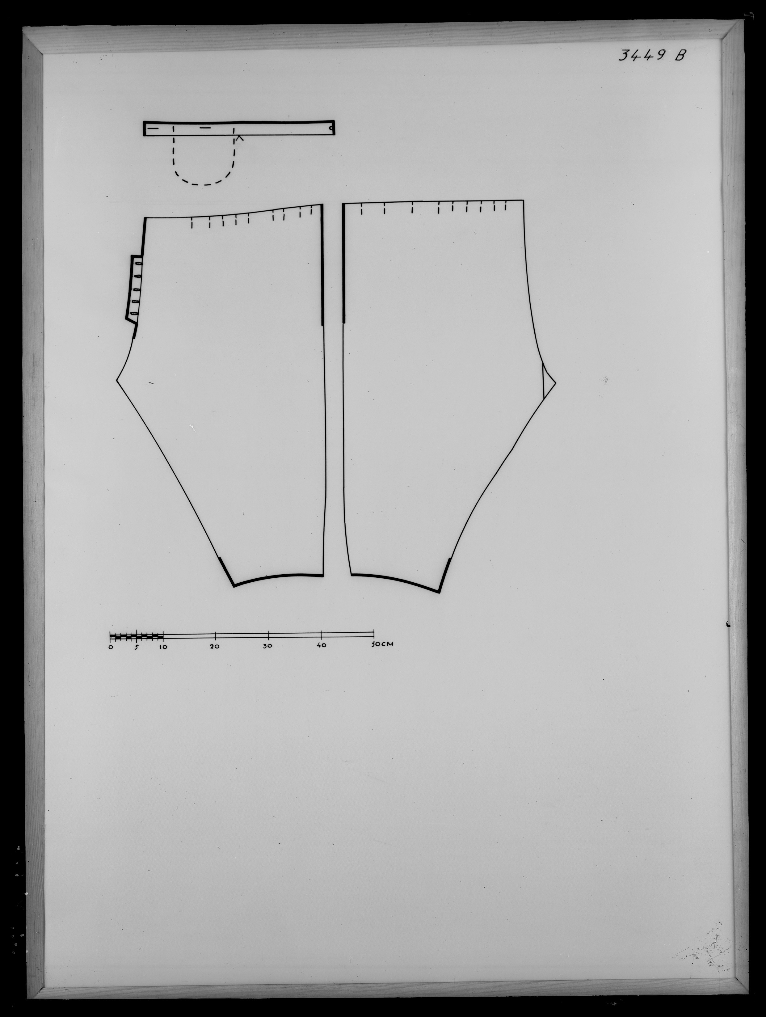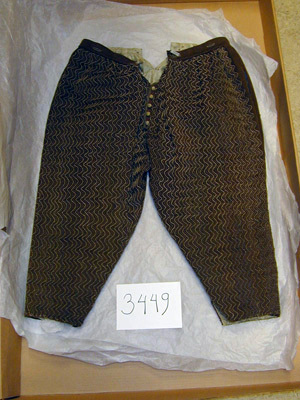 Byxor av brunmelerat "muscusfärgat" kläde, rynkade i linningen med ett 3 cm brett linningsband av lika kläde. Mitt bak ett snörhålsförsett sprund som är midjeviddsreglerande. Mitt fram sprund med knäppslå med fem knoppformiga knappar av guldtrådssnörmakeri. Sprundficka i sidsömmarna, 22 cm:s öppning. Ytterligare en liten ficka i linningen i vardera sidan, som knäpps med knapp i linningen, den vänstra knappen saknas. Nertill på vardera byxbenets insida är ett 6,5 cm lång sprund. Över hela ytan ett vågformigt tätt mönster bildat av omväxlande guldsnören och snören av brunt silke. Foder av ljus taft, skört och tidigare delvis konserverat.