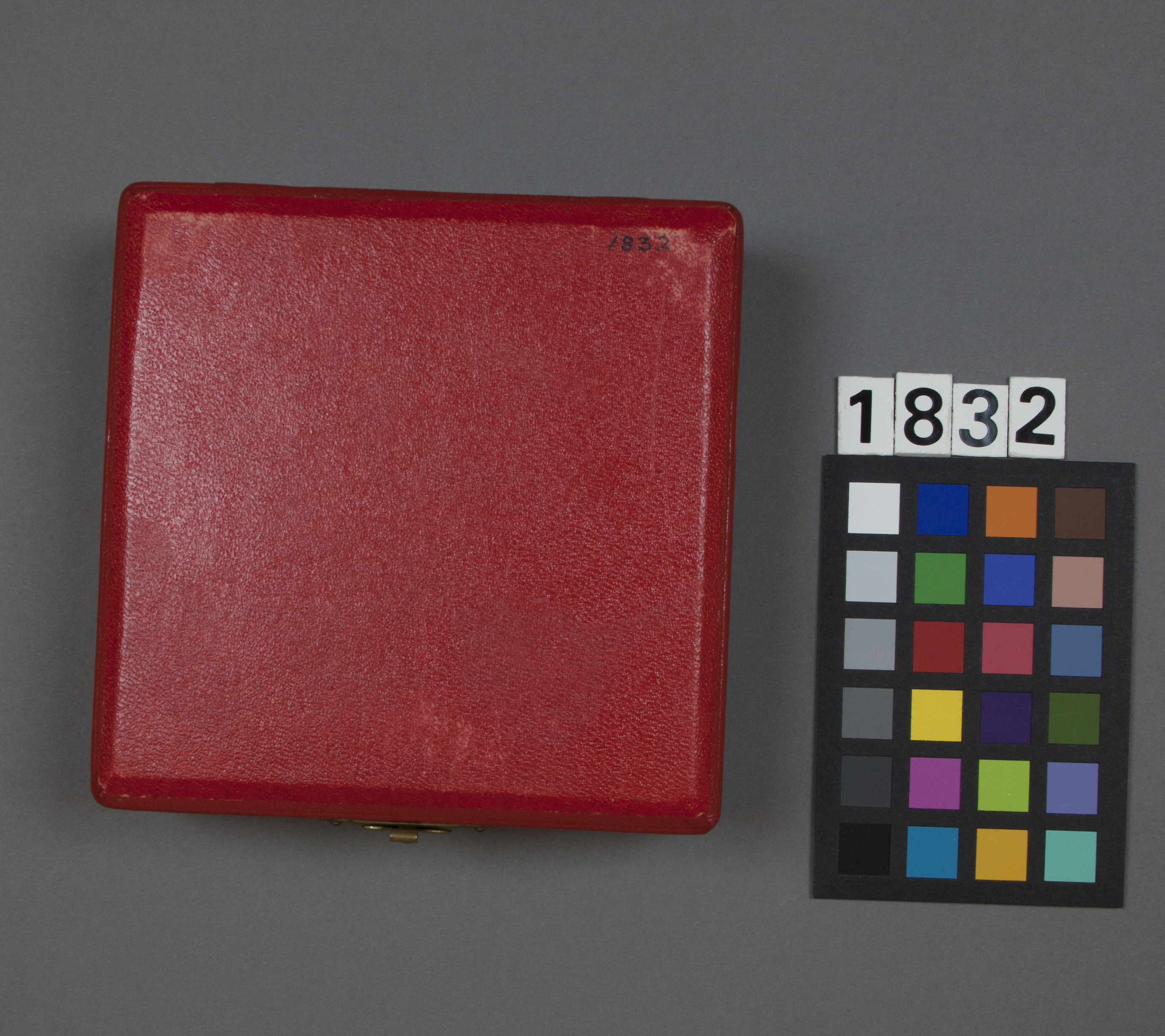 Fyrkantigt etui av trä, utvändigt klätt med rött skinn på locket. Två bårder i guldtryck, samt i mitten namnchiffer för Gustav VI Adolf. Knäpplås av mässing. Locket invändigt fodrat med gult siden, delvis utplånat firmamärke i guldtryck, hovjuvelerare C F Carlman, Stockholm. Underdelen klädd med svart sammet, urtag för kraschanen.