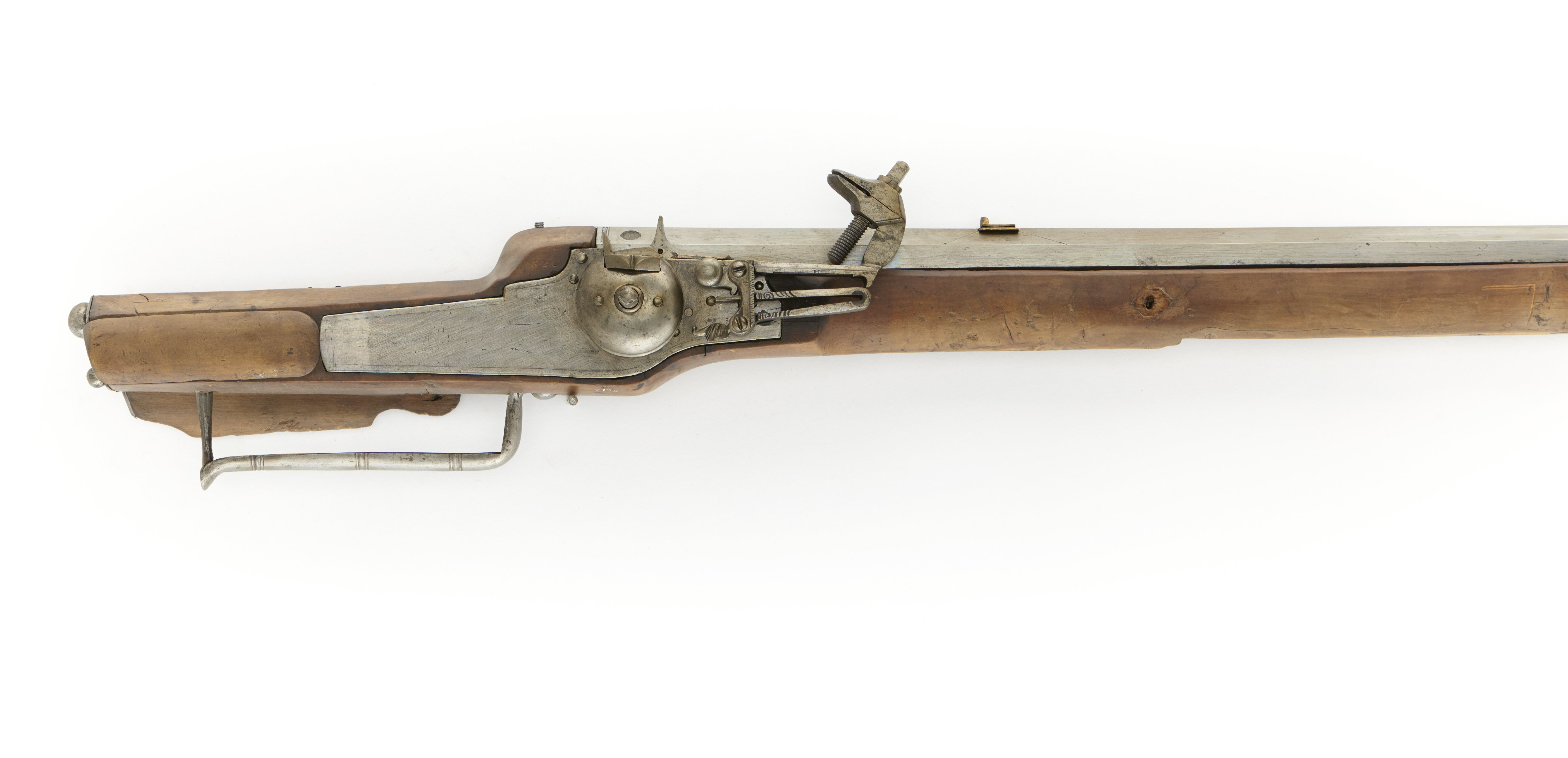 Sexkantig, slätborrad pipa av stål. Svinrygg. På kammaren två gånger stämpel slagen i mässing: "CL" över lilja (Stöckel a 2245). Ståndsikte av mässing med från vardera hörnet utgående (i pipan graverade) streck. Knoppkorn av mässing. Siktskåra från korsskruv till korn. Hjullås. Låsbleck av tysk typ - bakåt avsmalnande genom två fall. Hög, kullrig hjulkapsel. Låg vertikal krutskärm. Hane med lös underkäke. Hel stock av ljust trä. Tysk kolvtyp. Bakplåt samt en större och två mindre stödkulor av stål. Två låsskruvar med hjorthornsbrickor. Tre pipstift - ej ursprungliga, vilka likaså har brickor av hjorthorn (fyra saknas). Näsband och rörka saknas. Trågformig varbygel, s.k. holsteinsk. Avtryckaren avbruten. Tillbehör: Laddstock med doppsko av horn. Krats. Märkt: 650 ovanför låsblecket, stanstyp 5376. 121 med blyerts på anslaget. 1710 års inventarium p. 11, rum II: " 17-650-1 D:o (Svinrygg) med blanck pijpa".