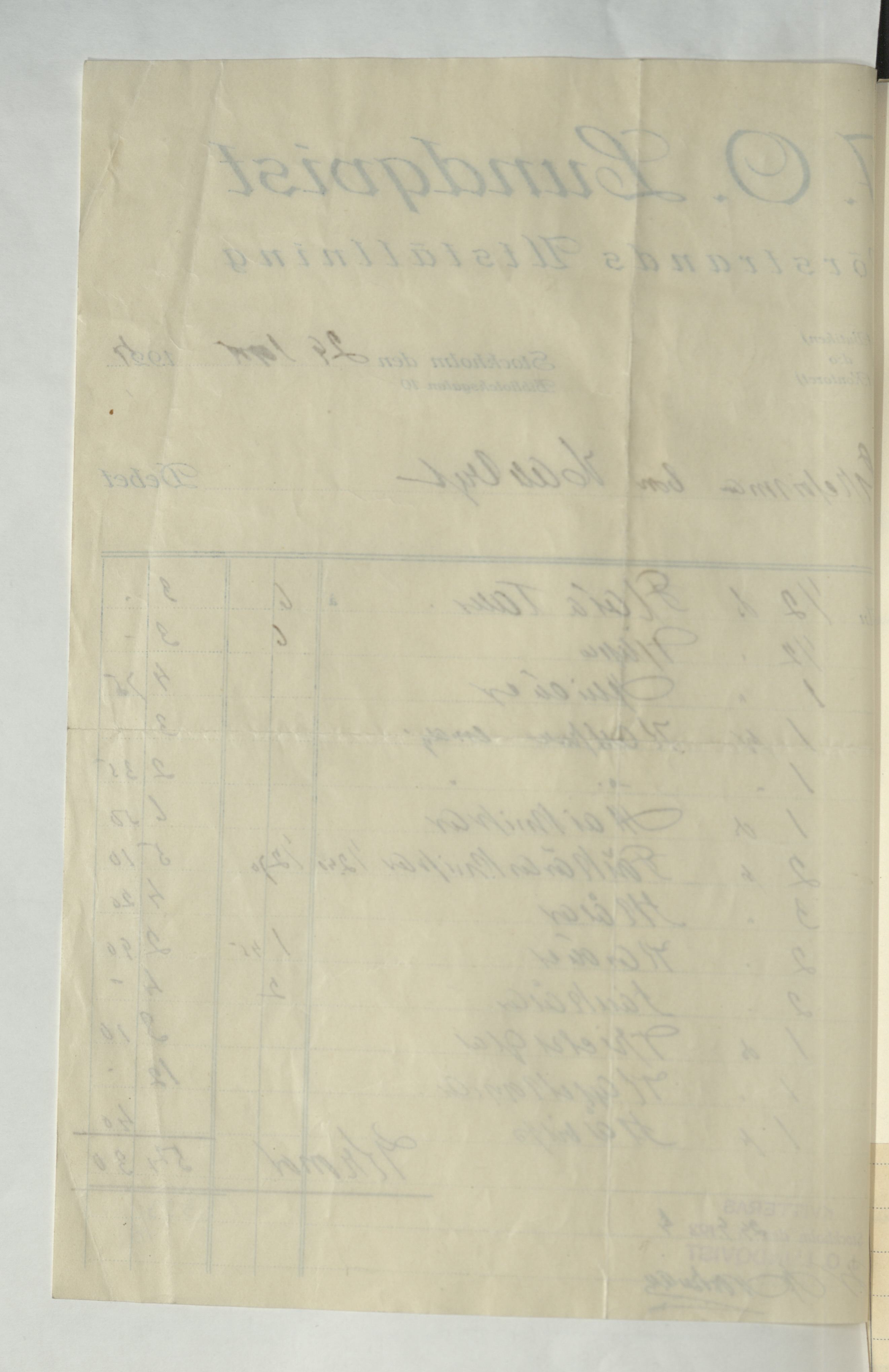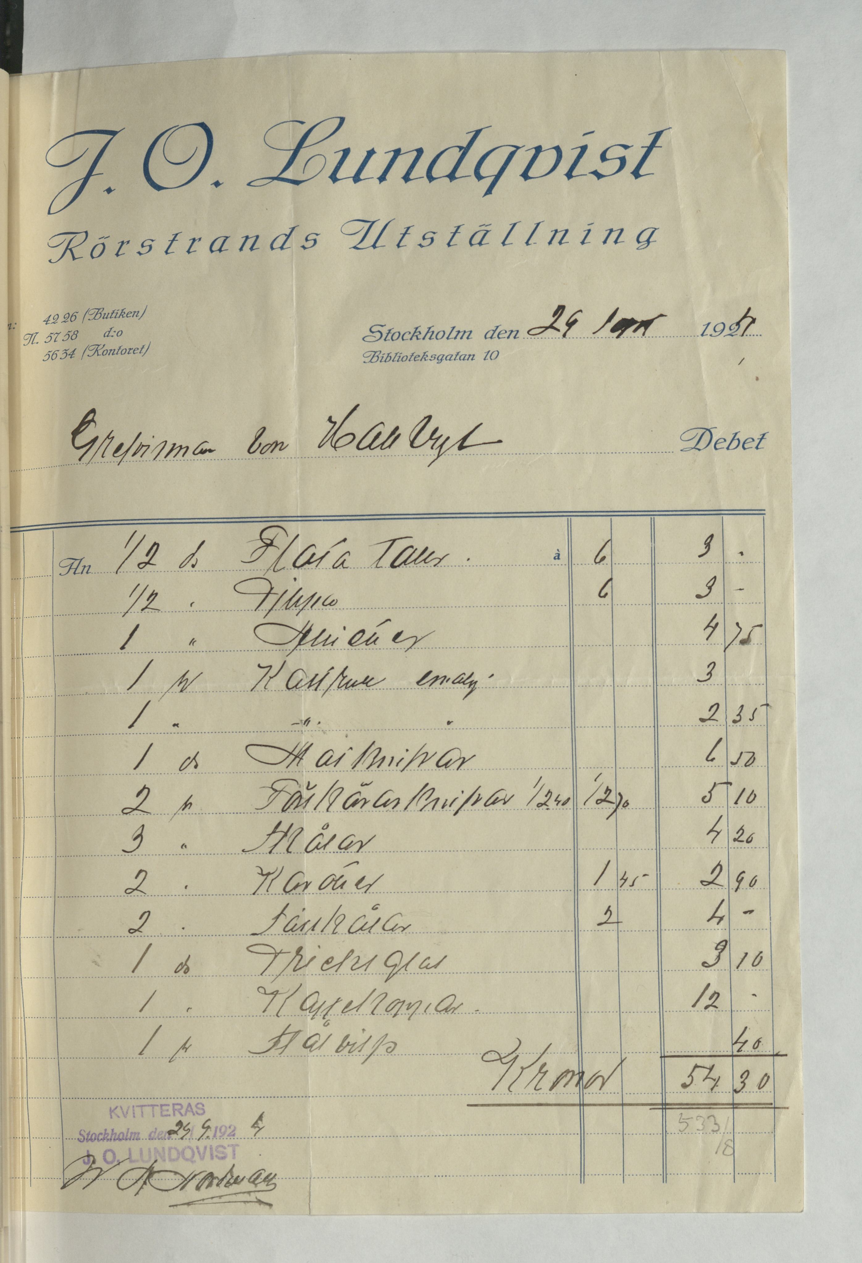 Kvitto till Fru Grevinnan Hallwyl för inköp av porslins- och hushållsvaror, hos J. O. Lundqvist, Rörstrands Porslins-Magasin, Rörstrands Utställning, för en summa av 54:30Kr. Stockholm, 1927.