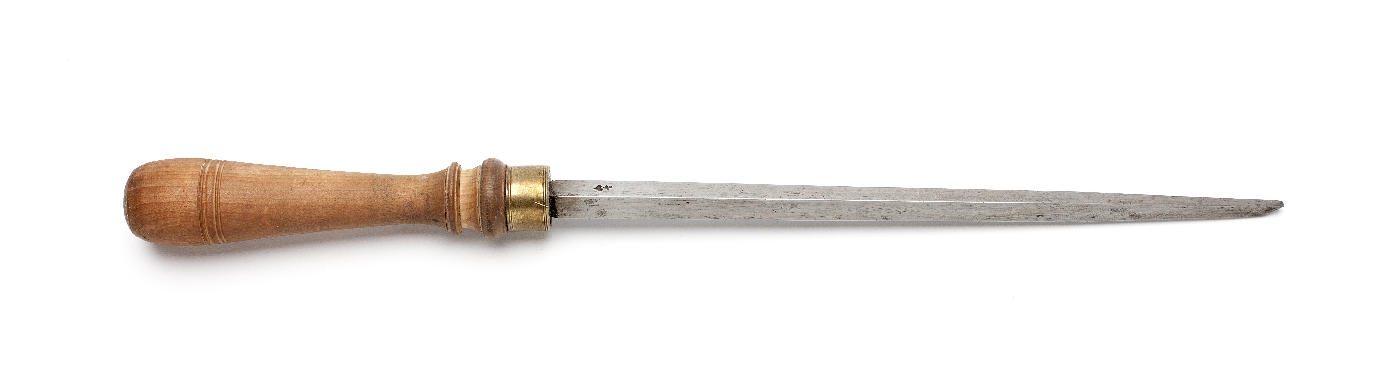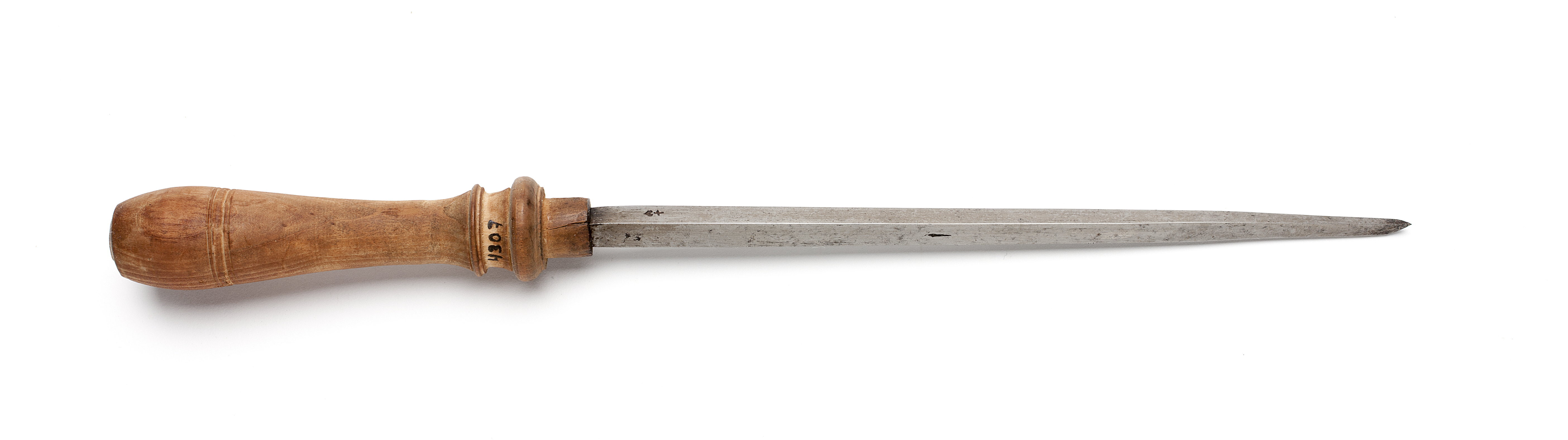 Klinga med rektangulär genomskärning. Egg i spetsig vinkel mot stålet. Stämplat på klingan: hjärta under kors. Svarvat skaft av päronträ, med två vulster nedtill ("rydboholmstyp").