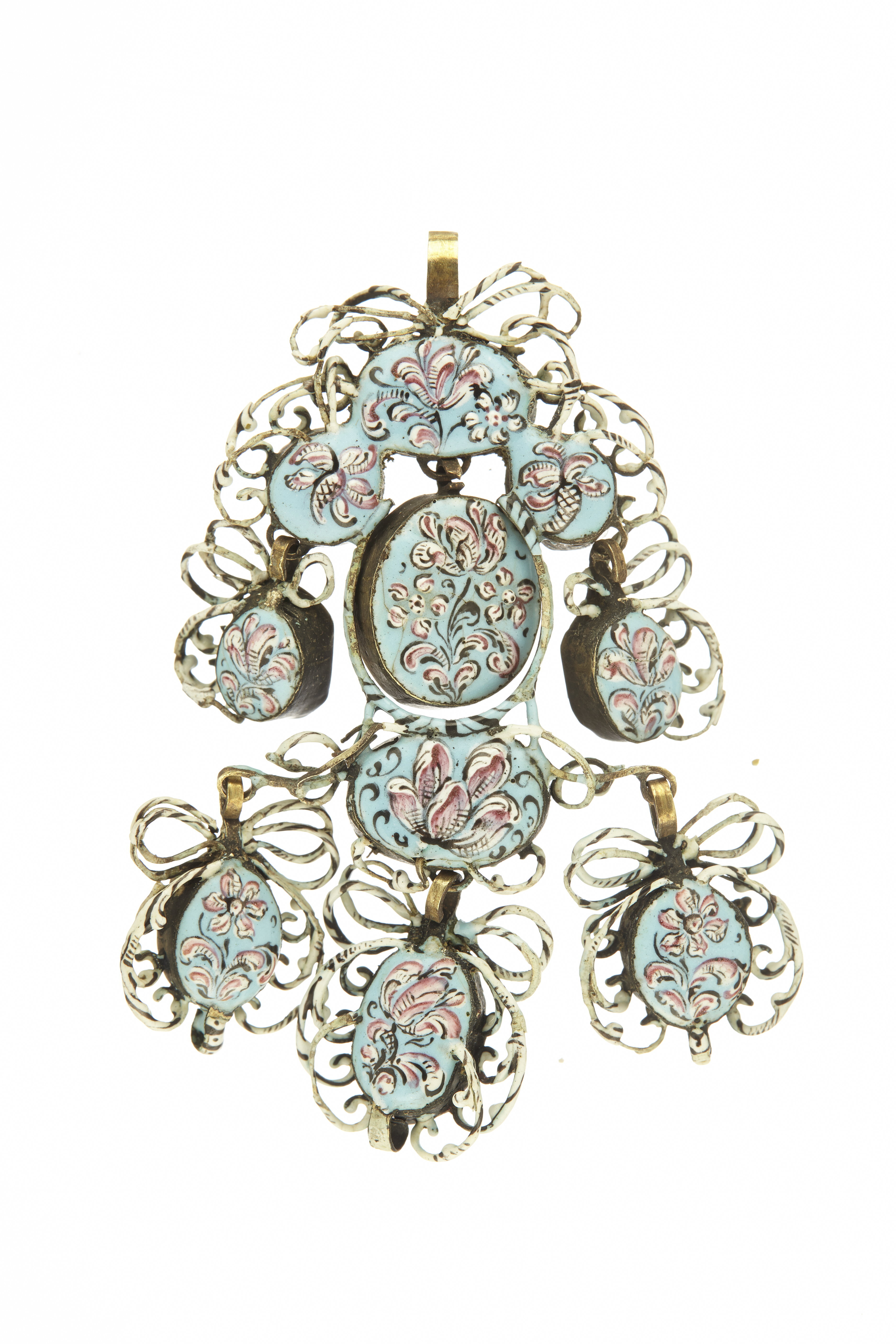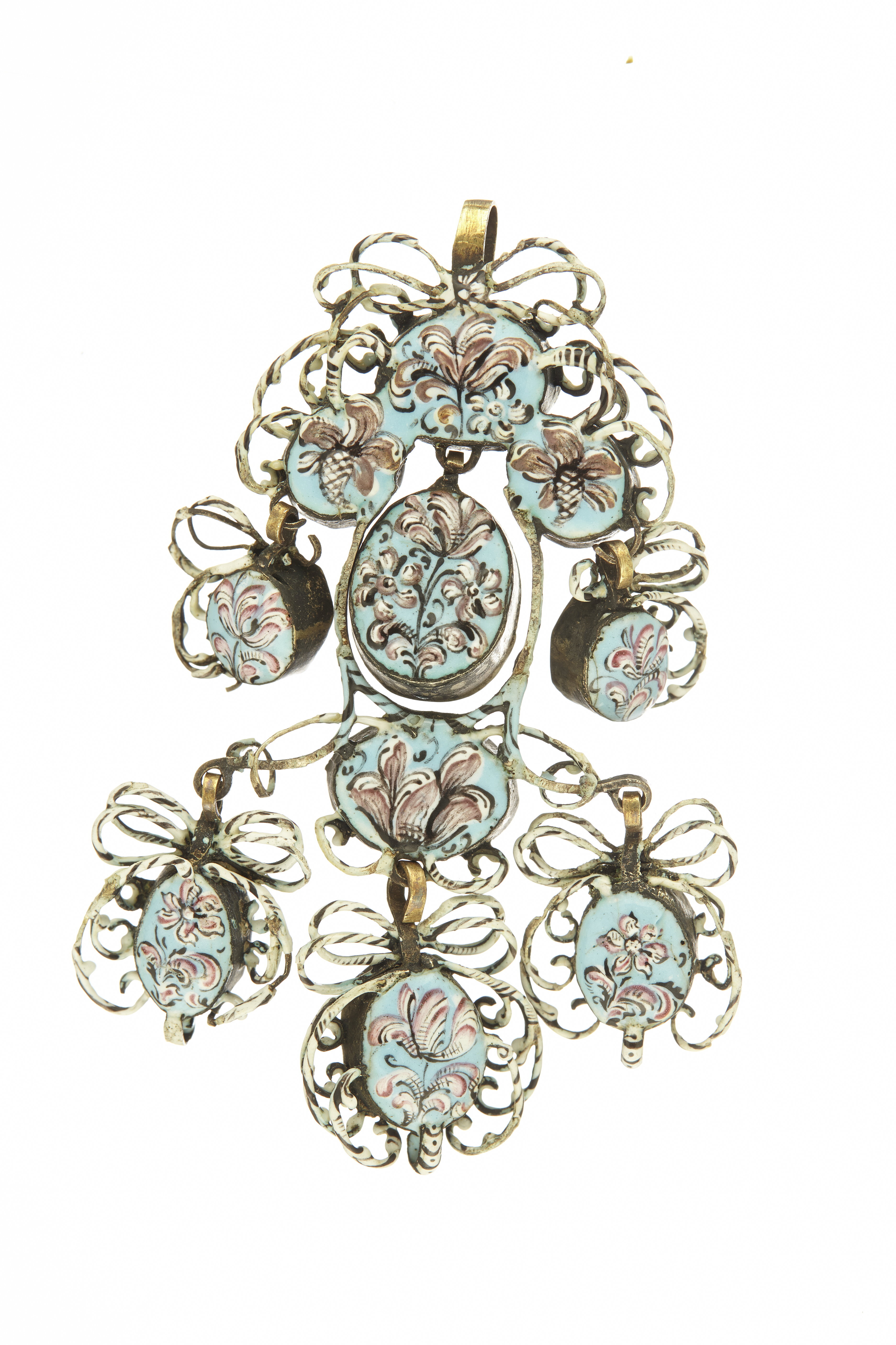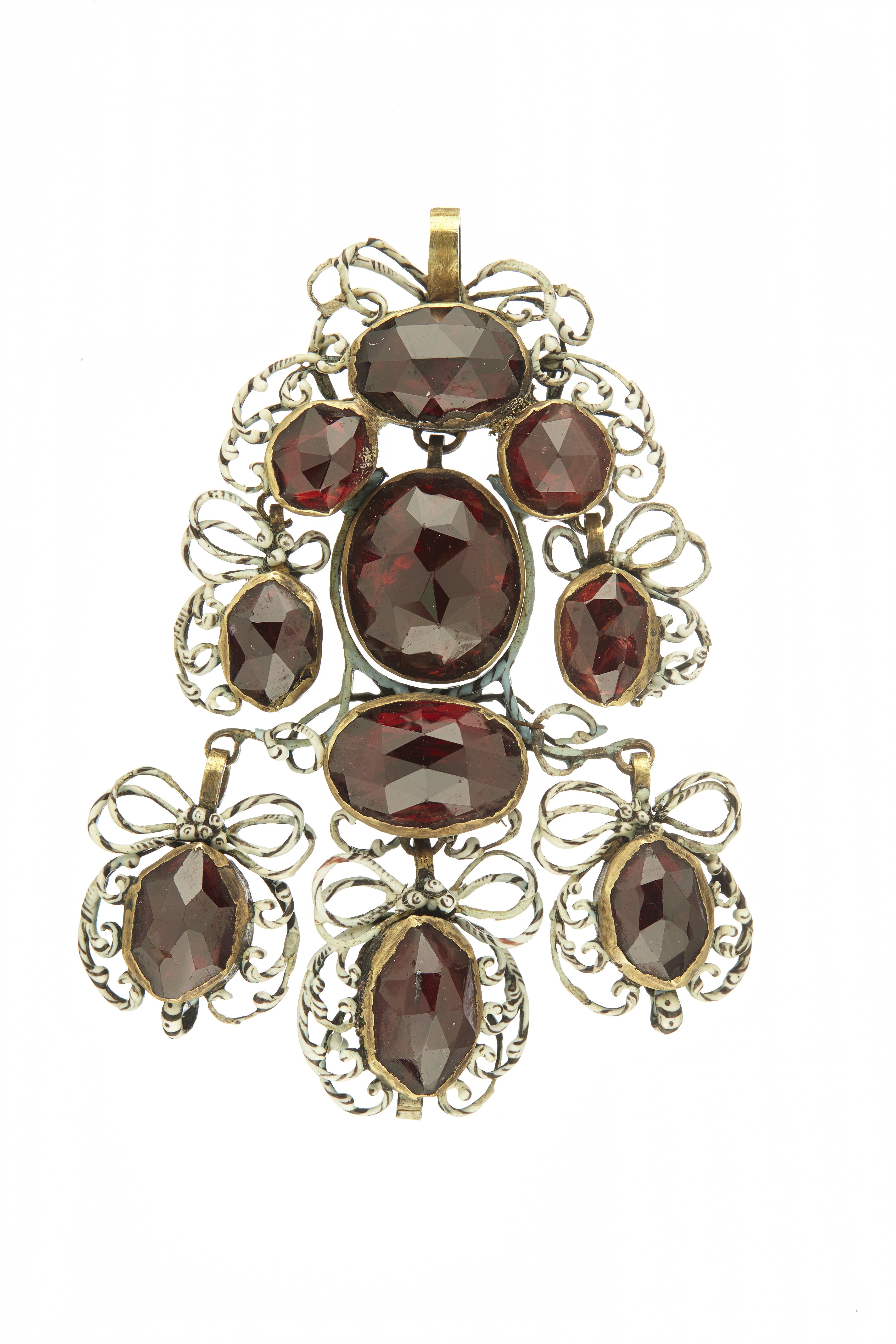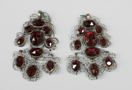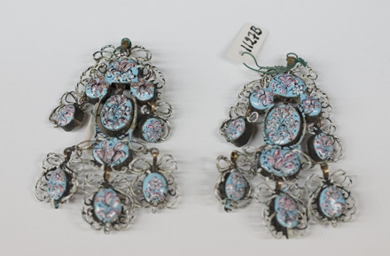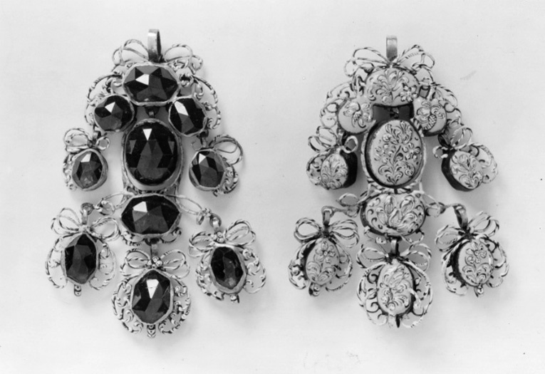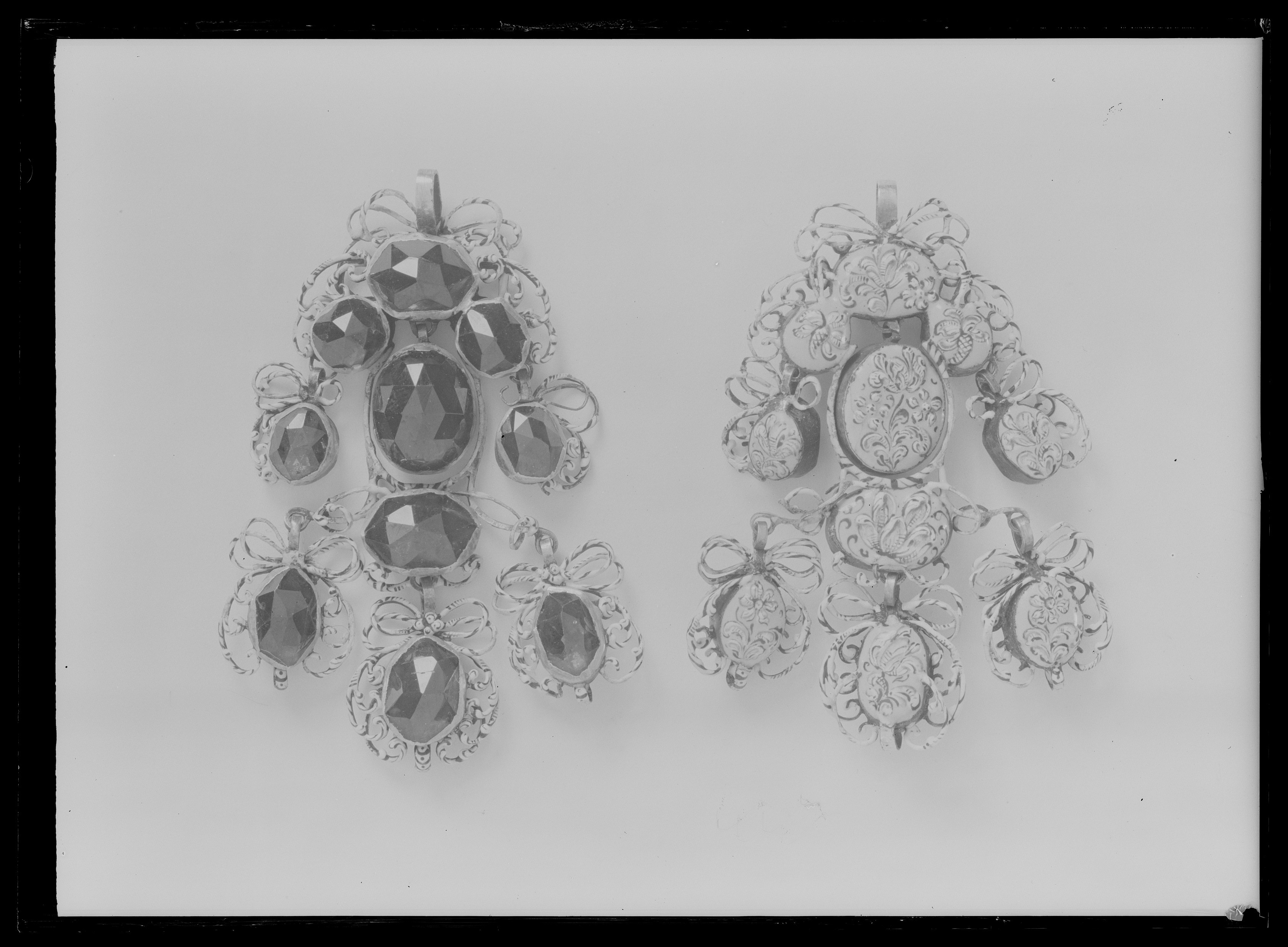 Ett par (a-b). Av silver. 10 st fasettslipade granater av olika storlek,slät fattning, omgivna av lövverk av silver, emaljerat i vitt med svarta detaljer. Fattningarnas baksidor täckta av turkosblå emalj med vita blommori relief, detaljer i rosa och svart. Förvaras i brun pappask.
