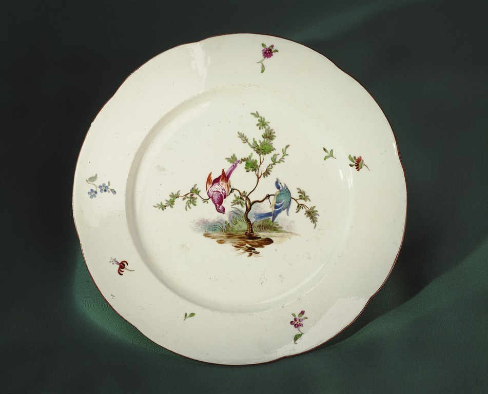 Rund, flat tallrik med dekor av två fåglar i ett träd samt strödda blommor på brättet, i färger på glasyren. Daterad 1787 Fabriken grundlagd år 1755 av Paul Hannong och dennes son Charles. Pris: 10 Mk. Se rescontra Walther v. H. 11 juni 1896.