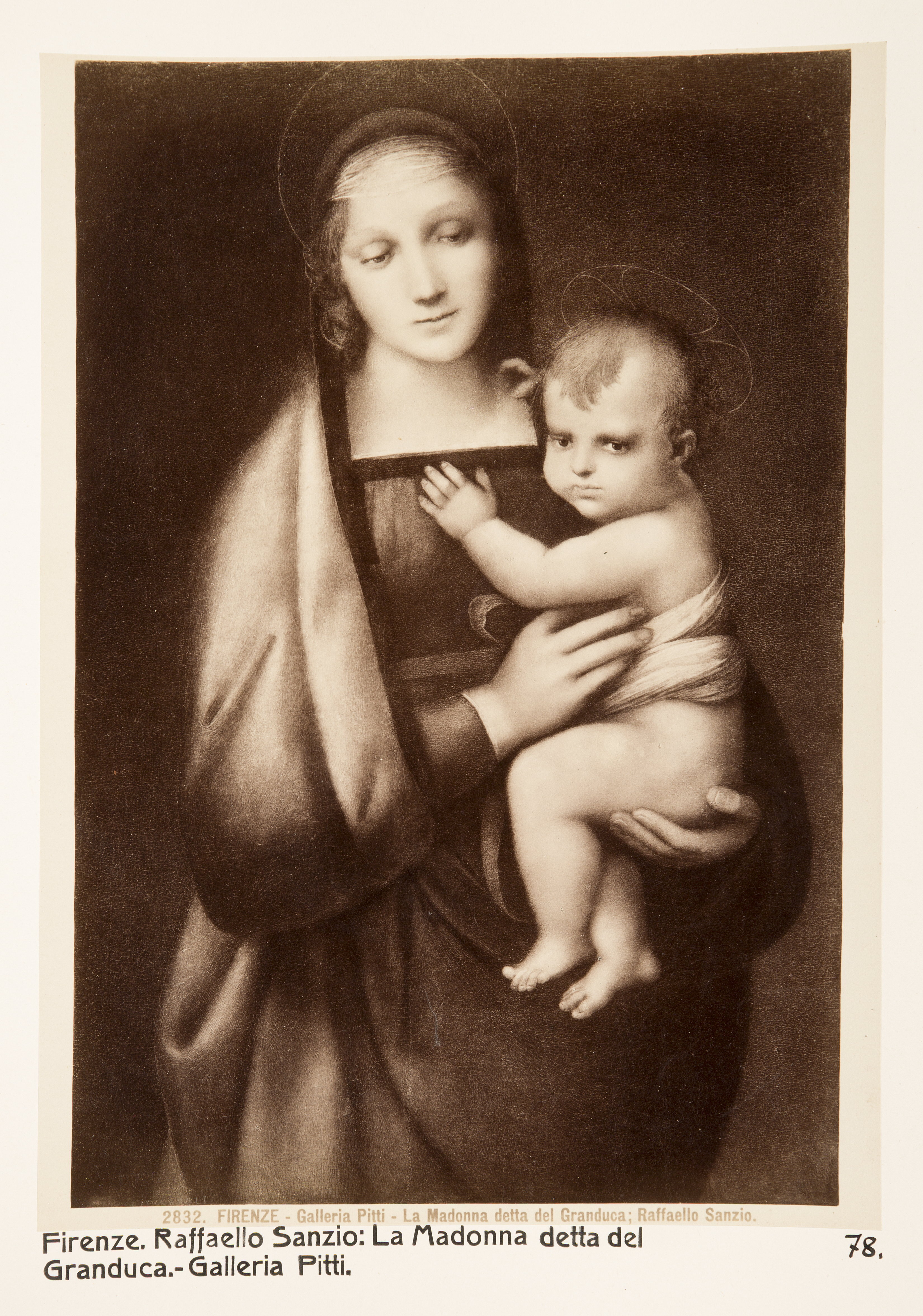 La Madonna del Granduca av Rafael. Galleria Pitti. Florens, Italien. Text på originalet: "Firenze - Galleria Pitti - La Madonna detta del Granduca; Raffaello Sanzio."-. Bilderna LXVI:K.C.01.-154. är inköpta av Johanna Kempe, f. Wallis, under en resa tillsammans med fröken Caroline Pflaum till brunns- och badorten Ems samt genom norra Italien och Rivieran, 10 augusti - 20 december 1883. Bilderna är köpta i Milano, Verona, Venedig, Bologna, Florens, Pisa, Spezia, Genua, San Remo, Menton, Nizza, Cannes, Marseille, Arles, Nîmes, Avignon och Turin.