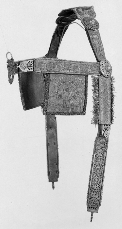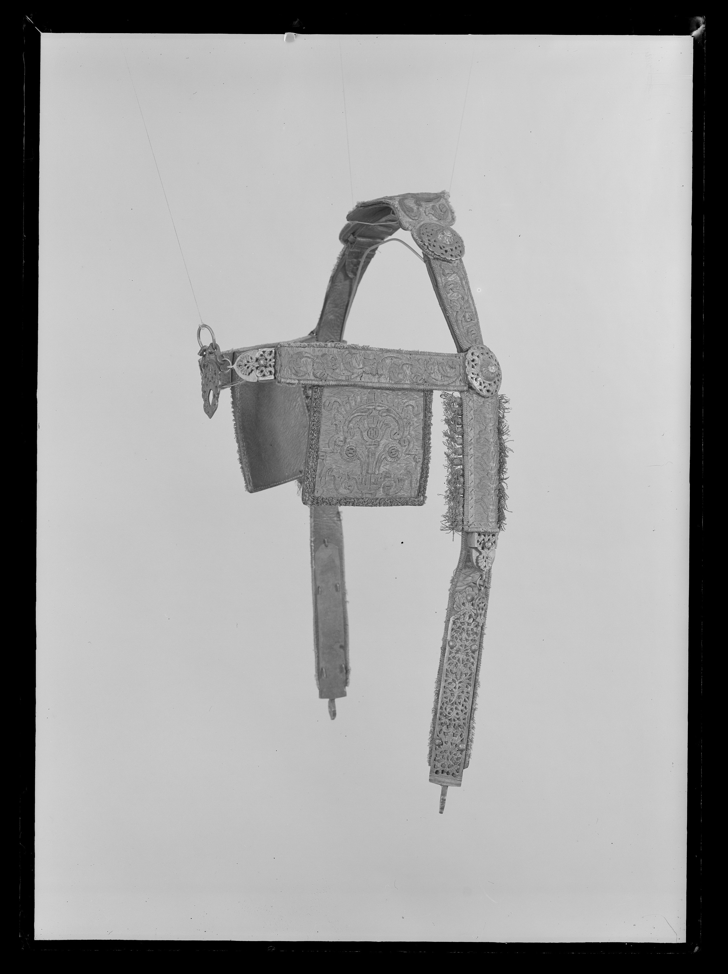 Huvudlag av bruna 34 mm breda läderremmar med yttäckande broderi av rankor med guldtråd. Sidostycken nedtill med 160 mm långa beslag av genombruten, ciselerad och förgyllt silver, förgyllning enbart på utsidan, nedtill tvärställd rund hållare. Från pannremmen och nedåt ett 104 mm långt stoppat fält kantat med 14 st små runda pomponger av guldtråd avslutade med tofs. Fältet avslutat nedtill med ett halvt spetsovalt beslag med genombruten dekor, från detta i ring hängande litet bladformigt genombrutet beslag. Sidostyckena övergående i nackrem, där med konturerad förstärkning fasthållen med två runda genombrutna beslag välvda på mitten. Tvådelad pannrem avslutad framtill med vardera ett halvt spetsovalt beslag sammanfogade med två S-formiga länkar med ring från vilken det hänger bladformig, genombruten stjärnkläpp. Där pannremmen utgår från sidostyckena stort runt genombrutet beslag. Samtliga beslag av förgyllt silver. Från pannremmen kvadratiska skygglappar fodrade med rött läder med lika dekor som den på huvudtaget i övrigt. På insidan av samtliga beslag otydlig rund stämpel inneslutande arabiska tecken.