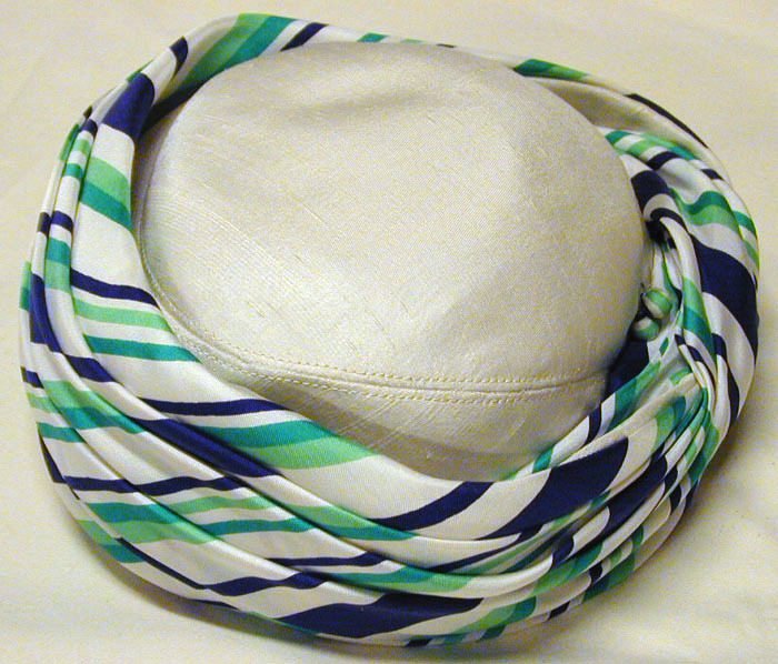 Hatt av vitt stråtyg med sidentyg i vitt, marin och grönt draperat runt kullen. Delvis fodrad med (konstfiber) tyll, över pannan ett blått sammetsband. Vit sidenetikett med Sibyllas vapen och text: "HKH PRINSESSAN // SIBYLLAS HOVLEVERANTÖR" samttillverkarens namn bredvid: "Röstbergs// STOCKHOLM". Datering: 1970-05-22. Tillbehör: Två hattnålar med huvuden klädda med samma tyg som hattbandet.