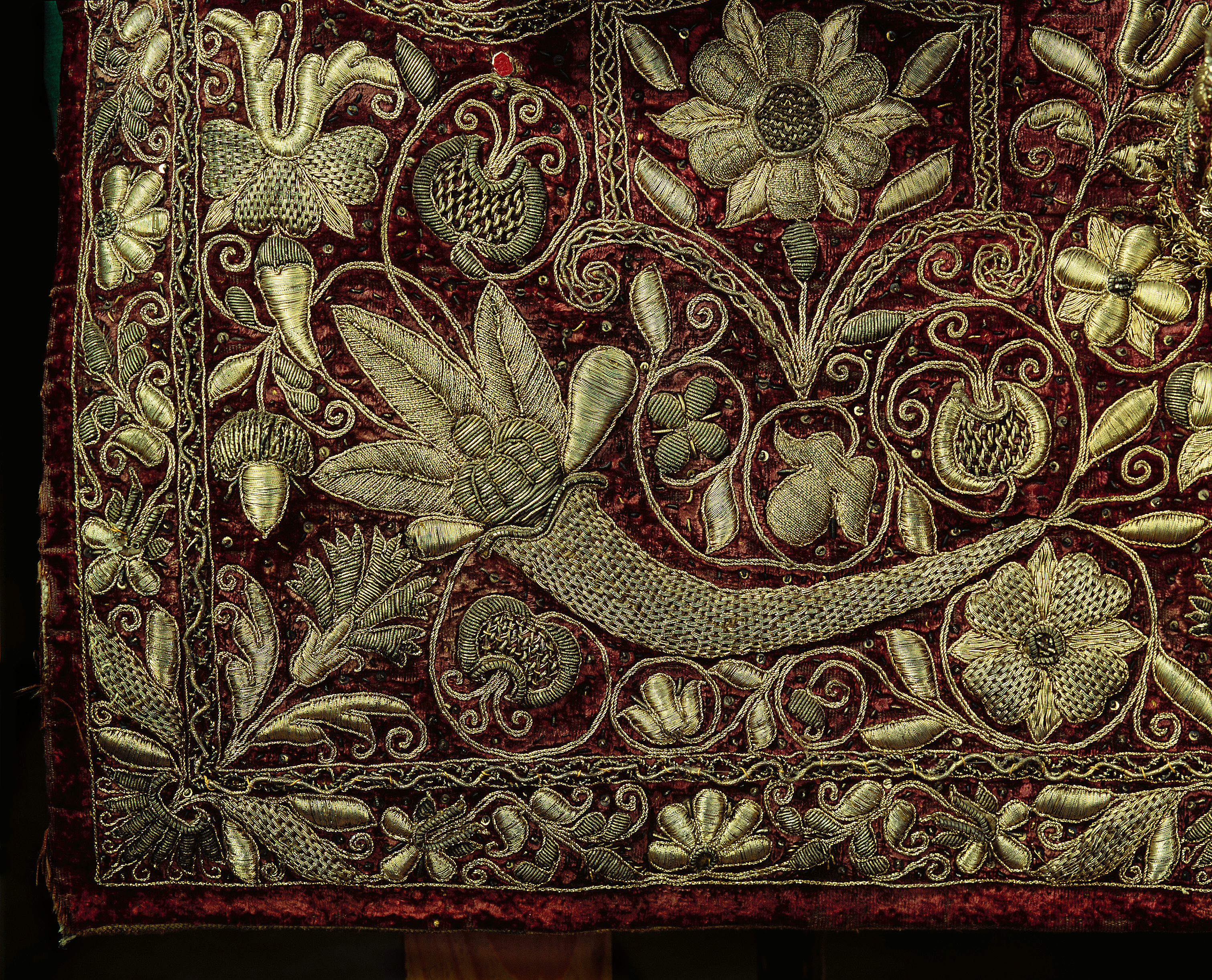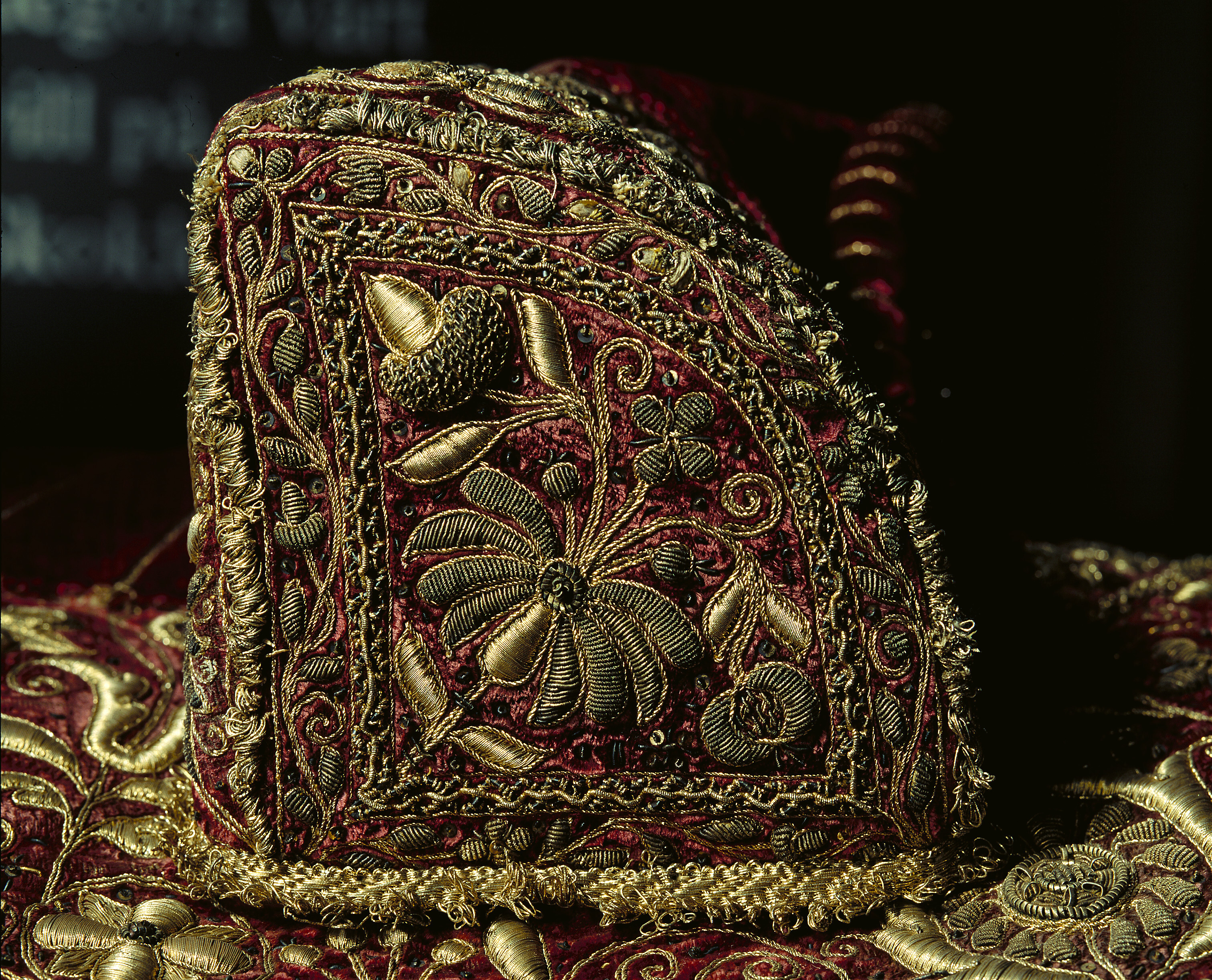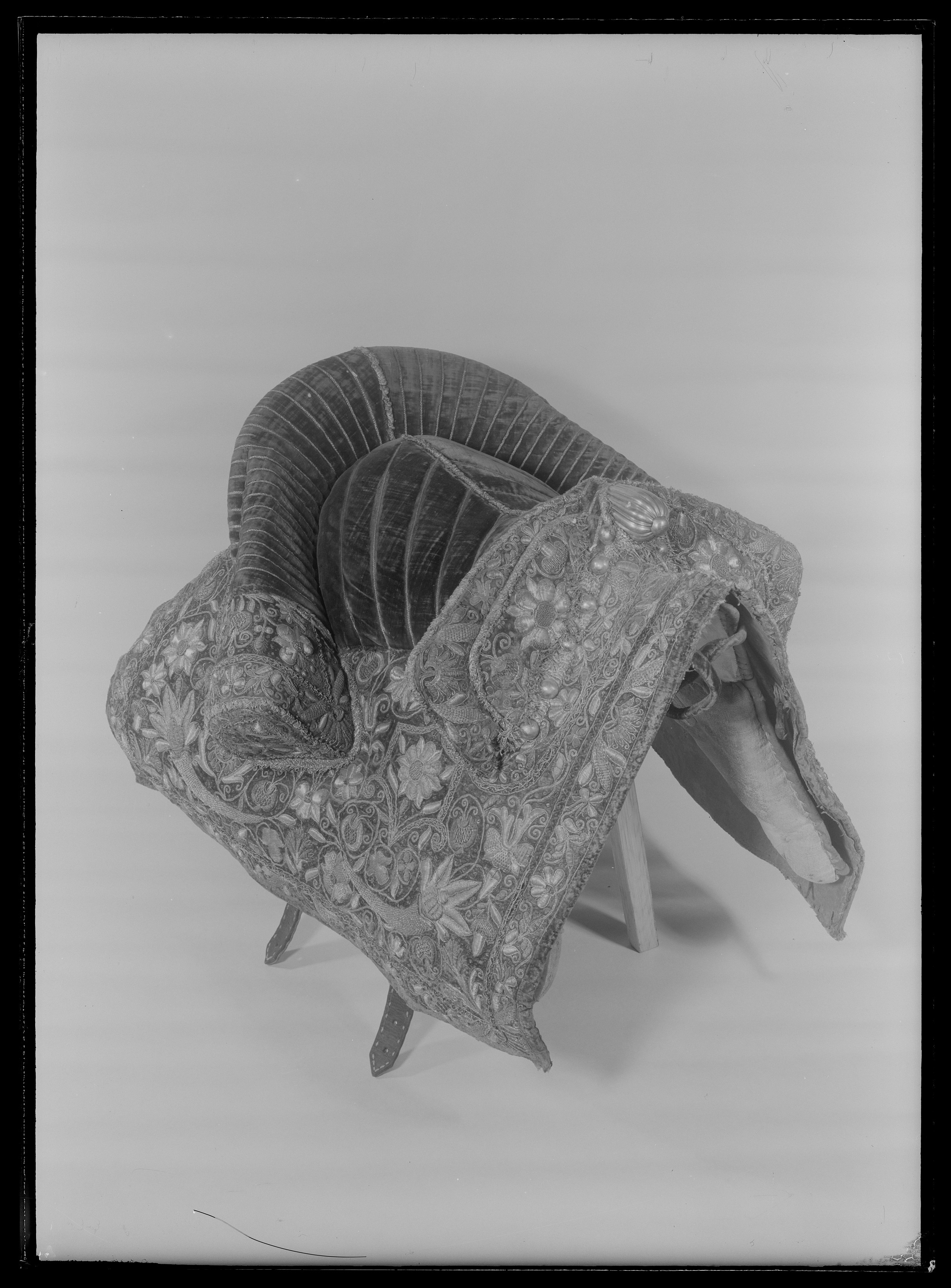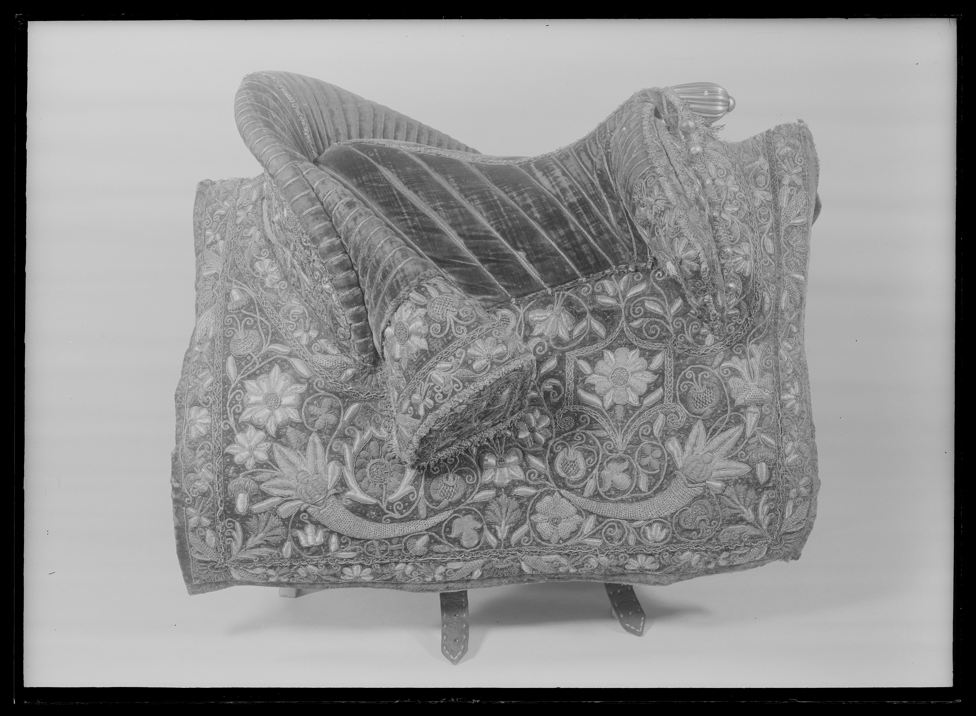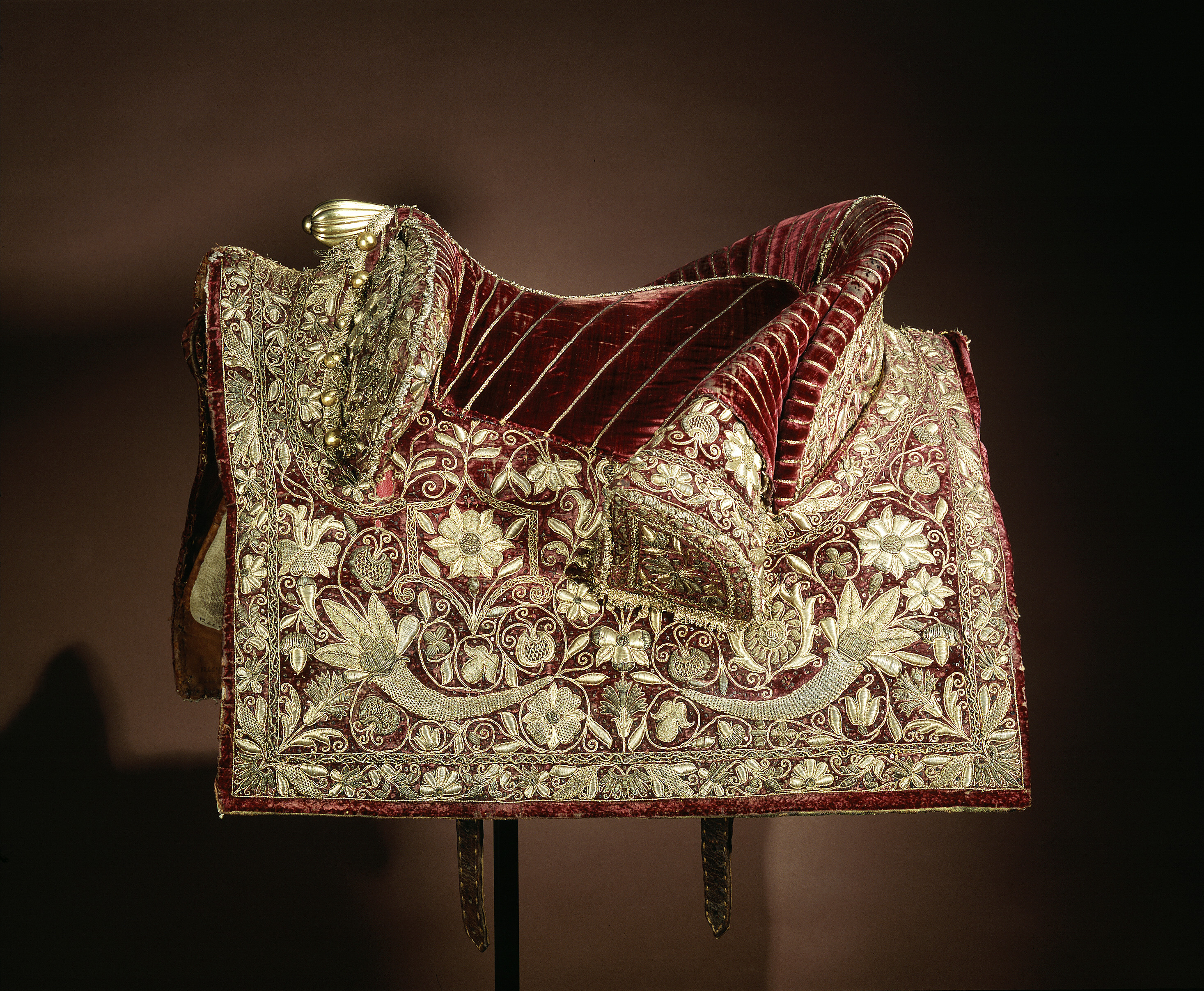 Överklädd med purpurröd sammet. Bakbommen med kraftiga stödbommar. Sätet nersytt med smala flätband i ett glest fiskbensmönster. De båda bommarnas insidor med vertikalt påsydda, sådana band. Bommarnas utsidor samt sadeltäcket har rika relief och läggsömsbroderier i guldtråd, stora blommor, ekollon, palmetter och ymnighetshorn. Utmed bommarnas utsidor fanns ursprungligen tännlikor av förgylld mässing, numera återstår endast 12 utmed den främre bommen. Framåtriktad, profilerad sadelknapp av förgylld mässing. Sadeltäcket fodrat med ljust läder. Sätets inre längd: 320 mm. Bakbommens höjd: 120 mm. Frambommens höjd: 75 mm. Stomme av trä, utsidan klädd med läder, insidan med näver. På stommens vardera sida finns två mörka läderstroppar och en krampa, för sadelgjord resp. stigläder. Stommen har framtill en läderhängare, överklädd med purpurröd sammet, baktill finns ett spänne för ryggstycket. På framvalvets vardera sida finns ett spänne för förbygeln. På framvalvets vardera sida finns en kort vit läderstropp med spänne, i vilka förbygeln kunde fastgöras. I stommens vardera nedre hörn finns två hål - för fastgörande av bossorna. Bossor, vilka fastspännes under stommen, är på insidan klädd med grov tuskaftsväv. Den del som är vänd mot stommen består av vitt skinn. Bossorna är kantade med brunt läder och stoppade med halm.