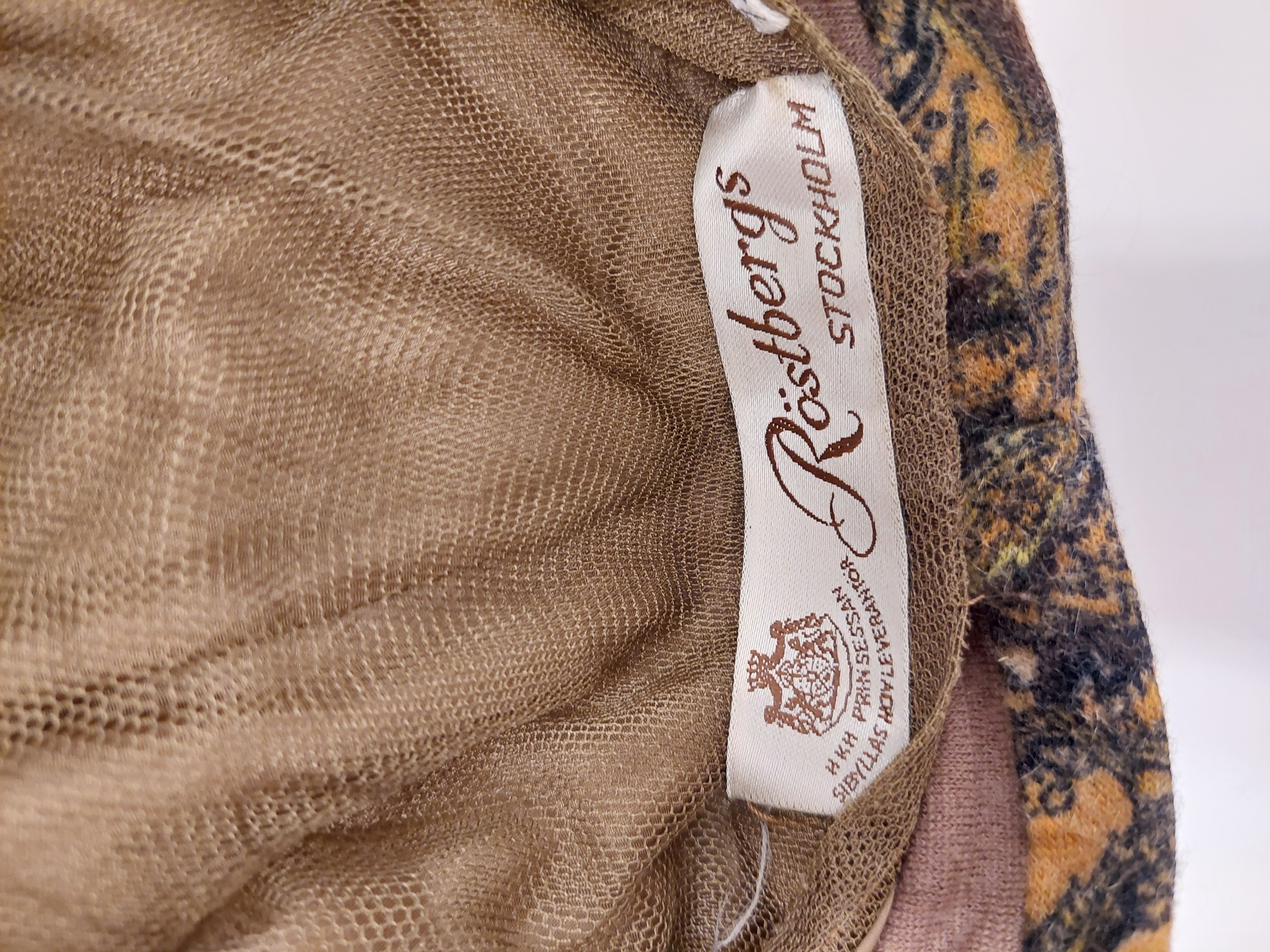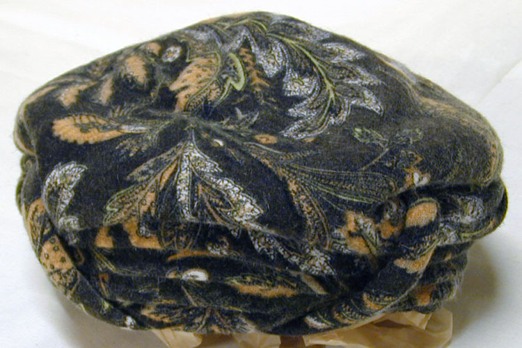 Hatt av turbanmodell i angorajersey, sydd på tyll. Brun botten, på den blommor och blad i orange, grönt och vitt. Sidorna är veckade. Hatten är sydd i ett stycke. Framsidan är vikt mot och över "taket" och har sytts fast i sidorna vilka sytts ihop baktill. Framtill går två "horn" från nederkanten snett utåt, upp till sömmen mellan tak och sidor. Fodrad med nougatfärgat ylletyg, samt dessutom i kullen nougatfärgad siden. Ytterst två lager brun tyll som ej fästs vid öronen då de veckade sidostyckena skall gå att dra ned. Innanför kanten fram en skärm av hattens tyg som styvats för att ge hatten stadga fram. Baktill etikett med tillverkarens namn: "HKH PRINSESSAN // SIBYLLAS HOVLEVERANTÖR // Röstbergs // STOCKHOLM". Datering: 1971-03-26.
