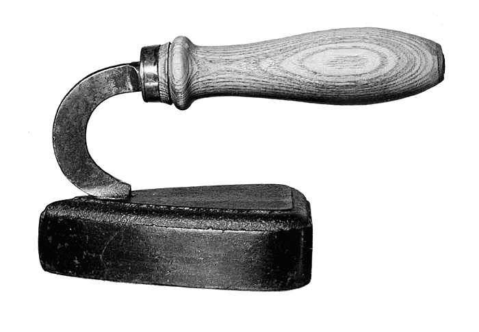 STRYKJÄRN (s.k. plisserings-). Av järn, gjutet. Massivt, platt, hjärtformigt samt med handtag, kring övre kanten en ingripen stav. Handtag i form av en bakåtböjd båge med ett långsträckt päronformigt, svarvat träskaft av ask. Höjd: 10,3 cm. Längd: 11,2 cm, bredd: 7,2 cm, tjocklek: 3,1 cm. Överförd av Wilhelmina von Hallwyl 1916 från säteriet Ericslund till Hallwylska huset, Stockholm.