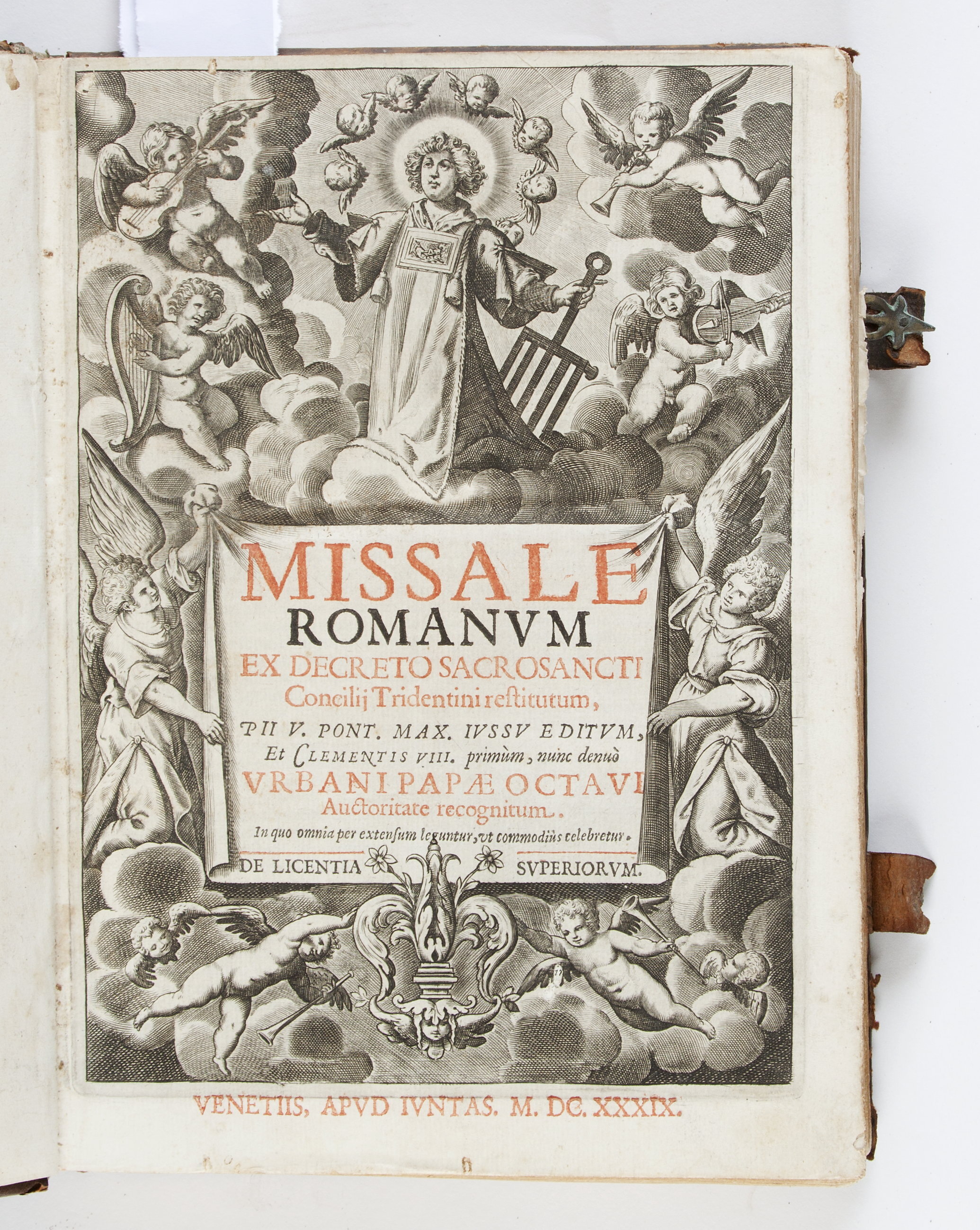 Missale romanvm ex decreto sacrosancti Concilij Tridentini restitutum, Pii V. pont. max. ivssv editvm... nunc denuo Urbani papæ octavi auctoritate recognitum... Venetiis, apvd Ivntas. MDCXXXIX.