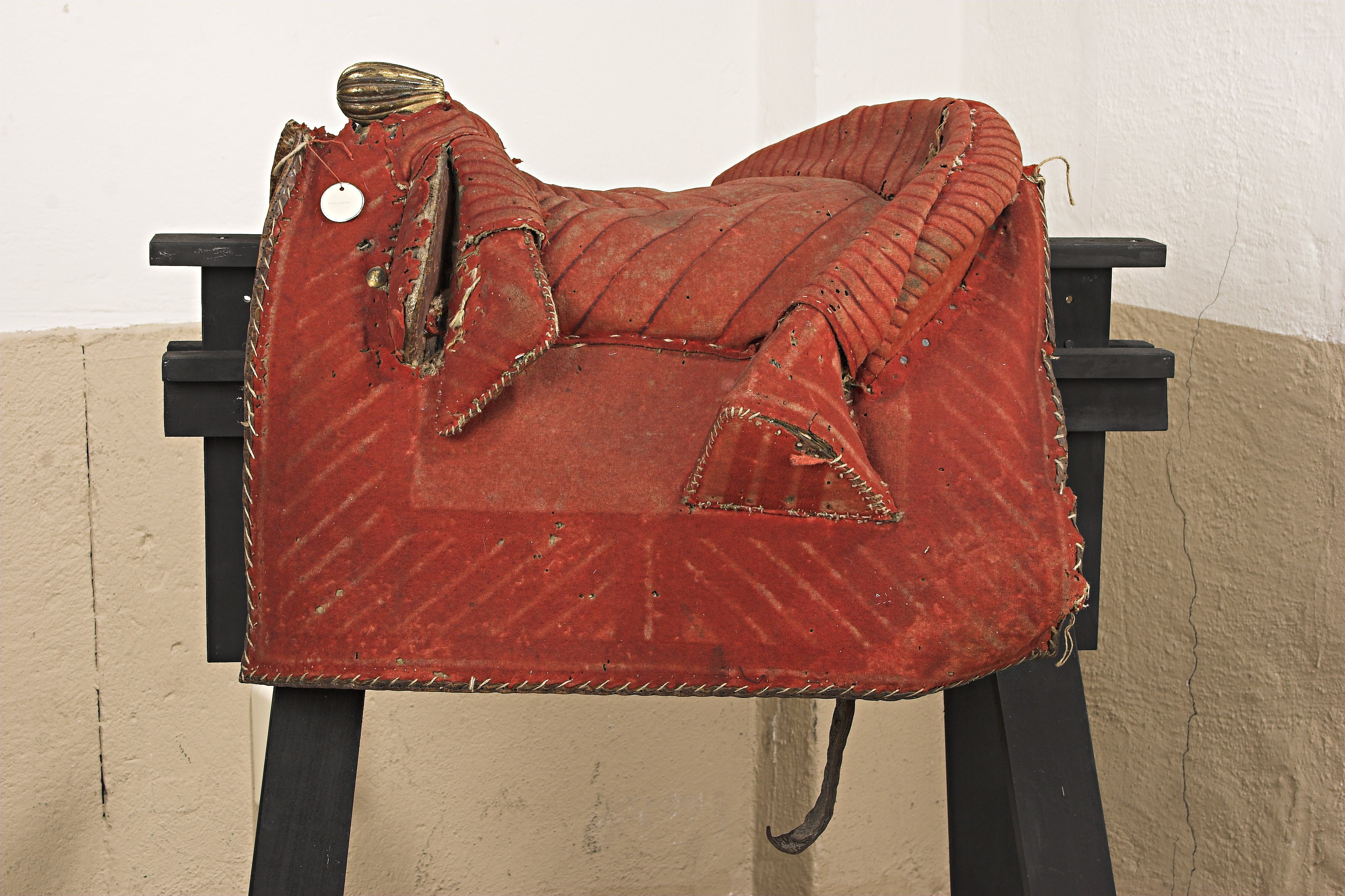 Bomsadel helt av rött kläde. Sitsen och bommarnas insidor med spår av stickningar med numera bortfallet garn. Rektangulära kappor kantade och fodrade med brunt läder. Tvådelad frambom ca 400 mm bred, ca 60 mm hög. Bakbom med stödbommar, 550 mm bred,100 mm hög. Sadelknapp av förgylld mässing, framtill rundad, räfflad. Framför frambommen på var sida en tennlicka av förgylld mässing. Bommen överklädd med väv. Fyra sadelgjordsstroppar av brunt läder. Två söljor för förbygeln, två byglar förstigläder.