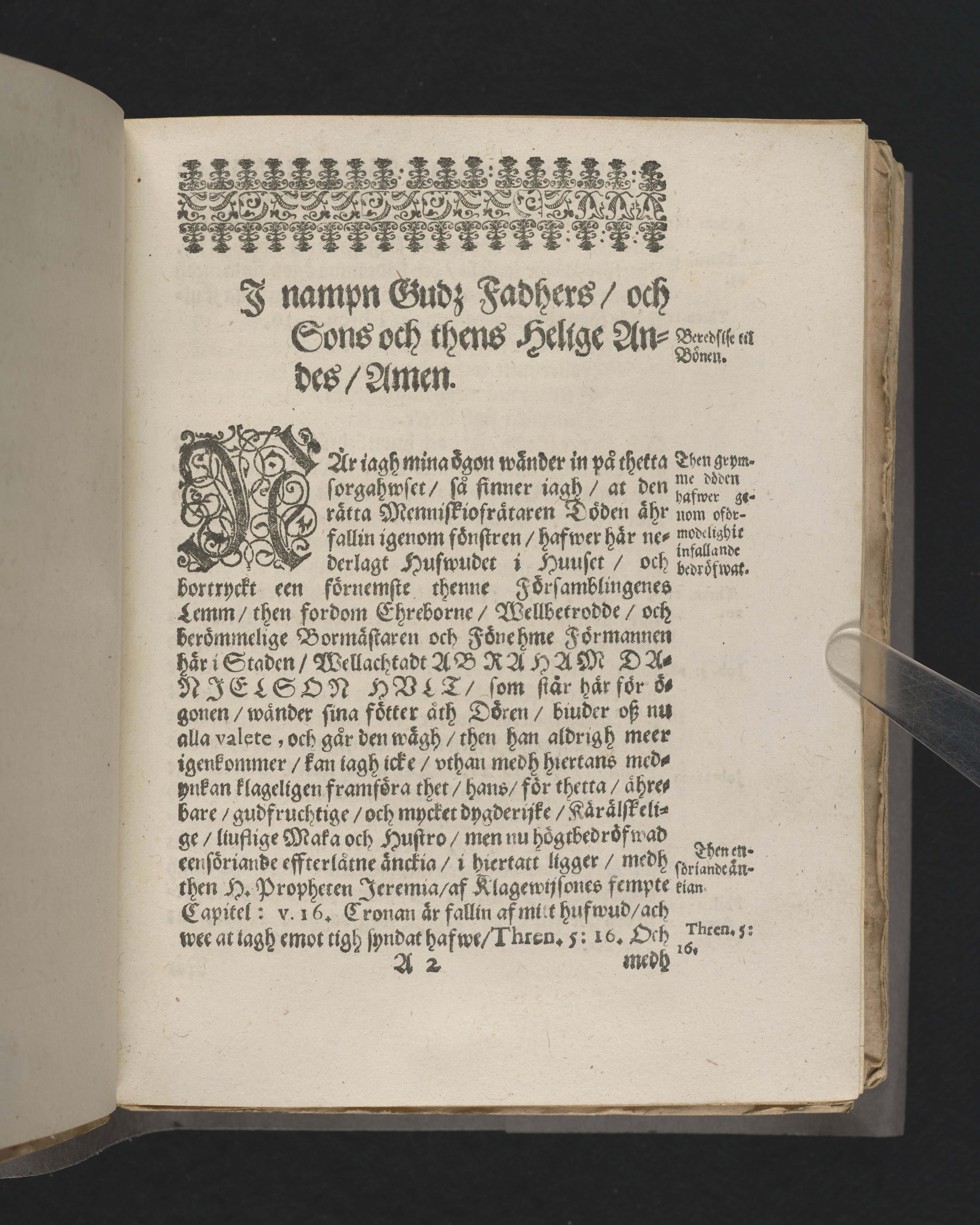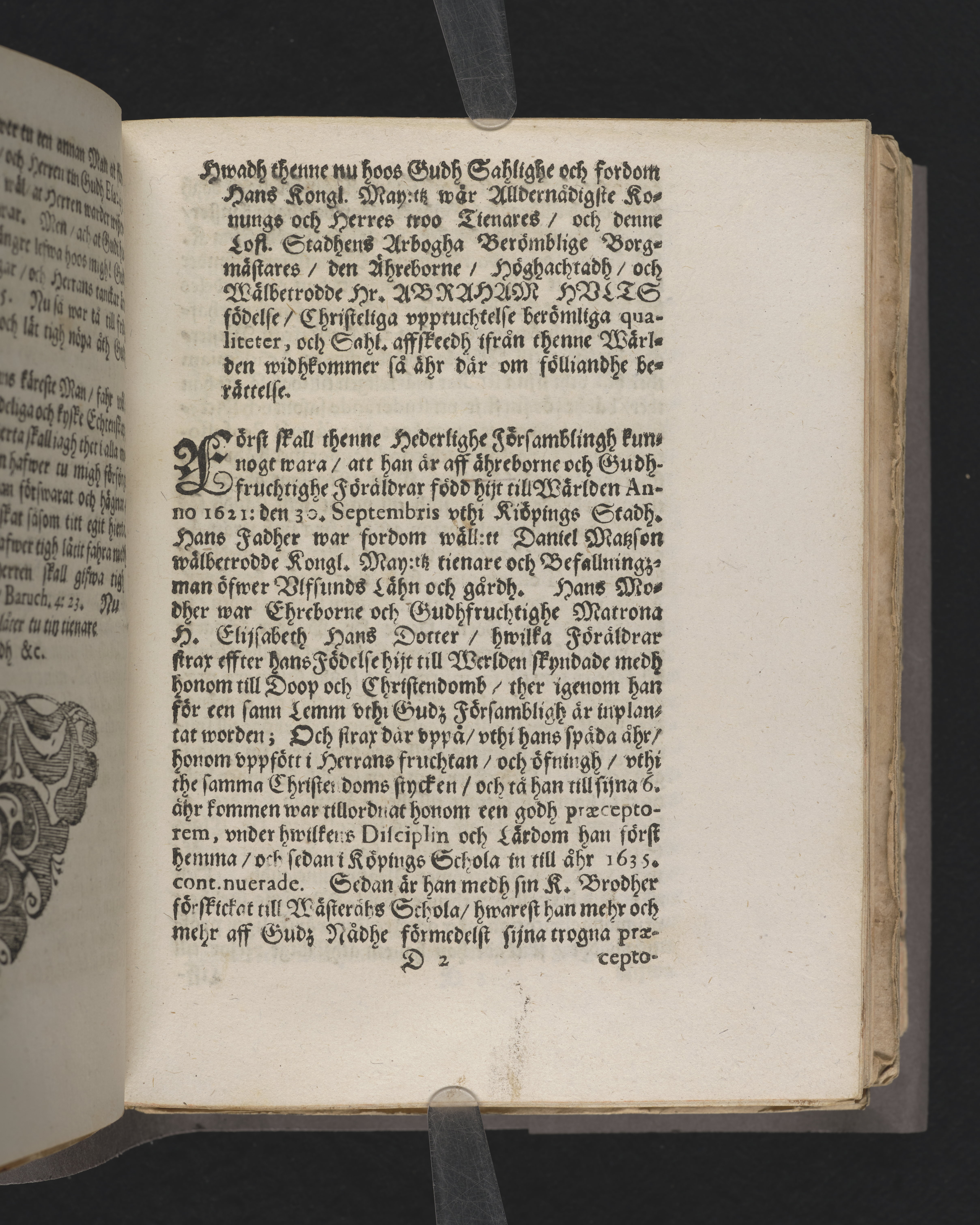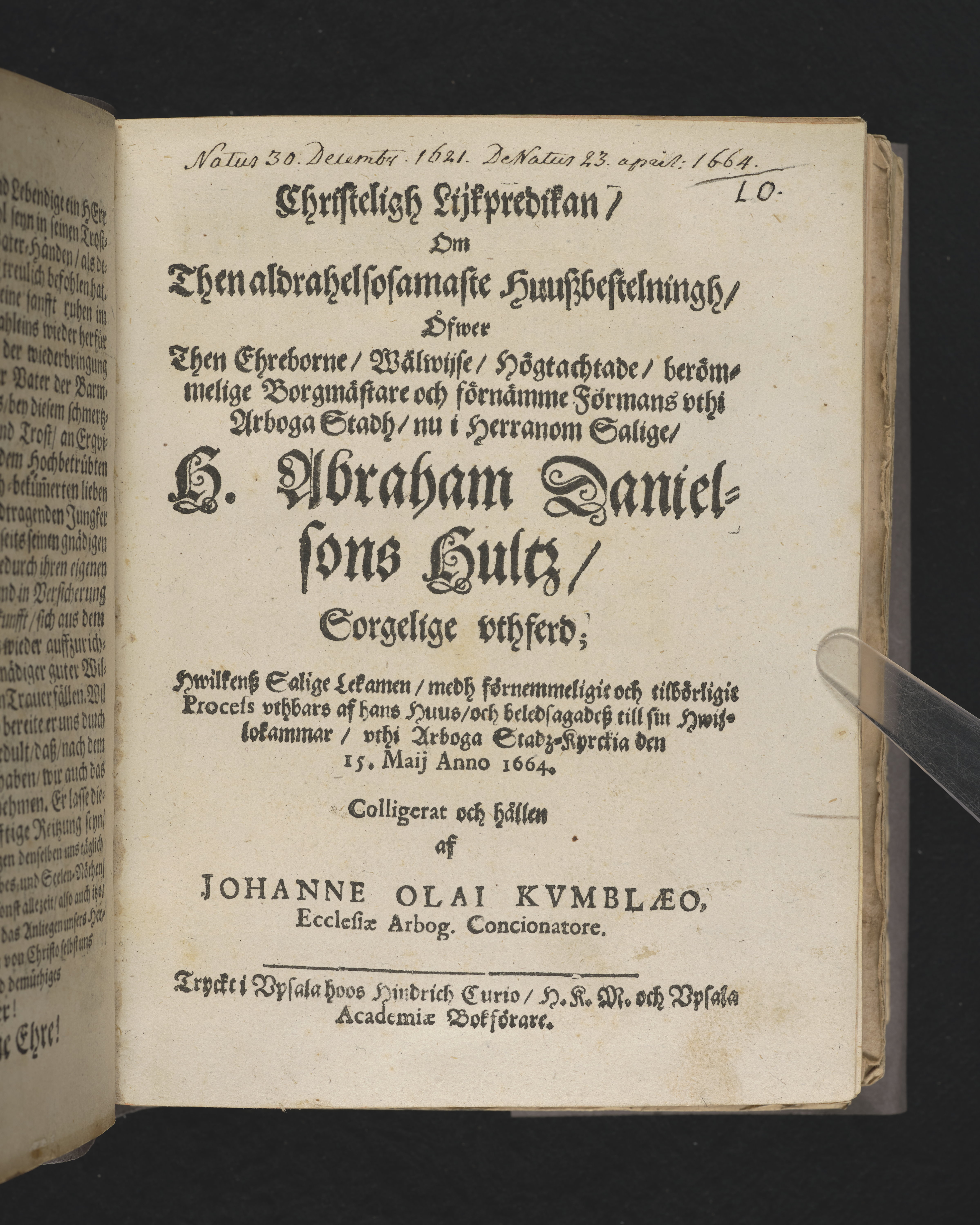 Christeligh lijkpredikan, om then aldrahelsosamaste Huuszbestelningh, öfwer then ... berömmelige borgmästare ... vthi Arboga stadh, nu i Herranim salige, H. Abraham Danielsons Hultz, sorgelige vthferd ... vthi Arboga Stadz-kyrckia den 15 maij anno 1664. Colligerat och hållen aff Johanne Olai Kvmblæo ... Tryckt i Upsala hoos Hindrich Curio ...